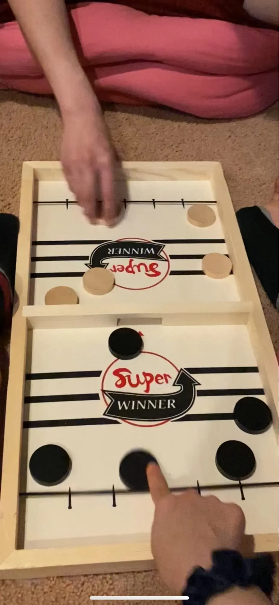 2. Start the game and place five pucks on each side of the board. Slide both ends of the elastic band into the side grooves so that they snap into place. The two players applauded the "High Ten" style to start the game.