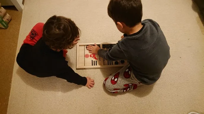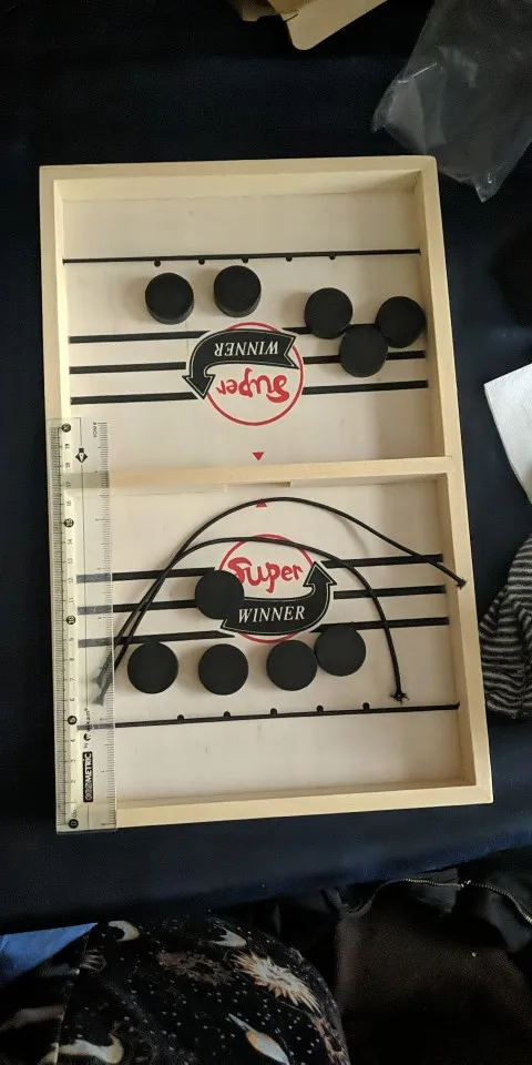 3. The player uses an elastic band to launch the puck from the door until there is no puck next to it. Players don't turn, they just refill and shoot as fast as possible. Whoever clears the board first wins.