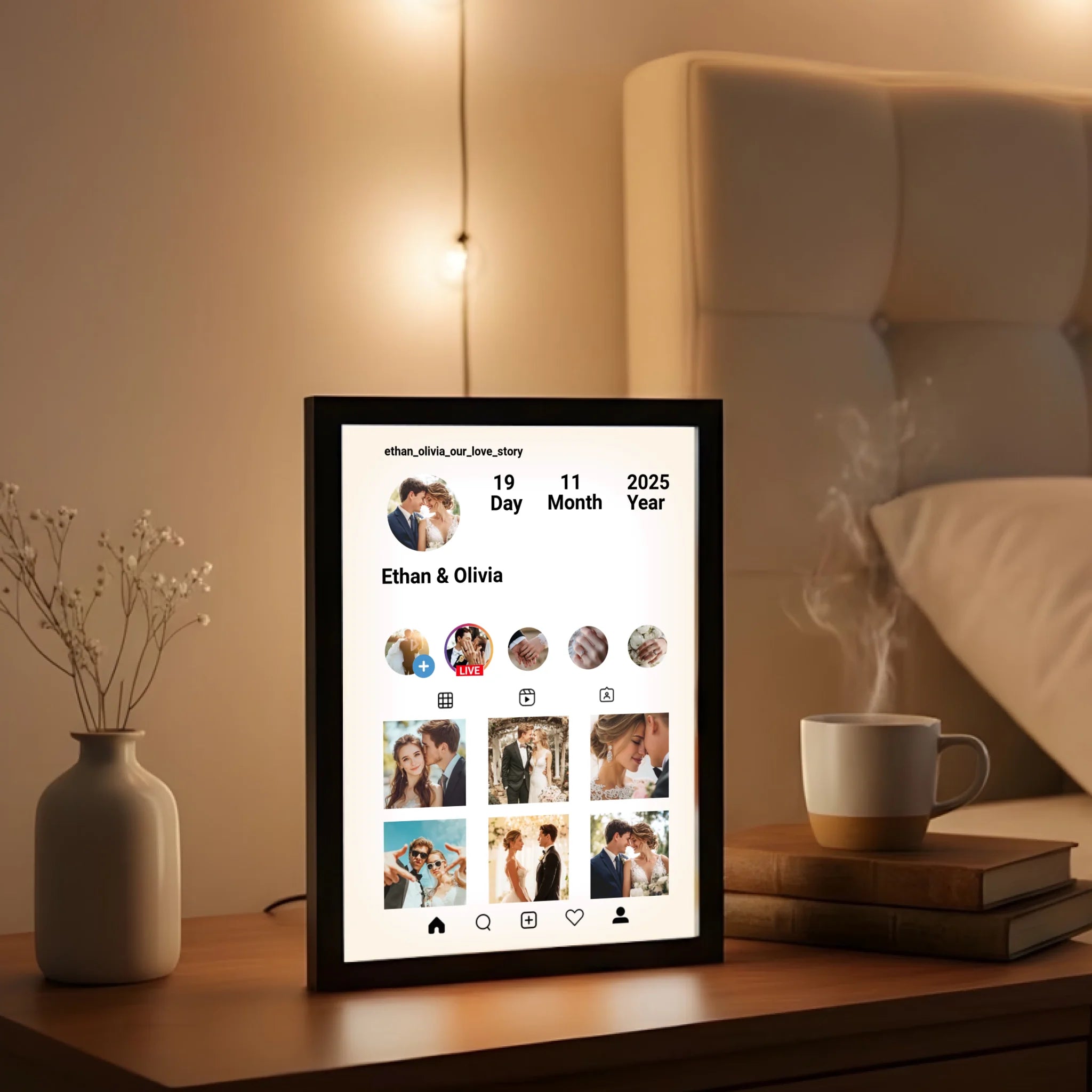 Designed to mimic a real social media profile layout, this custom LED frame allows you to showcase your names, anniversary dates, profile-style layout, and your favorite photos in a fun, modern, and eye-catching way.