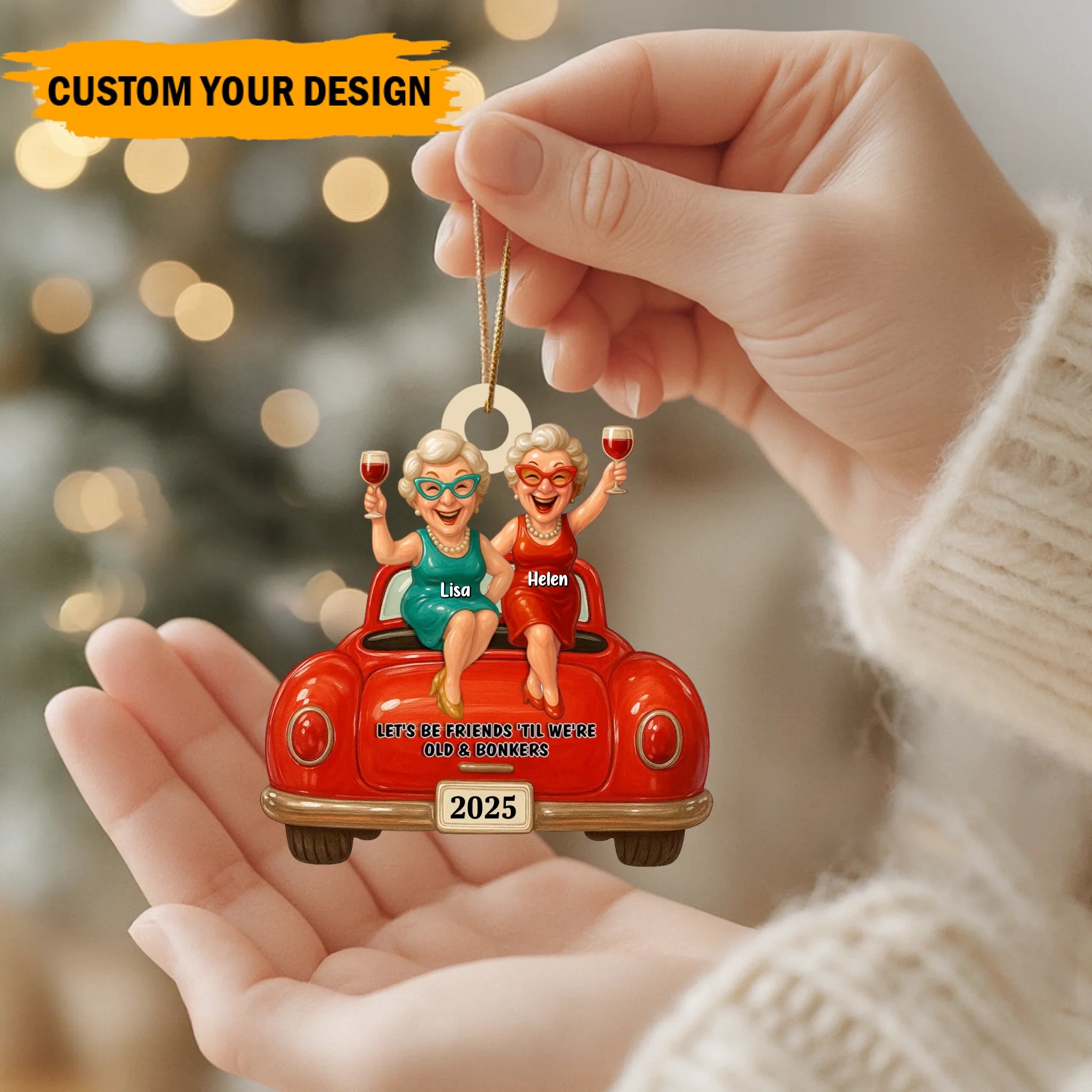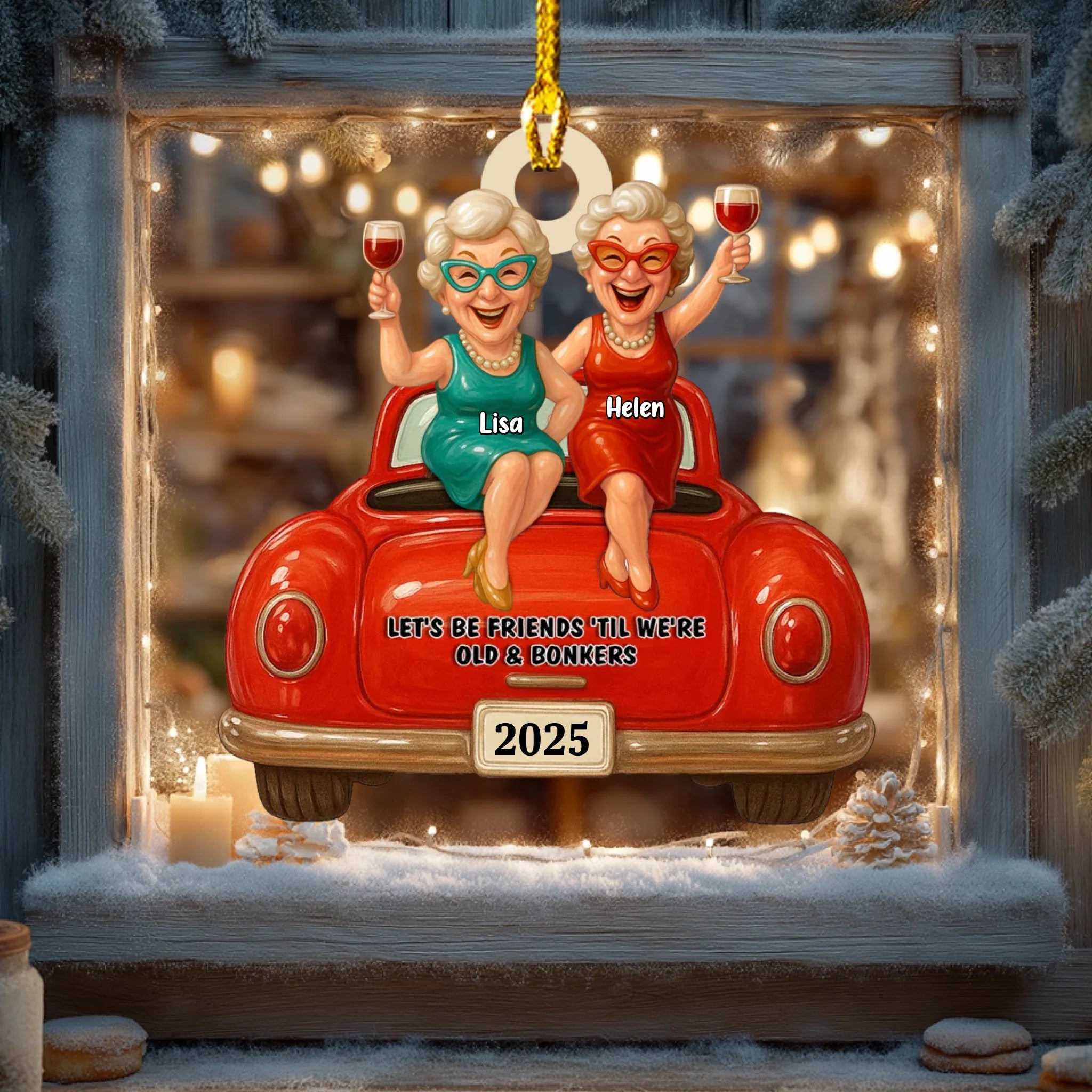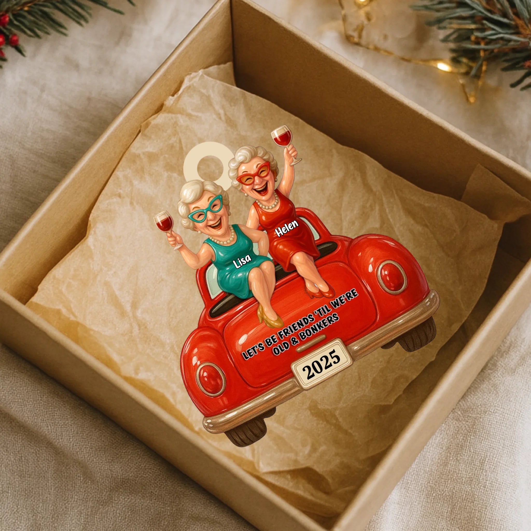 Christmas ornament with two women in a red car, holding drinks, with text 'Let's be friends til we're old & bonkers 2025' against a Christmas tree background.