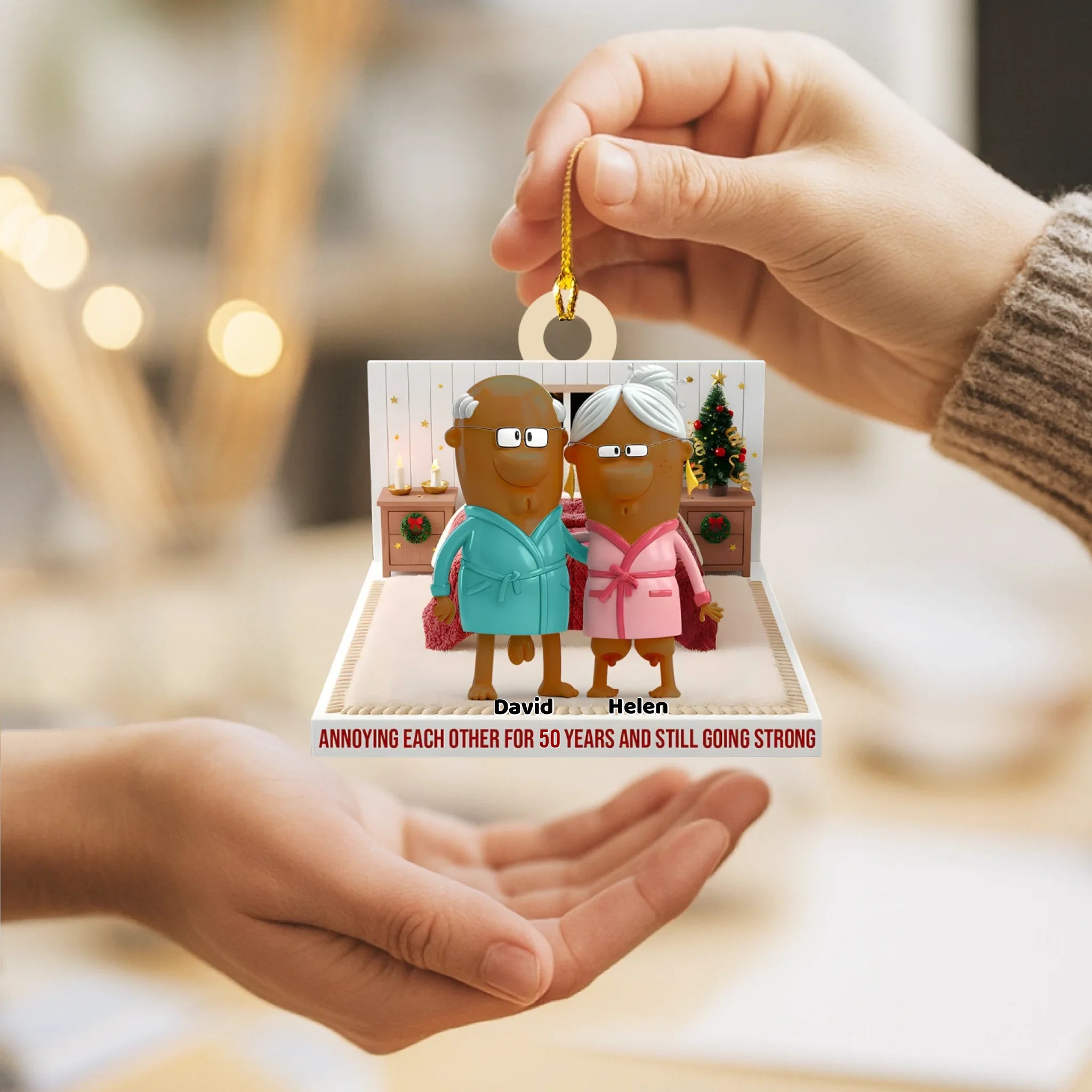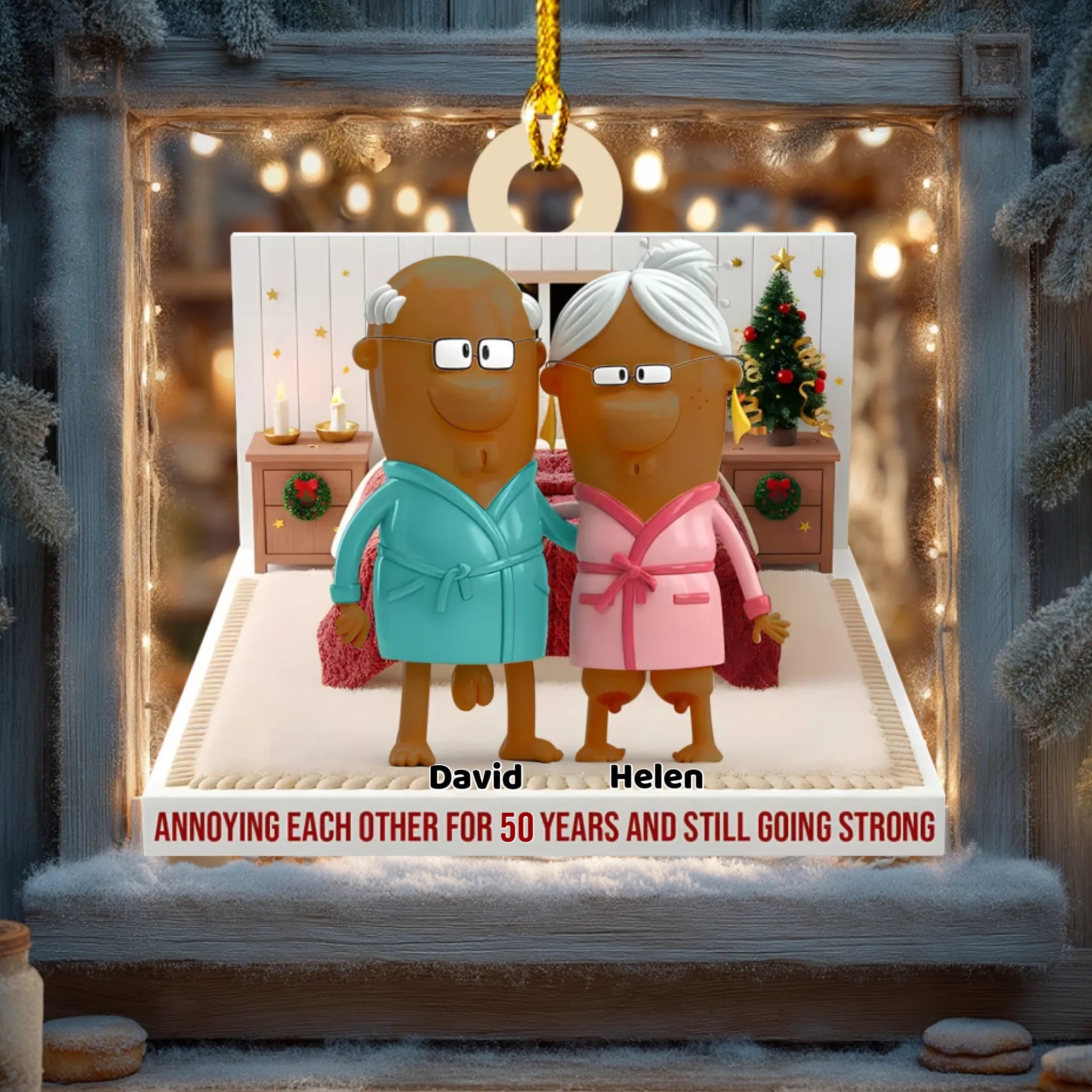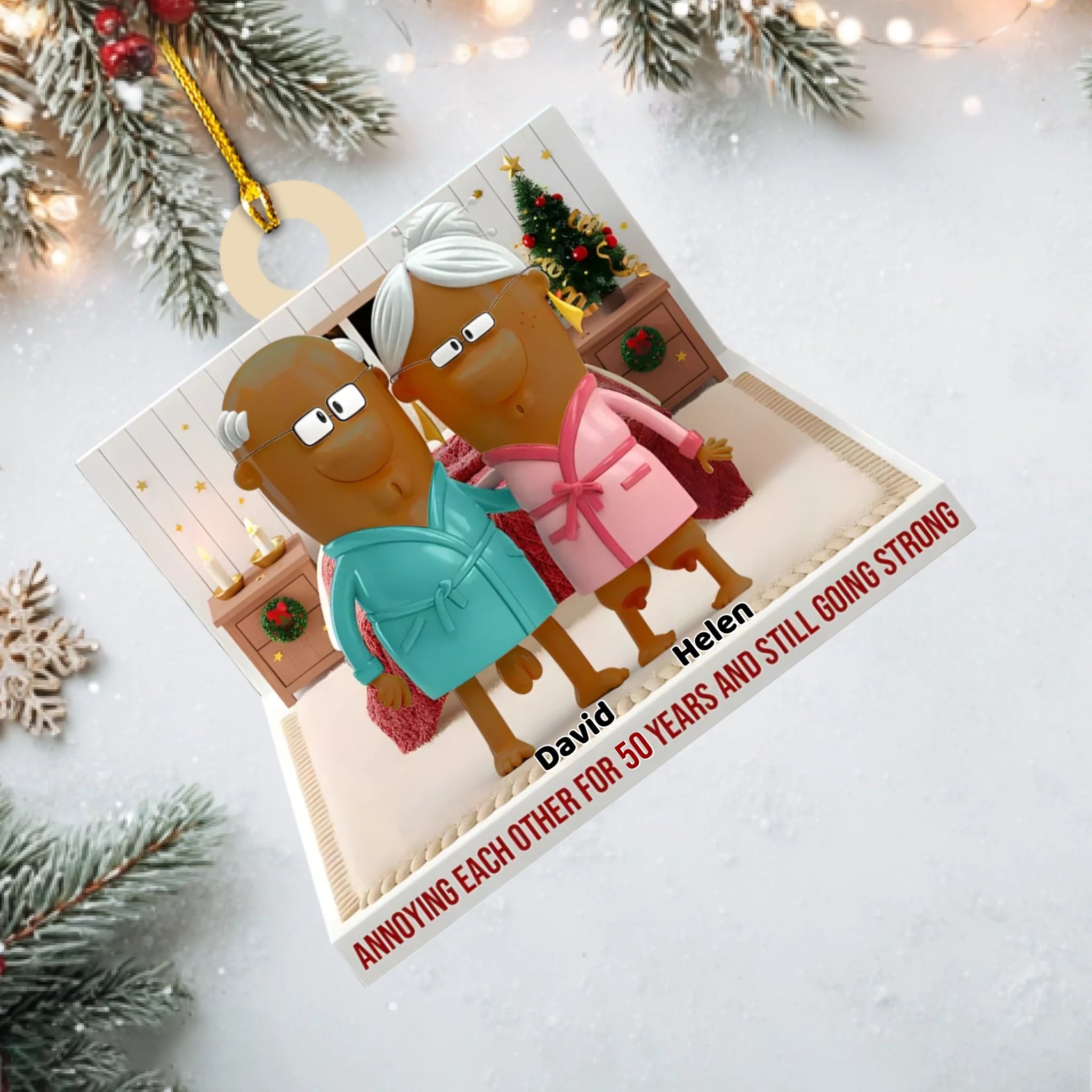 Decorative ornament with cartoon characters in bathrobes and text 'Annoying each other for 50 years and still going strong' against a festive background.