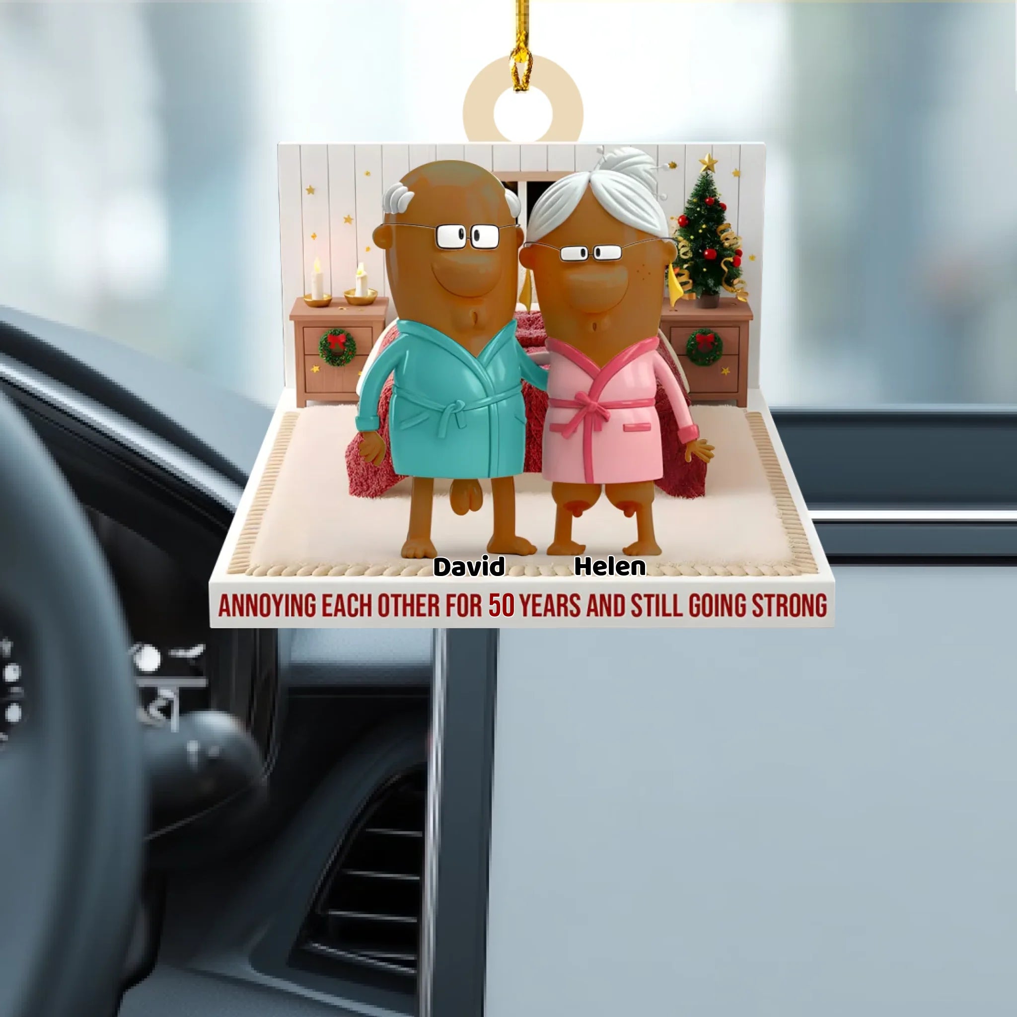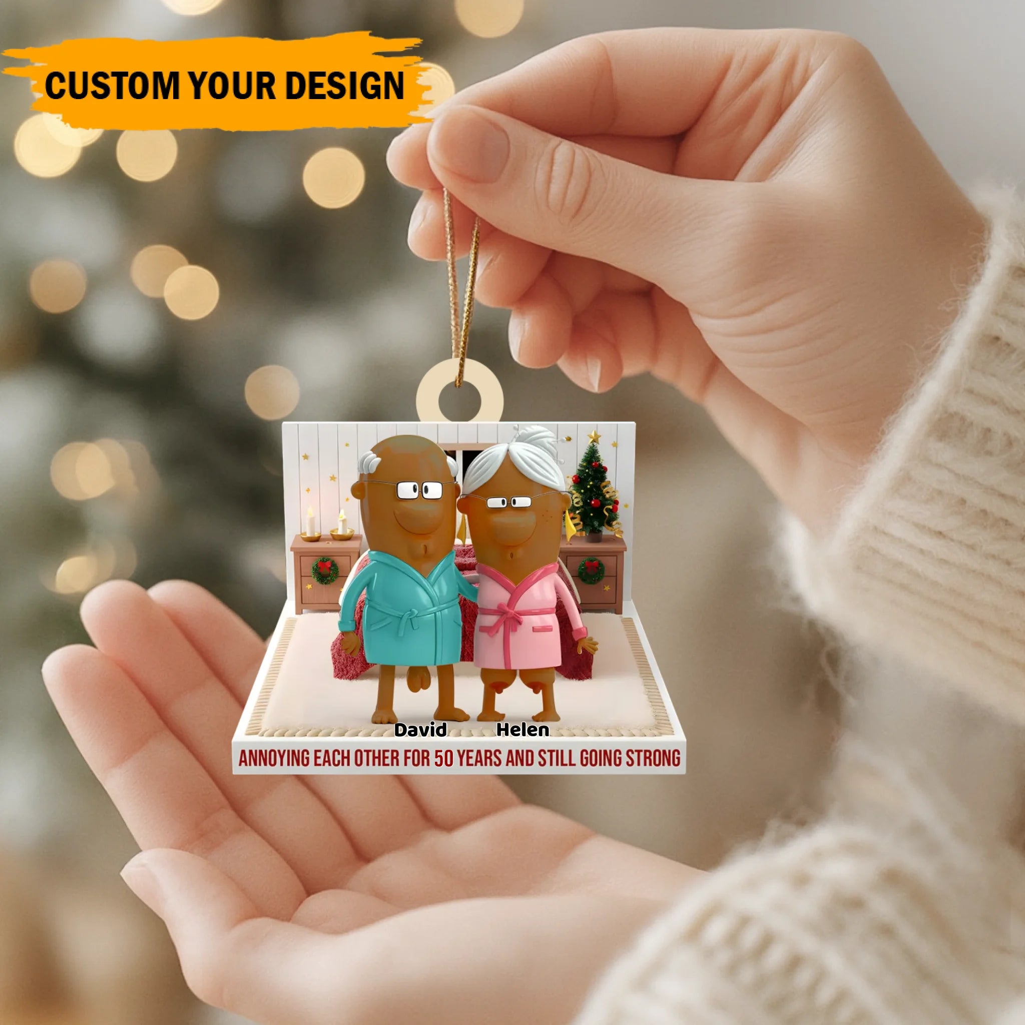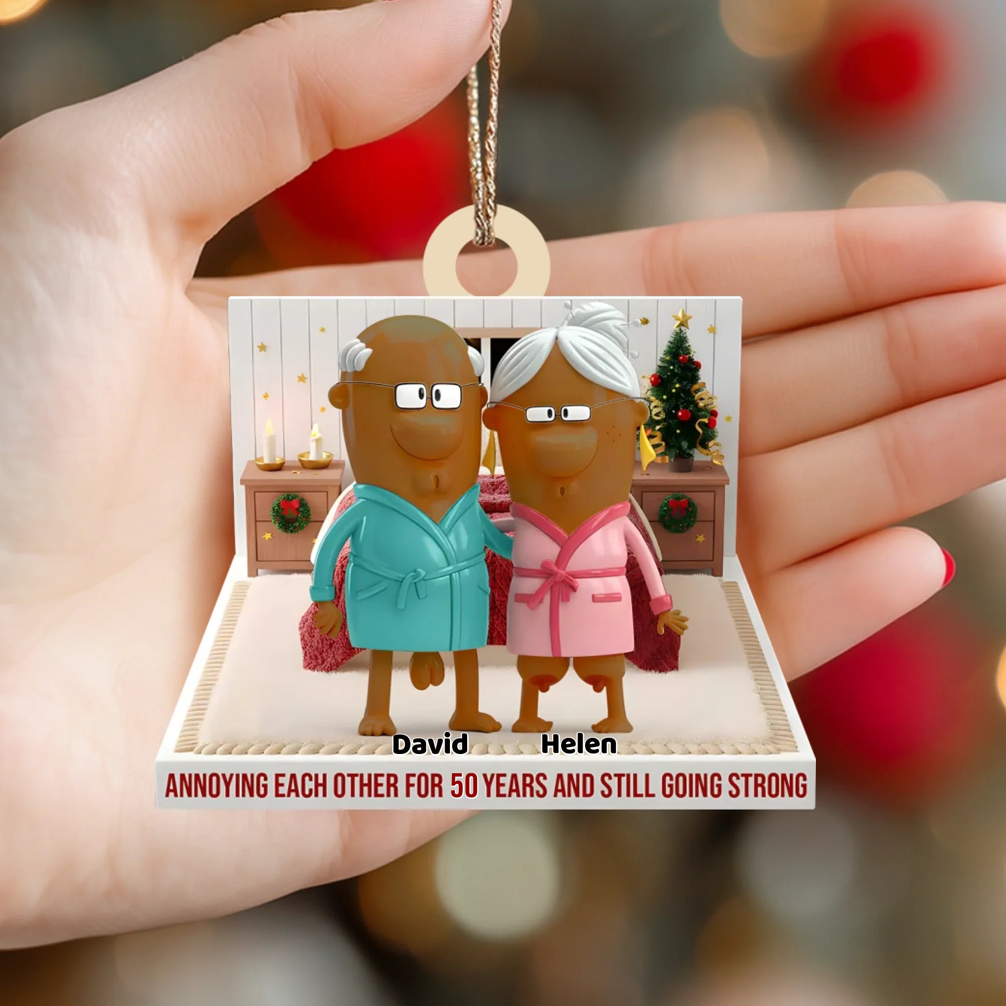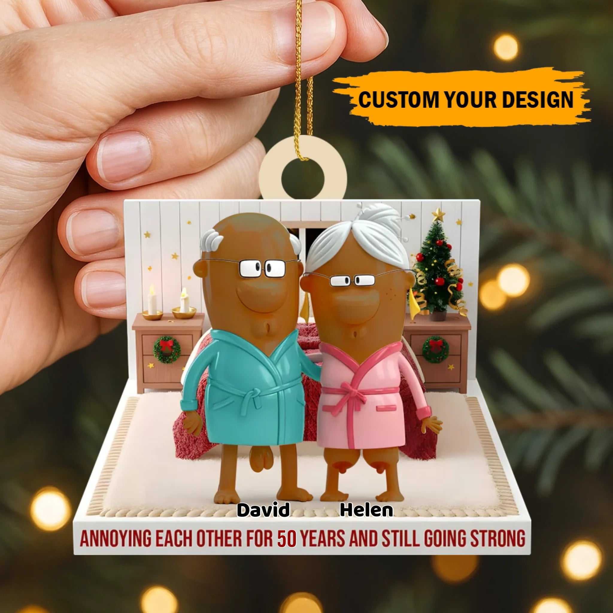 Decorative ornament with cartoon characters in bathrobes and text 'Annoying each other for 50 years and still going strong' against a festive background.