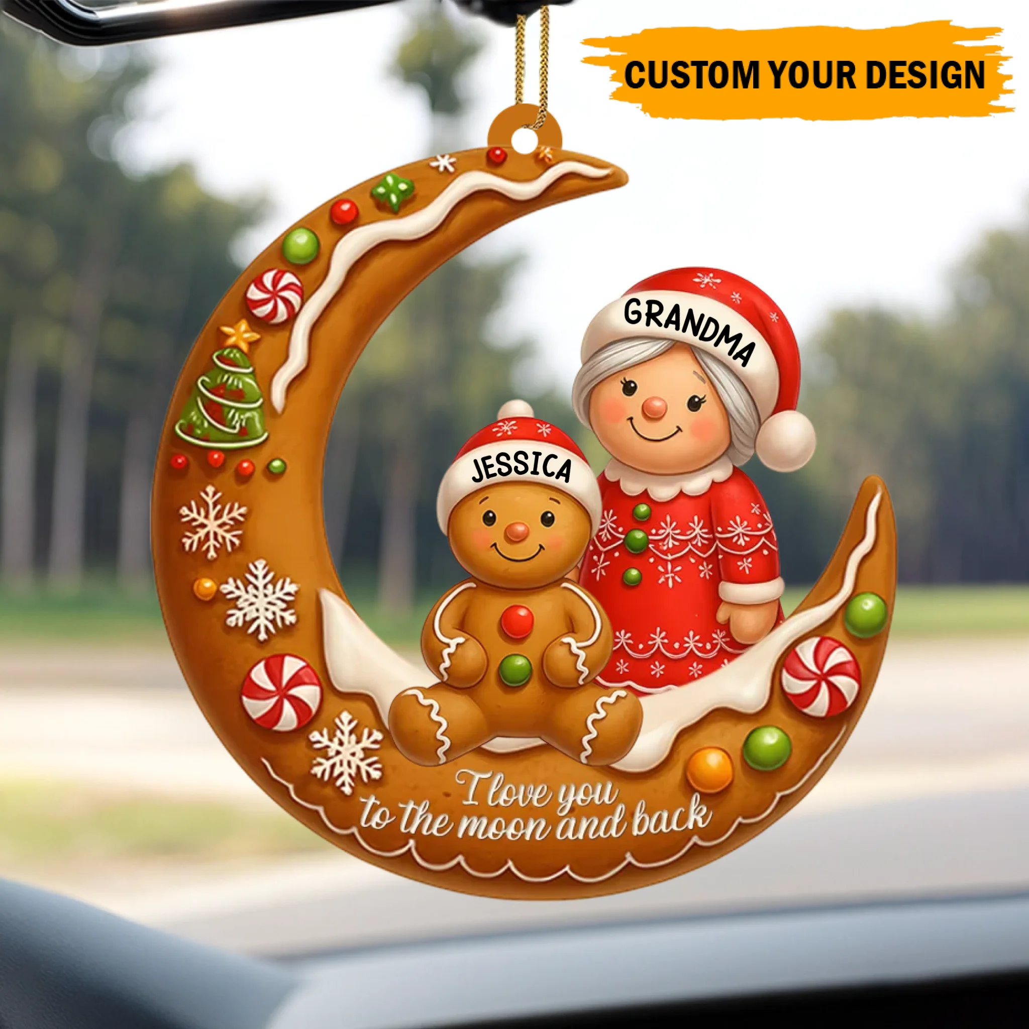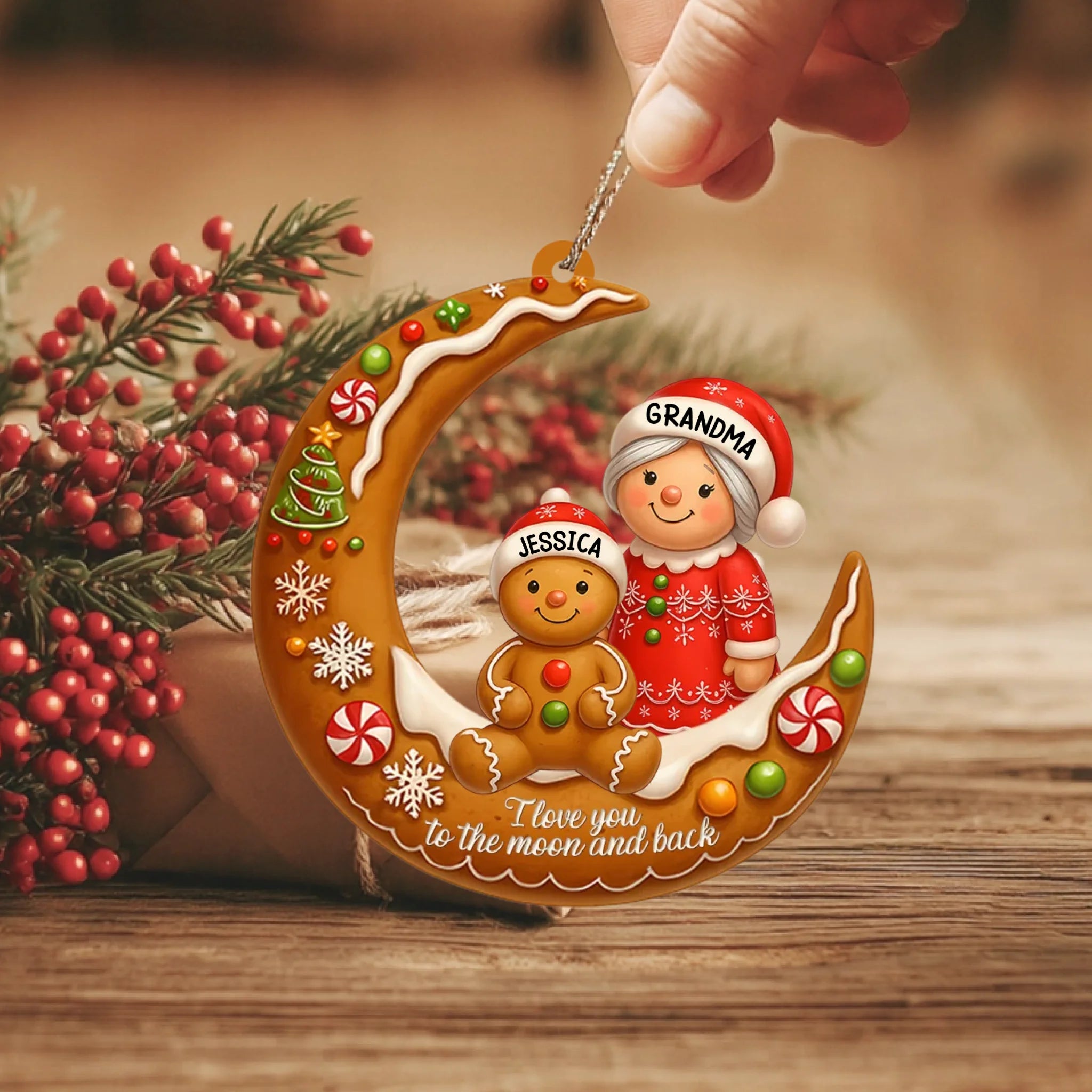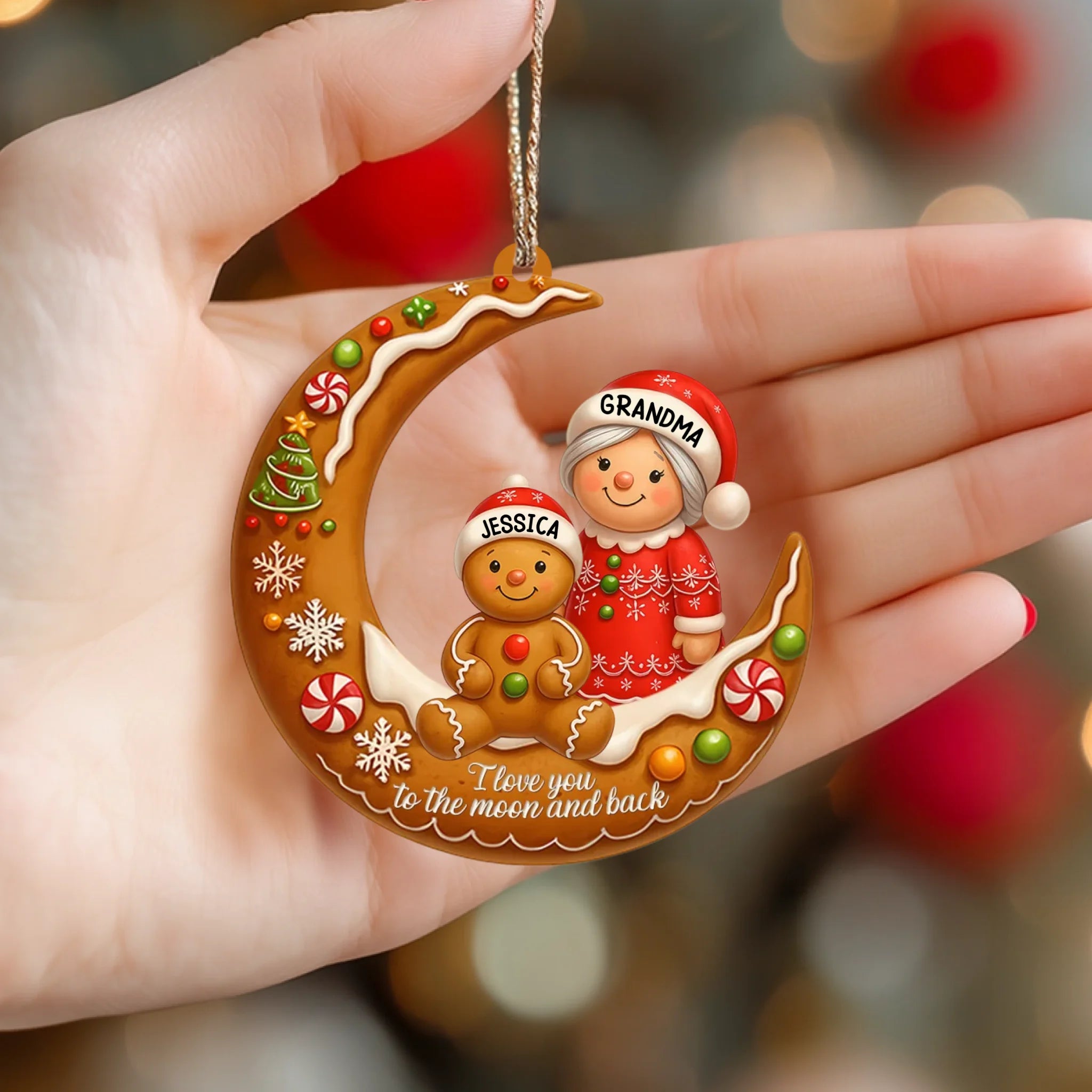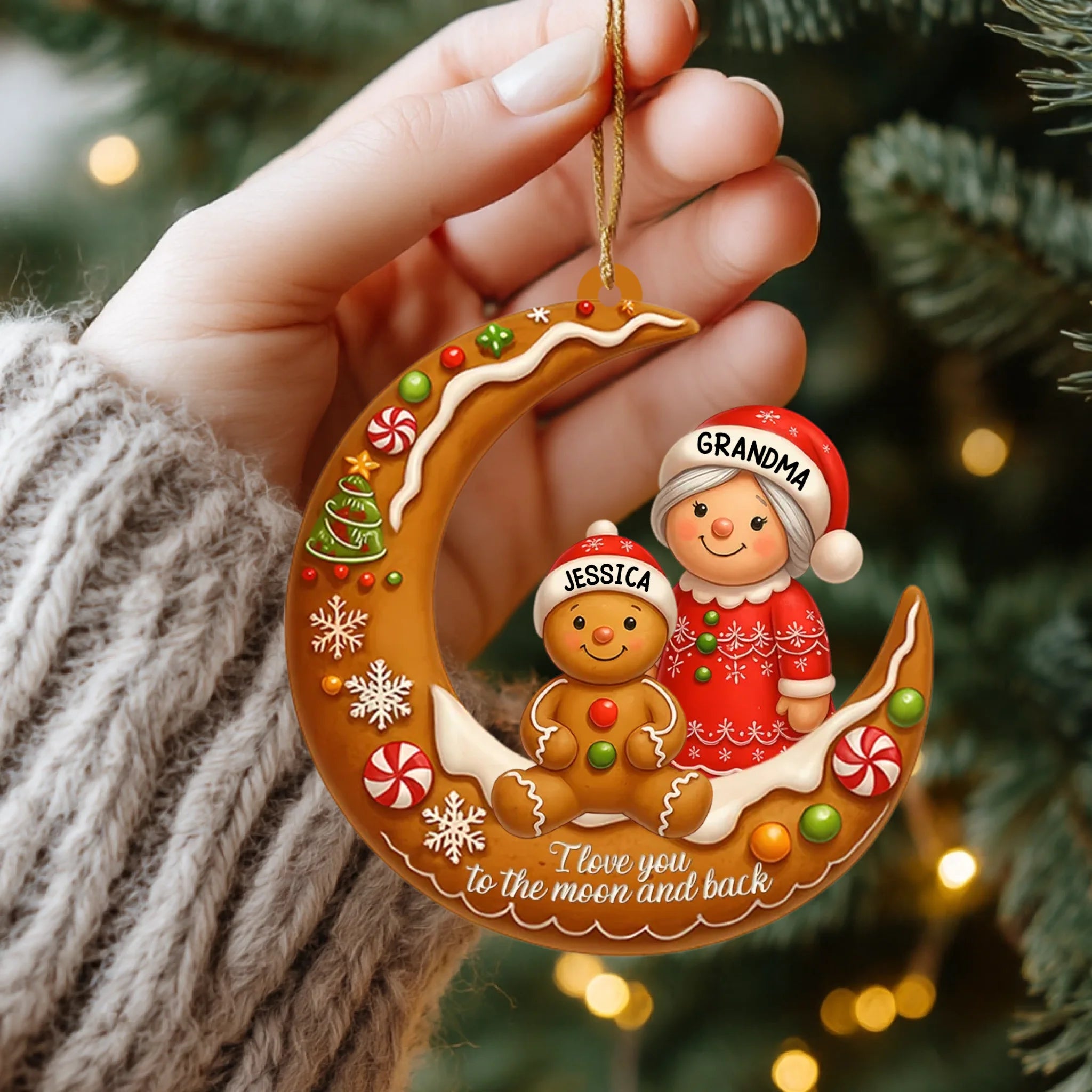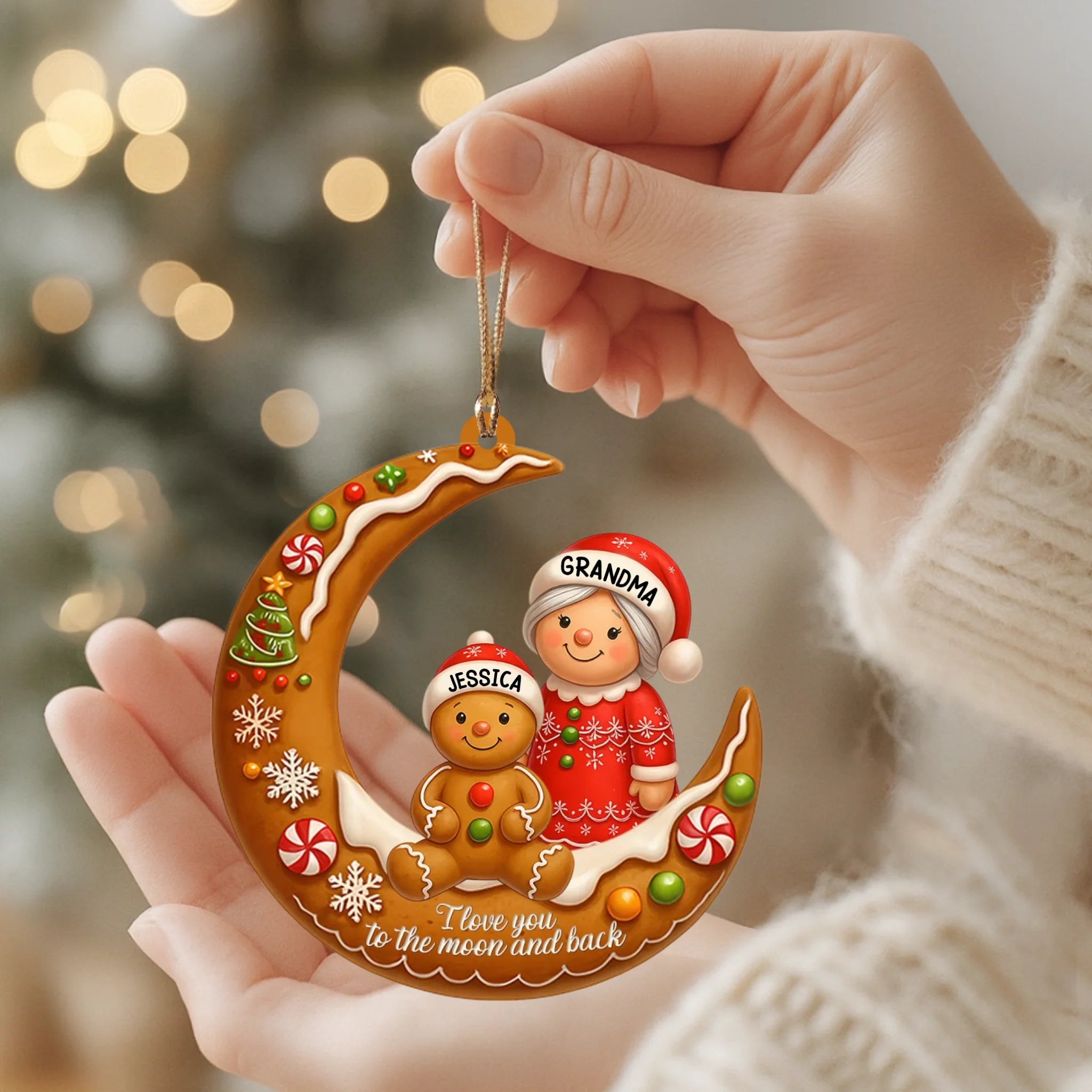 Decorative Christmas ornament with a moon design, gingerbread man, and woman labeled 'Grandma' and 'Jessica'.