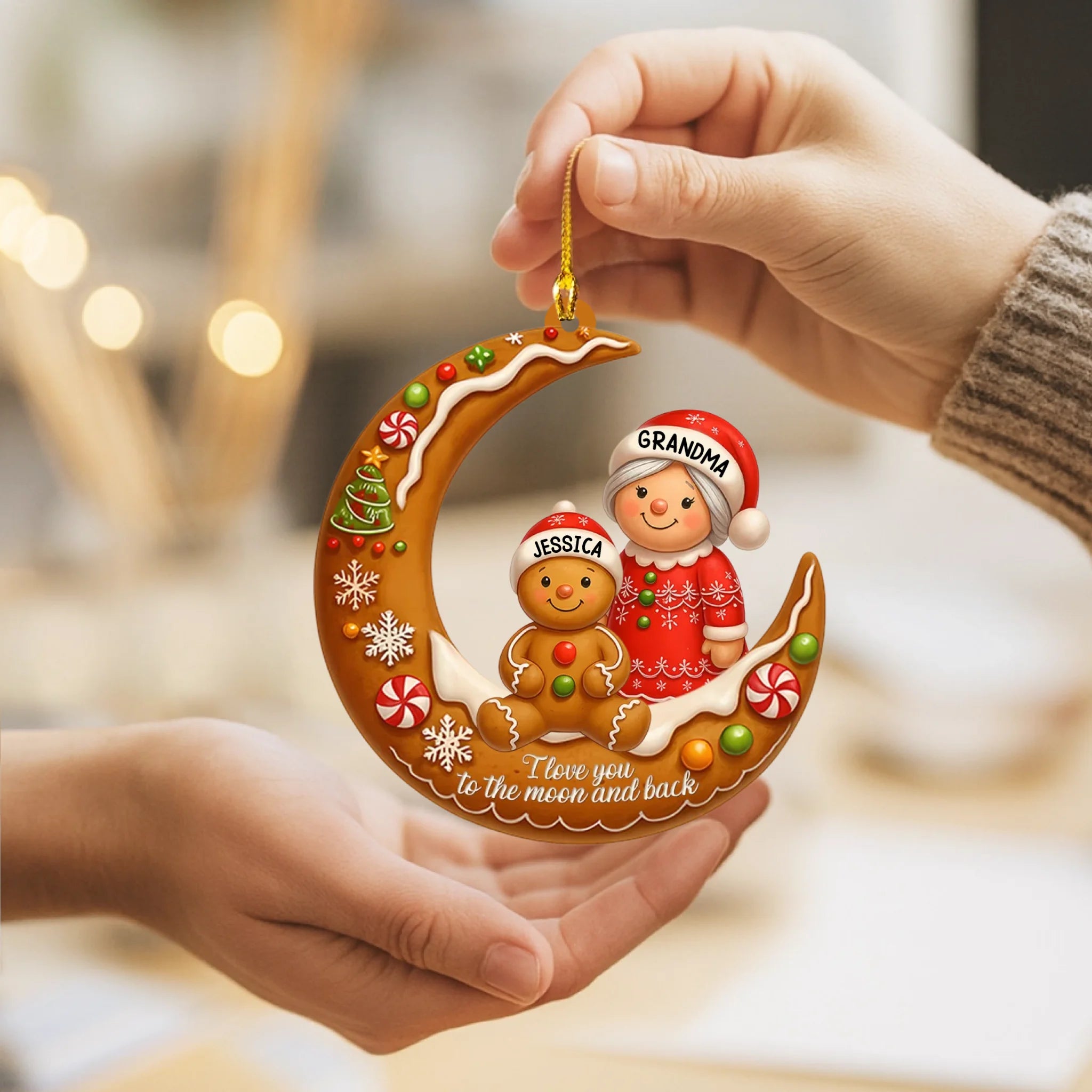 Decorative Christmas ornament shaped like a crescent moon with gingerbread figures, held by a hand against a blurred festive background.
