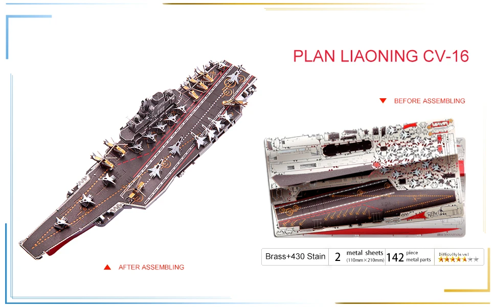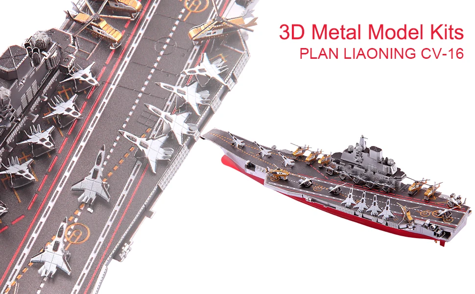 El modelo de ensamblaje de metal 3D Liaoning CV-16 simula un portaaviones chino Tipo 001. El primer portaaviones comisionado en la Fuerza de Superficie de la Armada del Ejército Popular de Liberación, originalmente fue clasificado como un buque escuela, destinado a permitir a la Armada experimentar, entrenar y familiarizarse con las operaciones de los portaaviones.