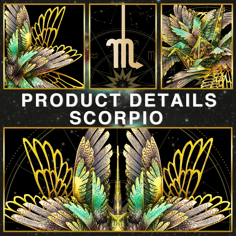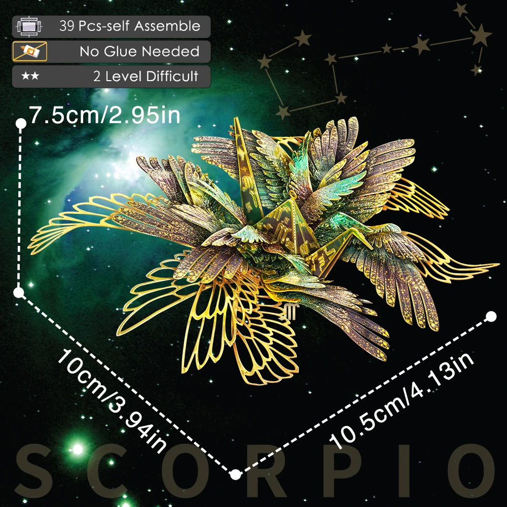 El modelo de montaje metálico 3D de Escorpio simula el signo de Escorpio. Es el octavo signo astrológico del Zodíaco, situado entre los 210 y 240 grados de longitud celeste. Es uno de los cuatro signos Fijos y uno de los tres signos del elemento Agua. Por lo general, las personas de este signo transitan por el Sol durante el período del 23 de octubre al 21 de noviembre de cada año conocido como Escorpio.