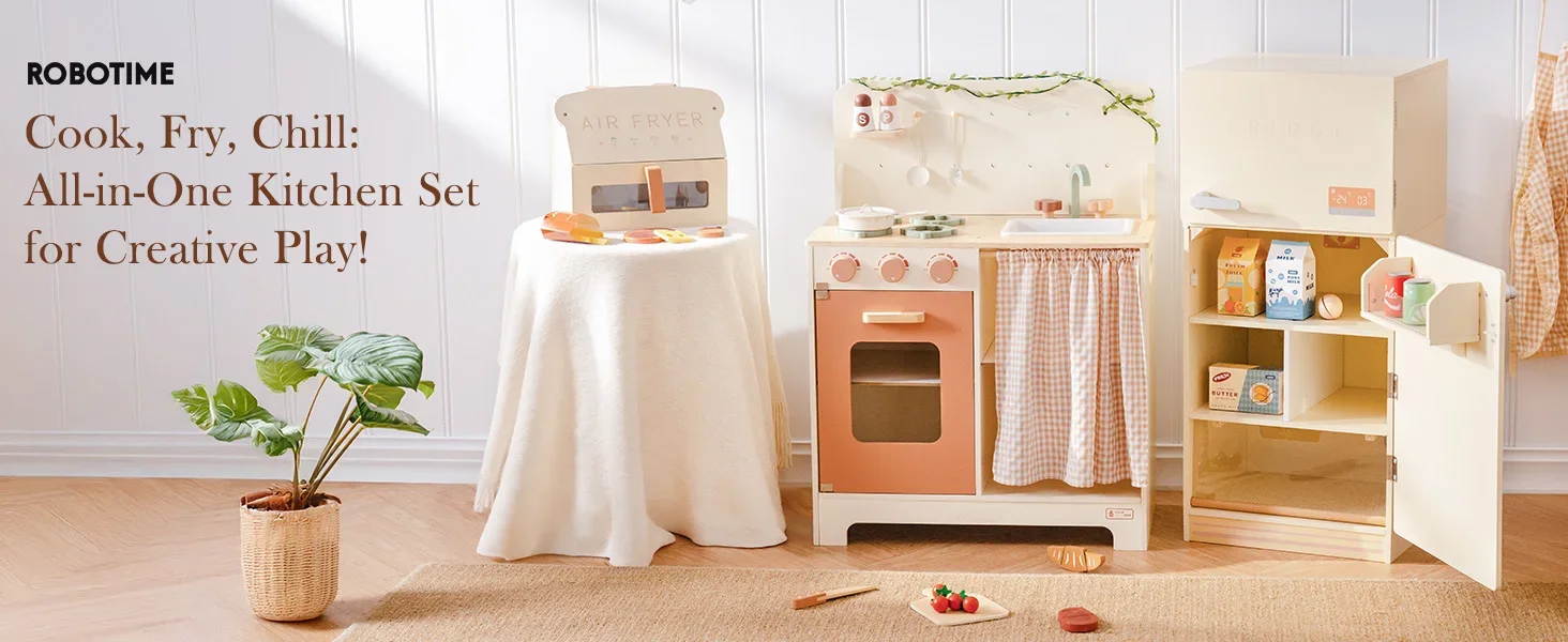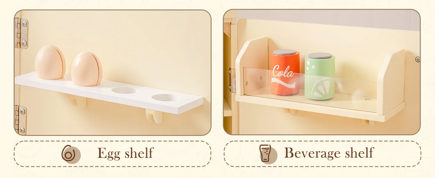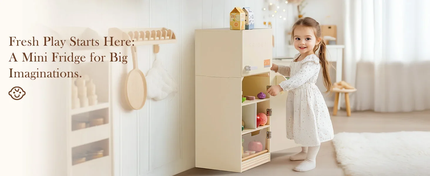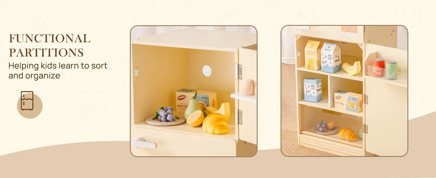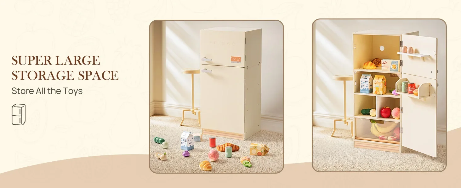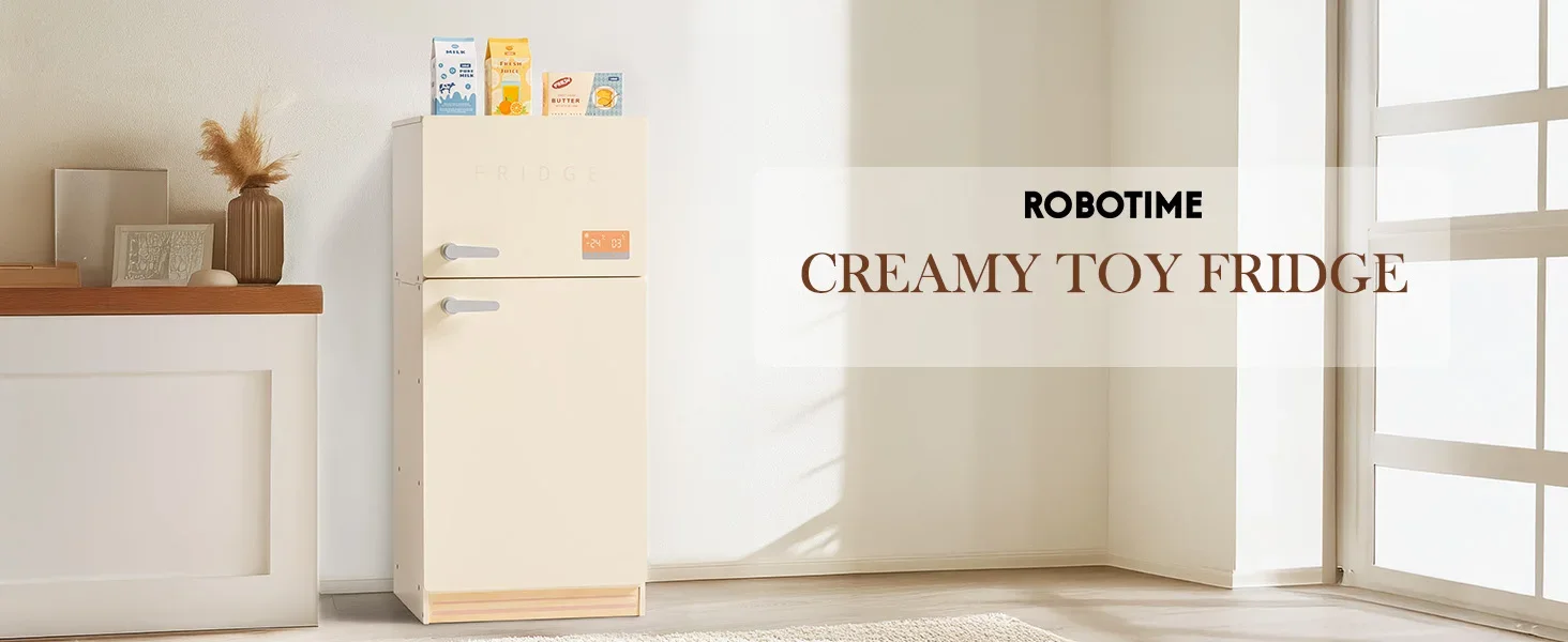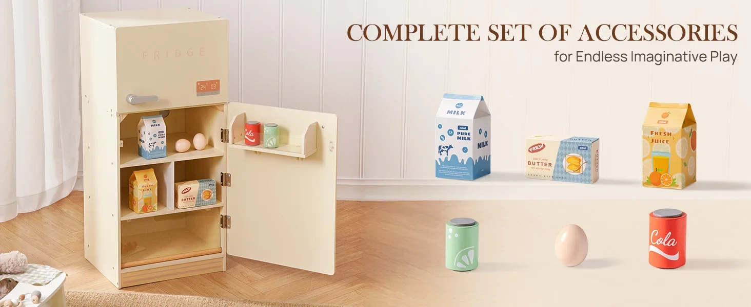 Robud Wooden Toy Fridge Refrigerator Play kitchen Set With Accessories – Interactive Kitchen Playset for Kids, Solid Wood & MDF (Creamy White)