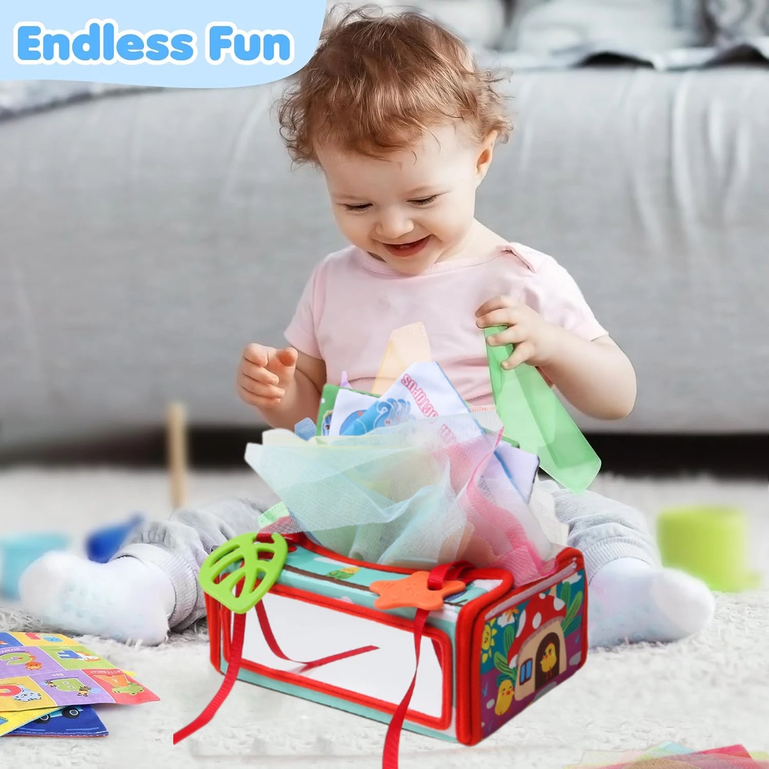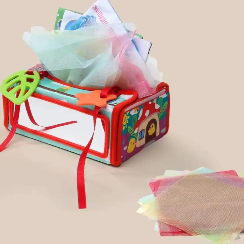 Tissue Box Sensory Montessori Toy with Mirror, 6 in 1 Baby Toy 0-6-12 Months Newborn Toddler with Colourful Silk Cloths