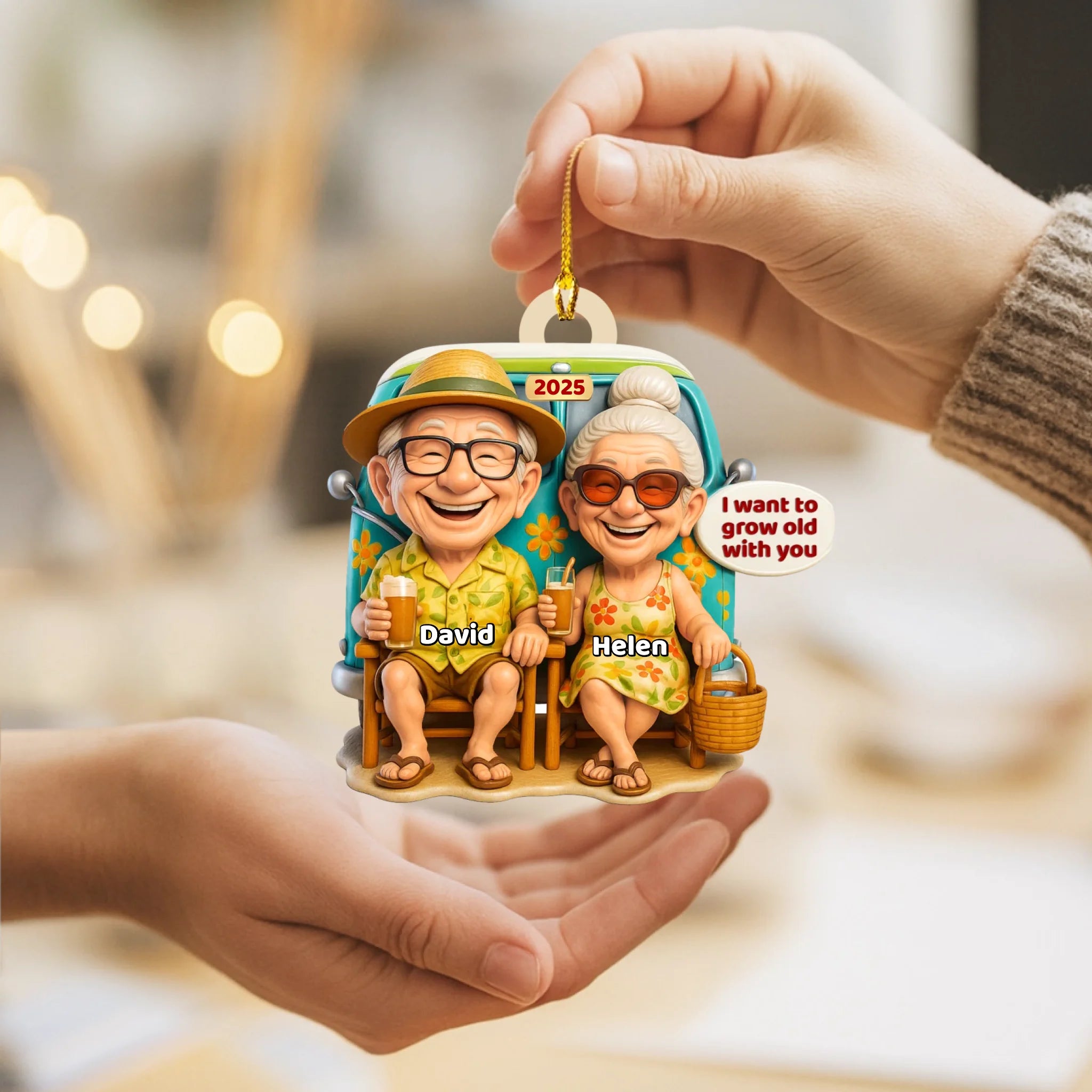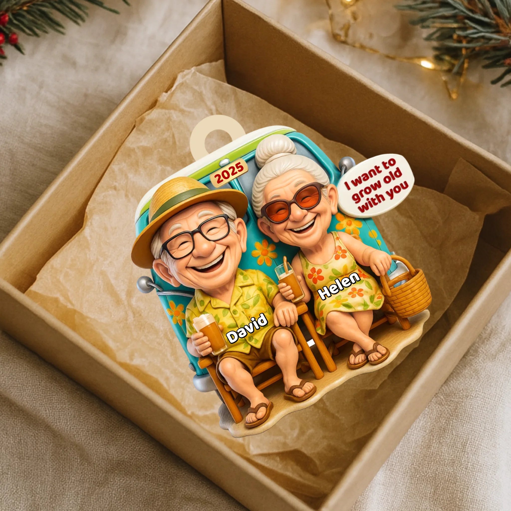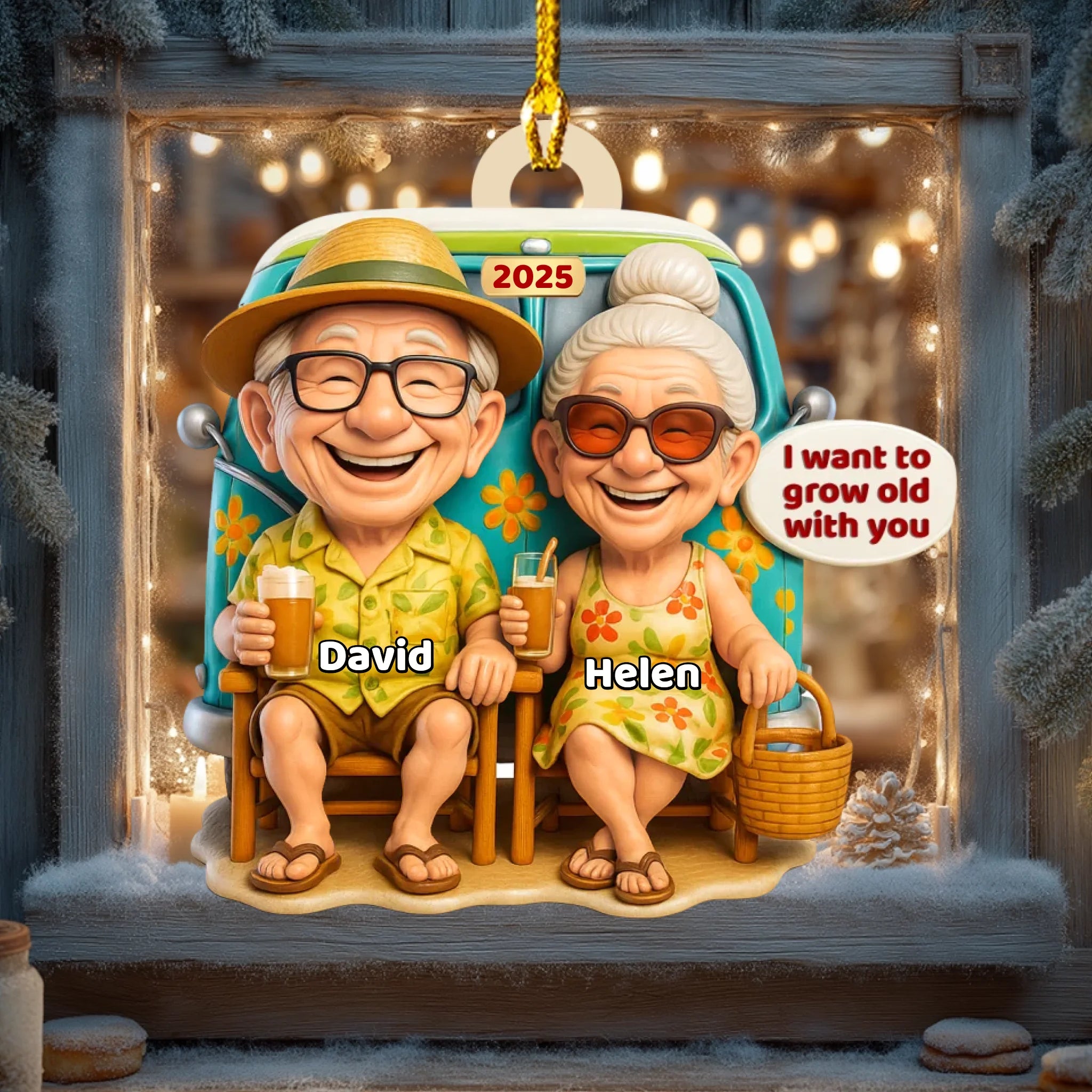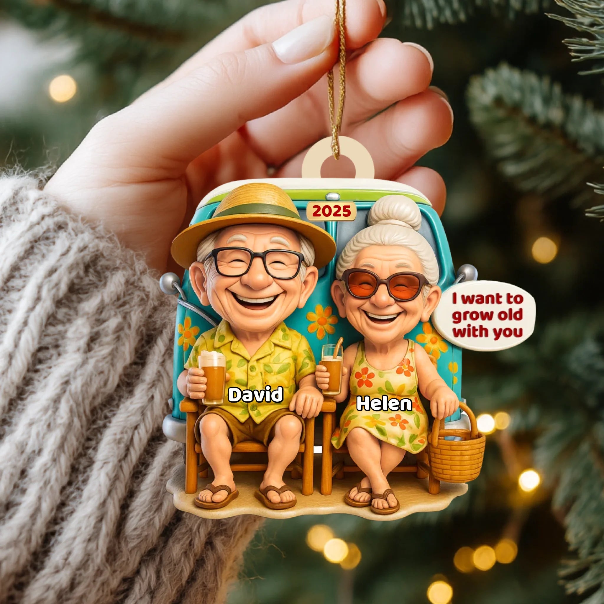 Personalized ornament with cartoon grandparents holding drinks, text 'I want to grow old with you', and names 'David' and 'Helen'.