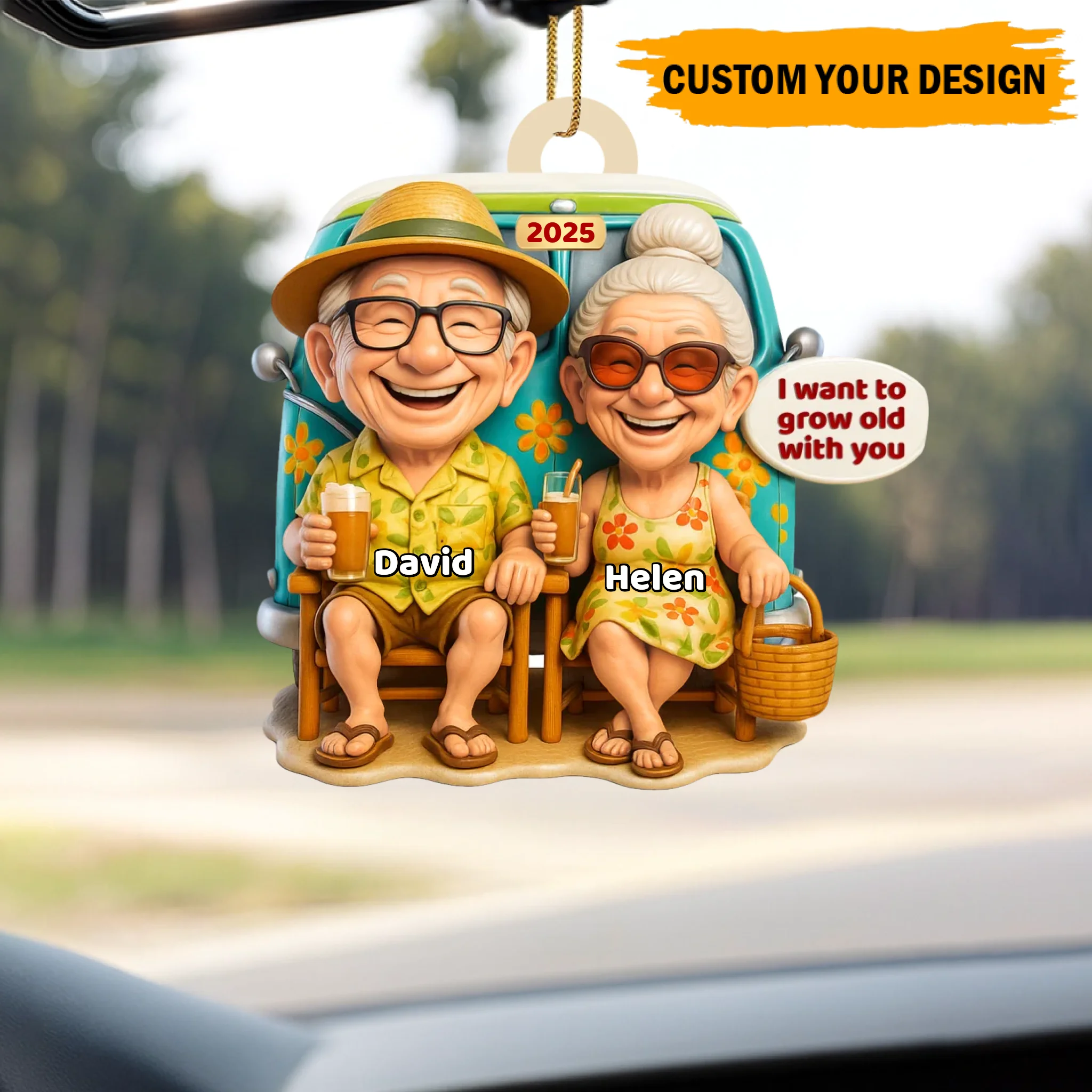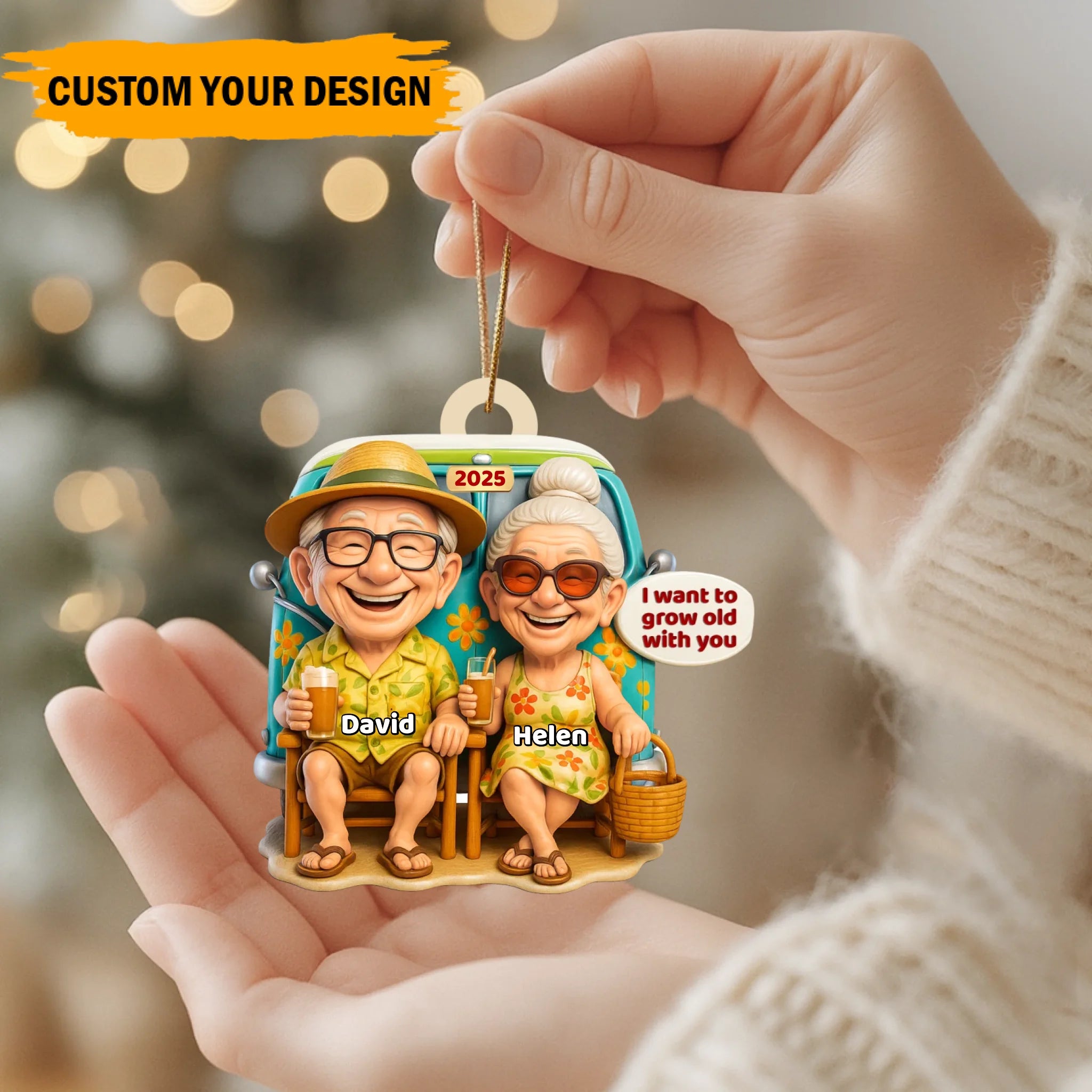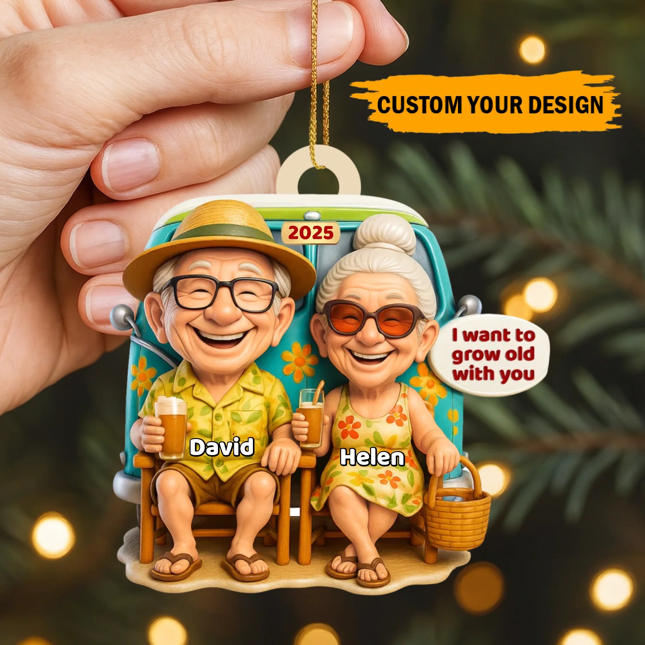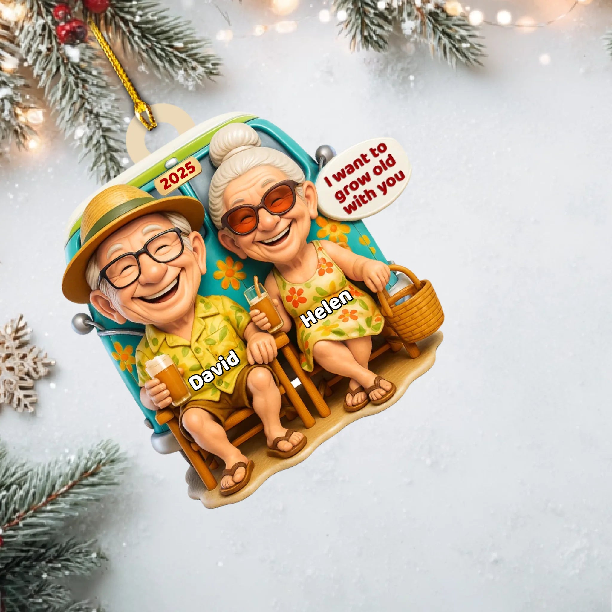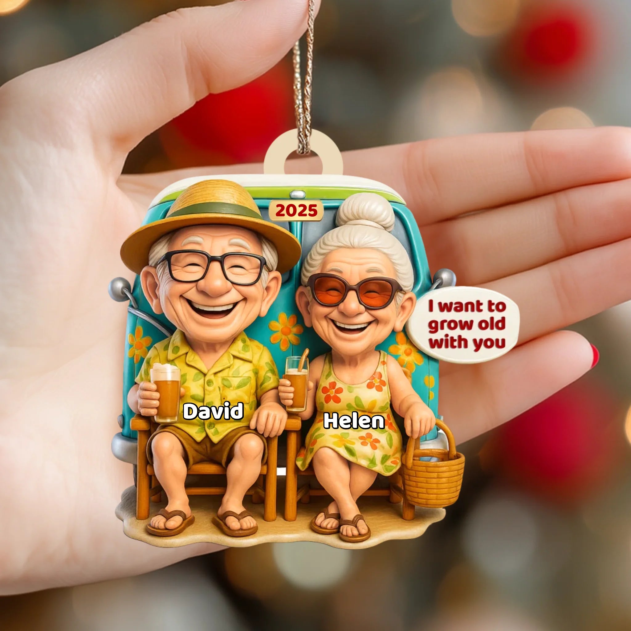 Personalized ornament with cartoon grandparents holding drinks, text 'I want to grow old with you', and names 'David' and 'Helen'.