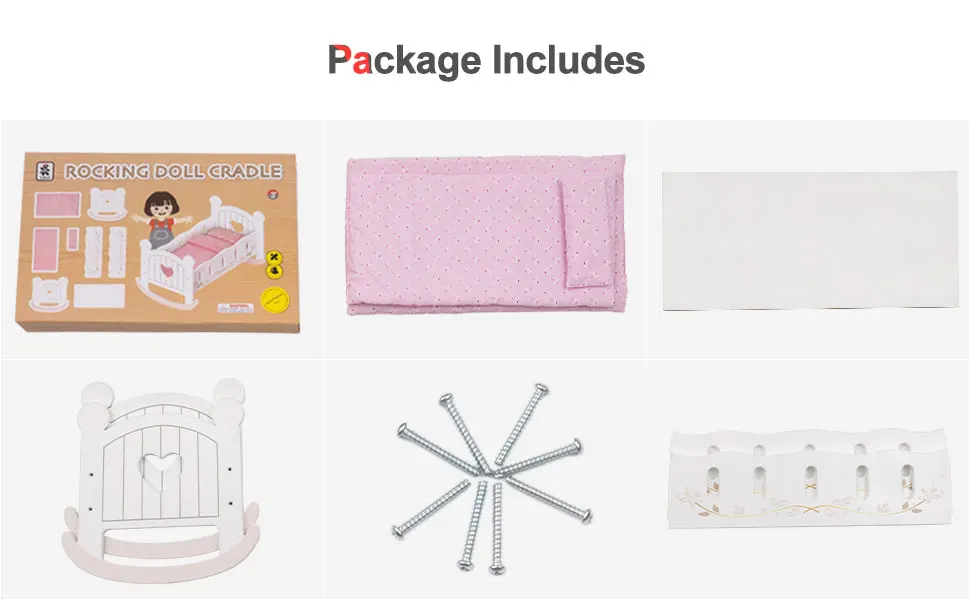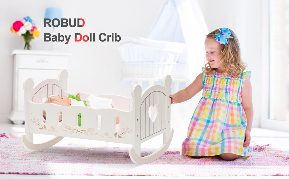 Cuna de muñecas de madera con forma de corazón y juego de ropa de cama, accesorios resistentes para cama de muñecas de 18 pulgadas (regalo para edades de 3+)
