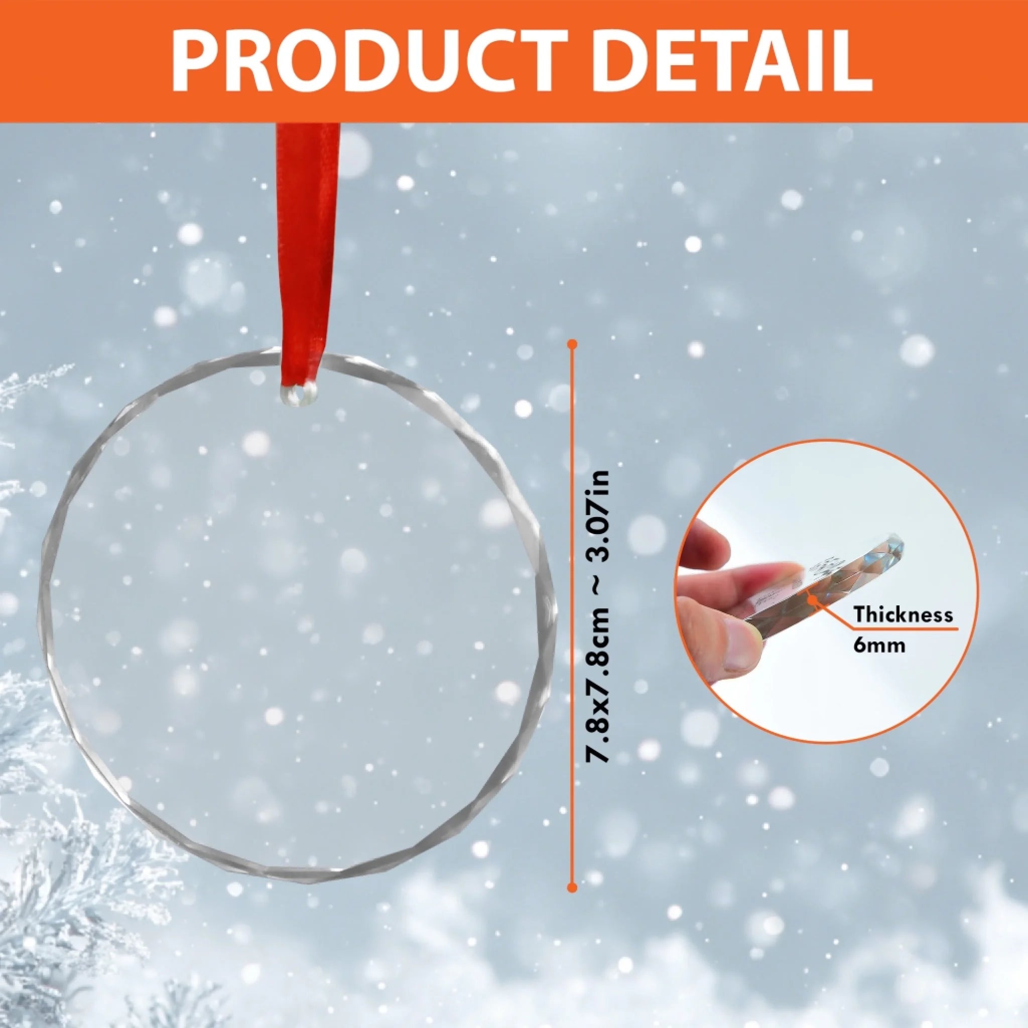 Clear circular ornament with red ribbon on a snowy background, showing measurements and thickness.