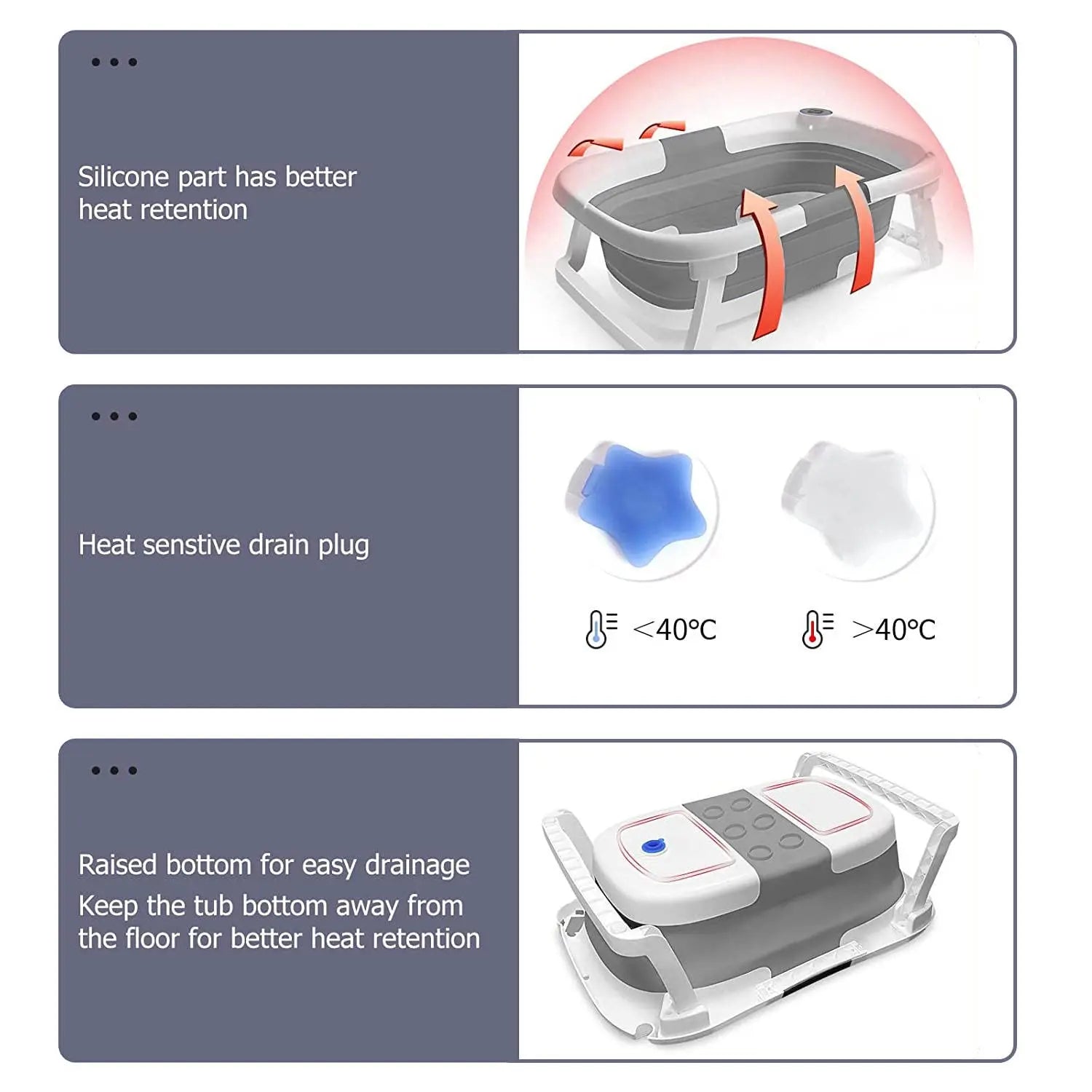 Baby bathtub with labeled features on a white background