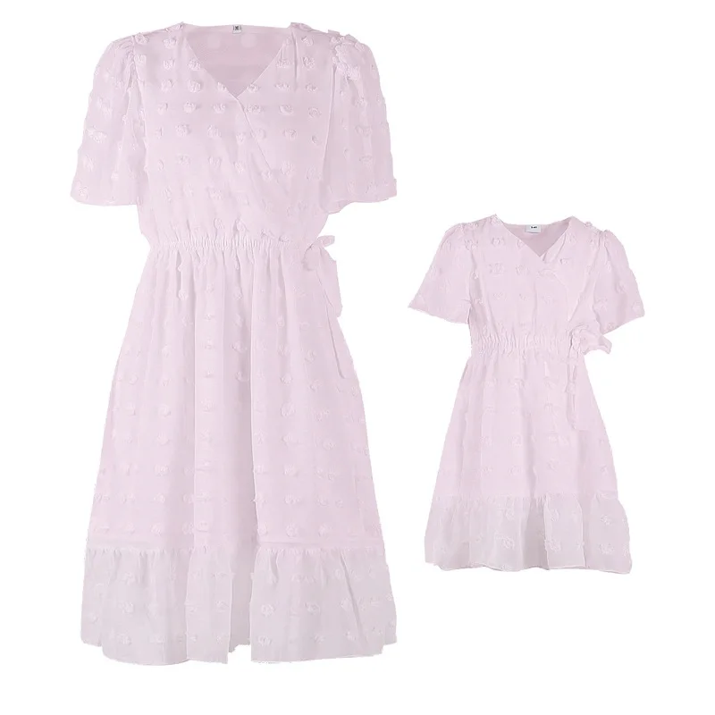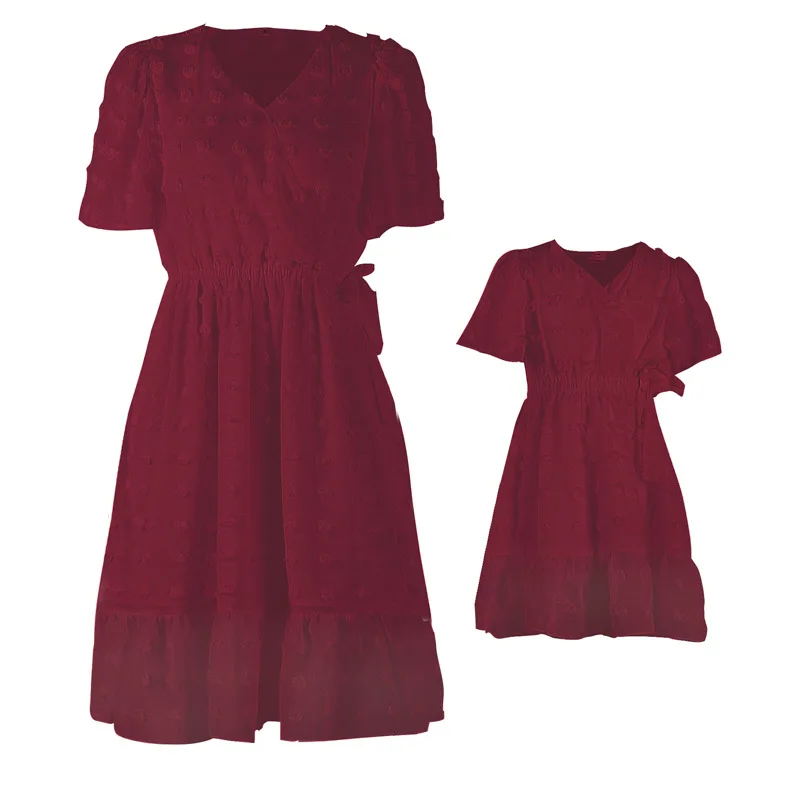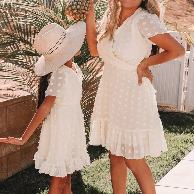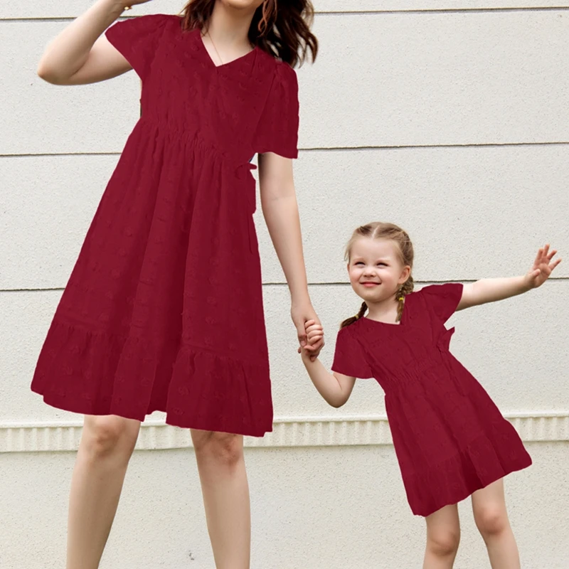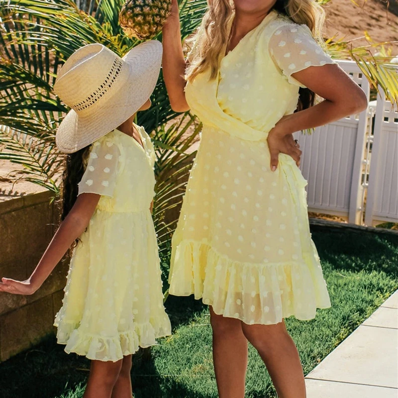 Vestido de ropa a juego familiar para madre e hija con cuello en V y manga corta