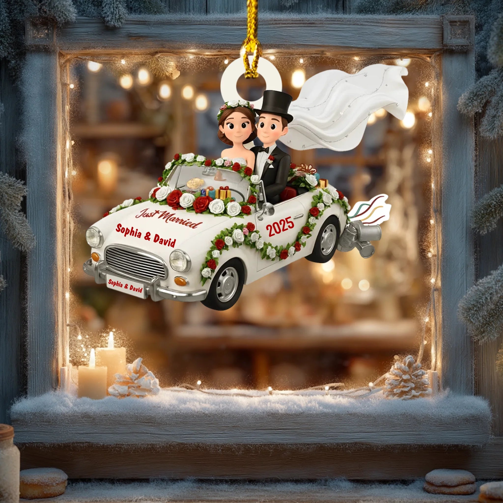 Decorative ornament of a bride and groom in a wedding car with 'Just Married' and '2025' text, against a blurred festive background.