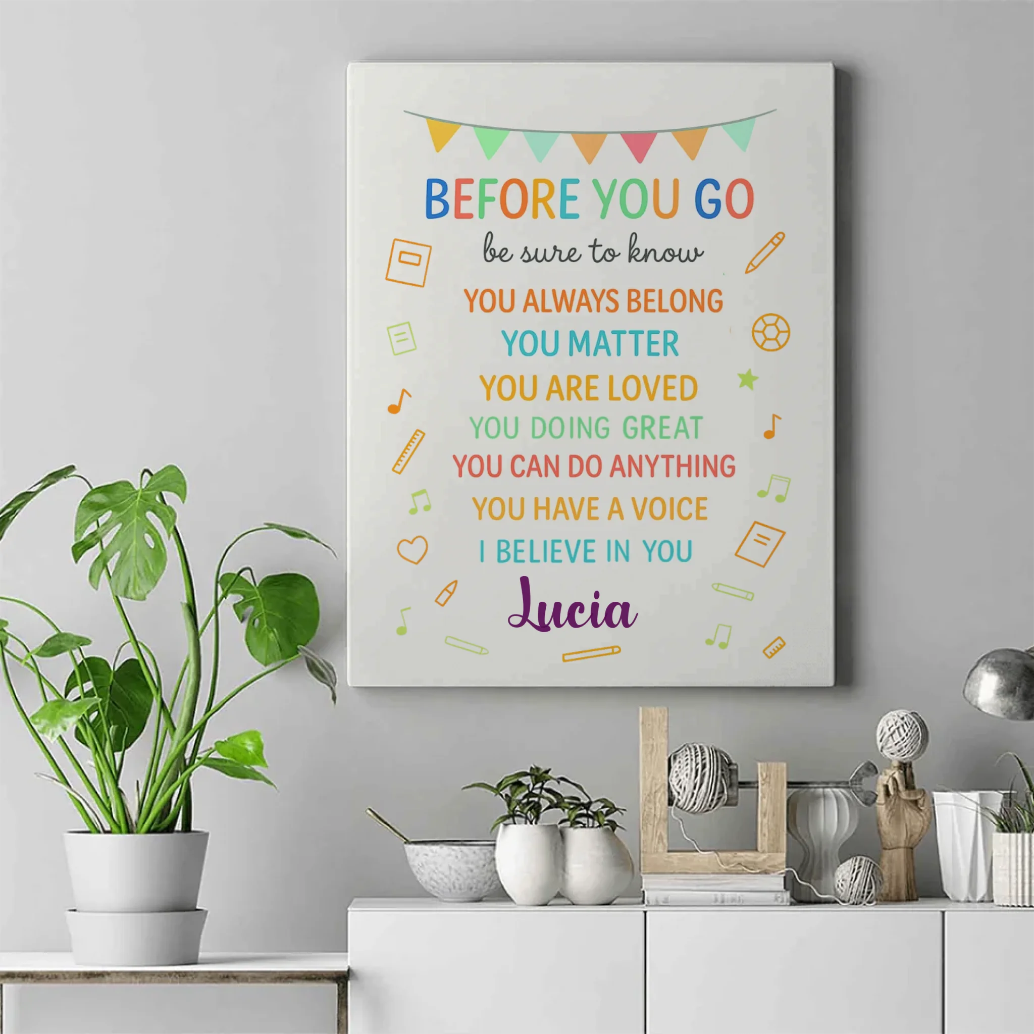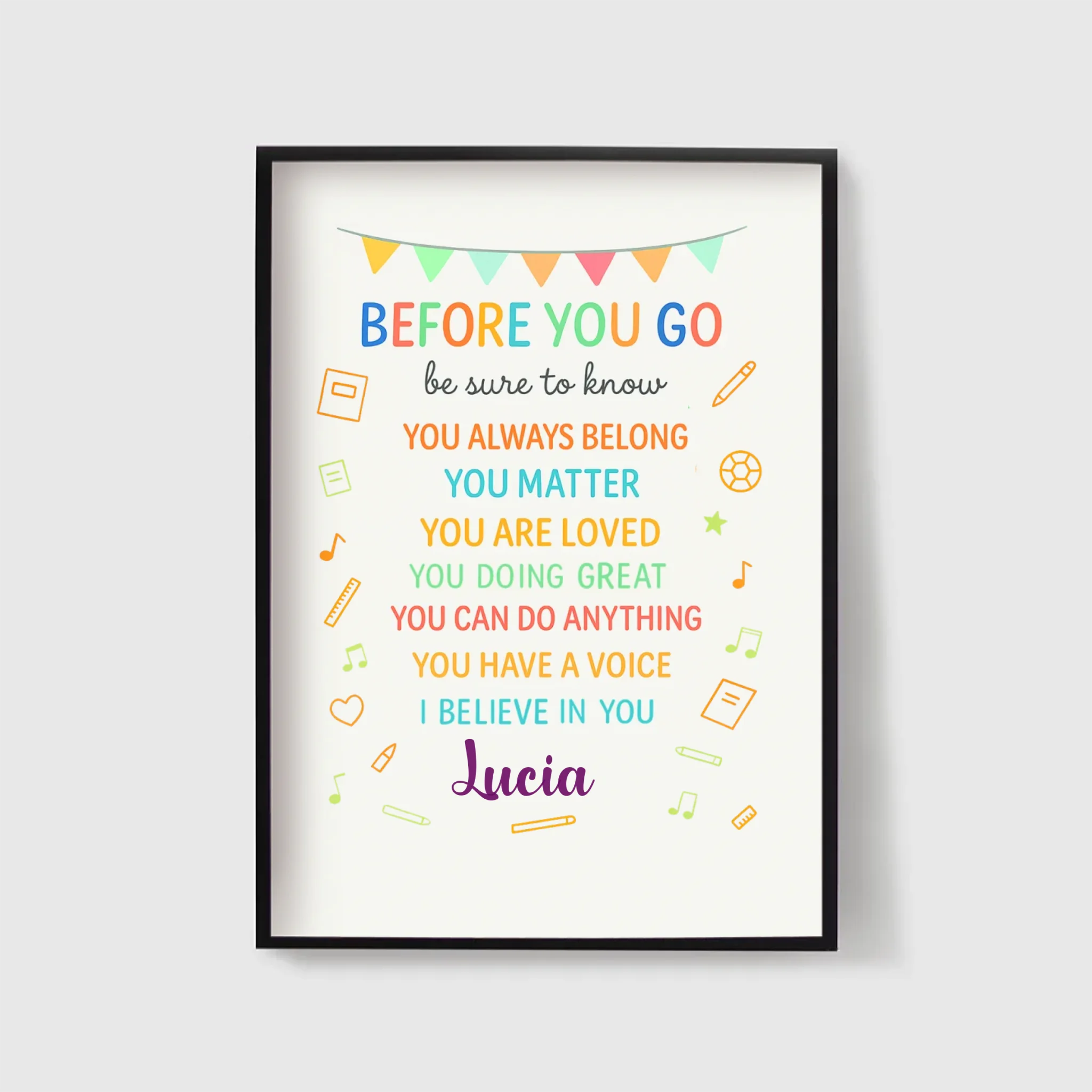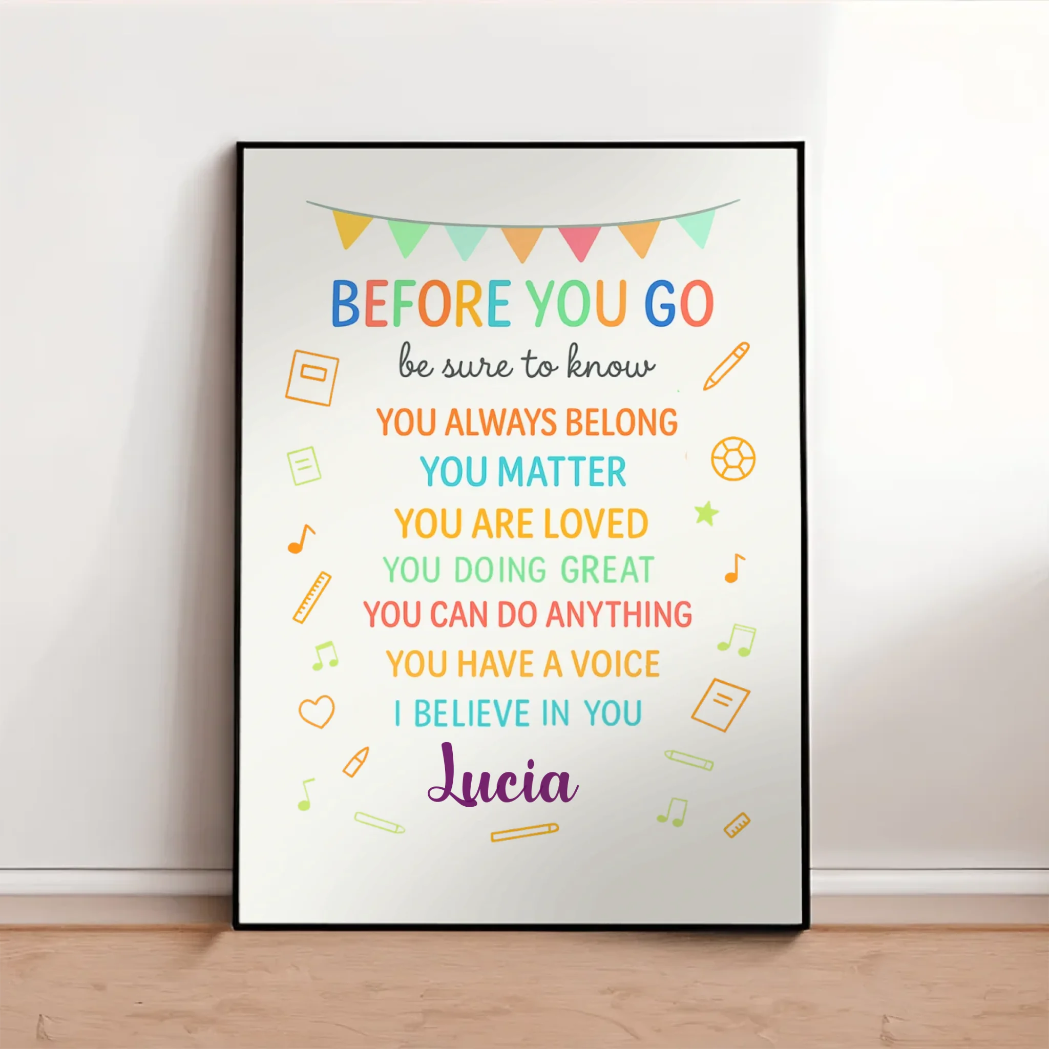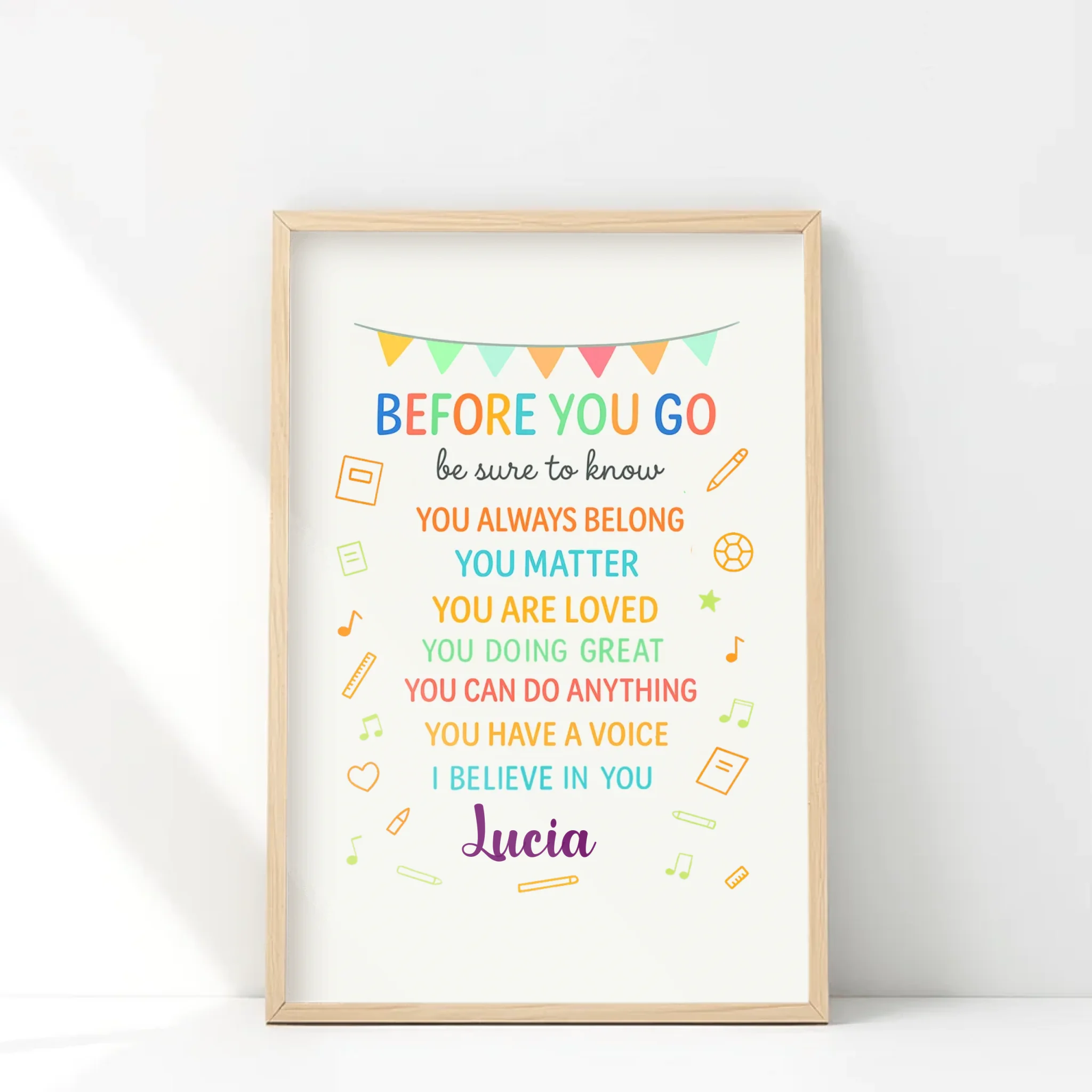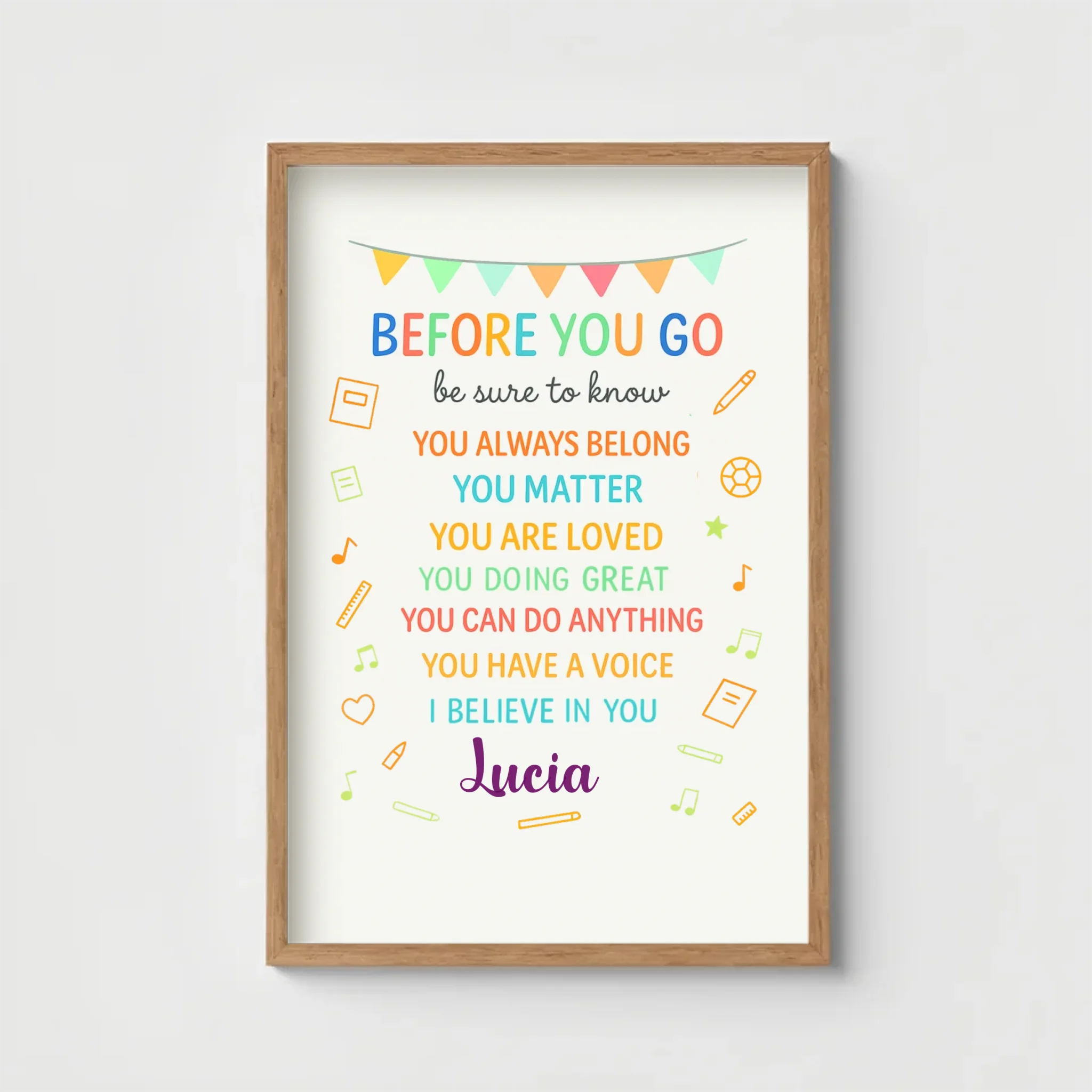 Llena tus paredes de positividad y ánimo con nuestro Cartel Personalizado 'Before You Go'. Diseñado con recordatorios inspiradores como “Eres Importante, Eres Amado, Puedes Hacer Cualquier Cosa”, esta pieza es perfecta para salones de clase, habitaciones infantiles o cualquier espacio que necesite una dosis diaria de inspiración.