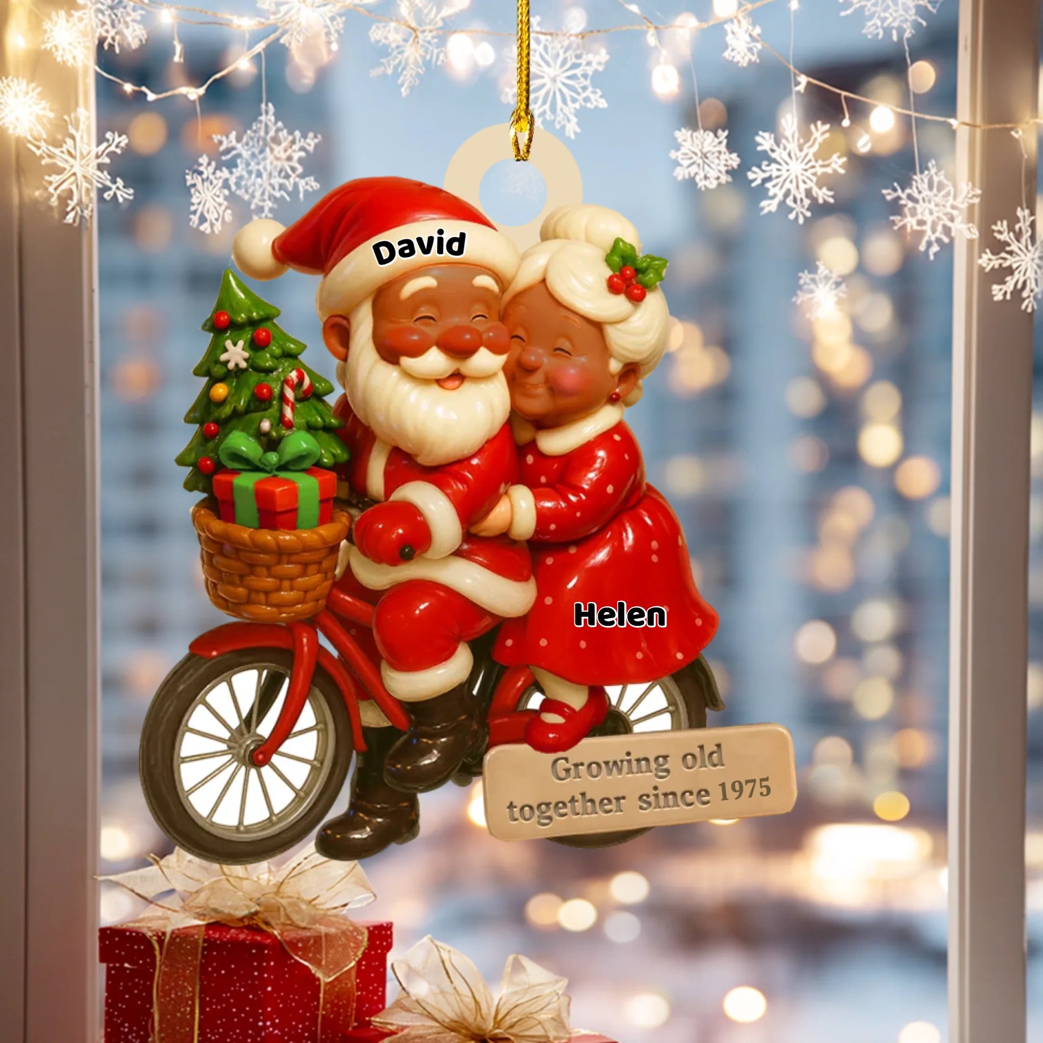 Personalized Christmas ornament with Santa and a woman on a bike, against a festive background.