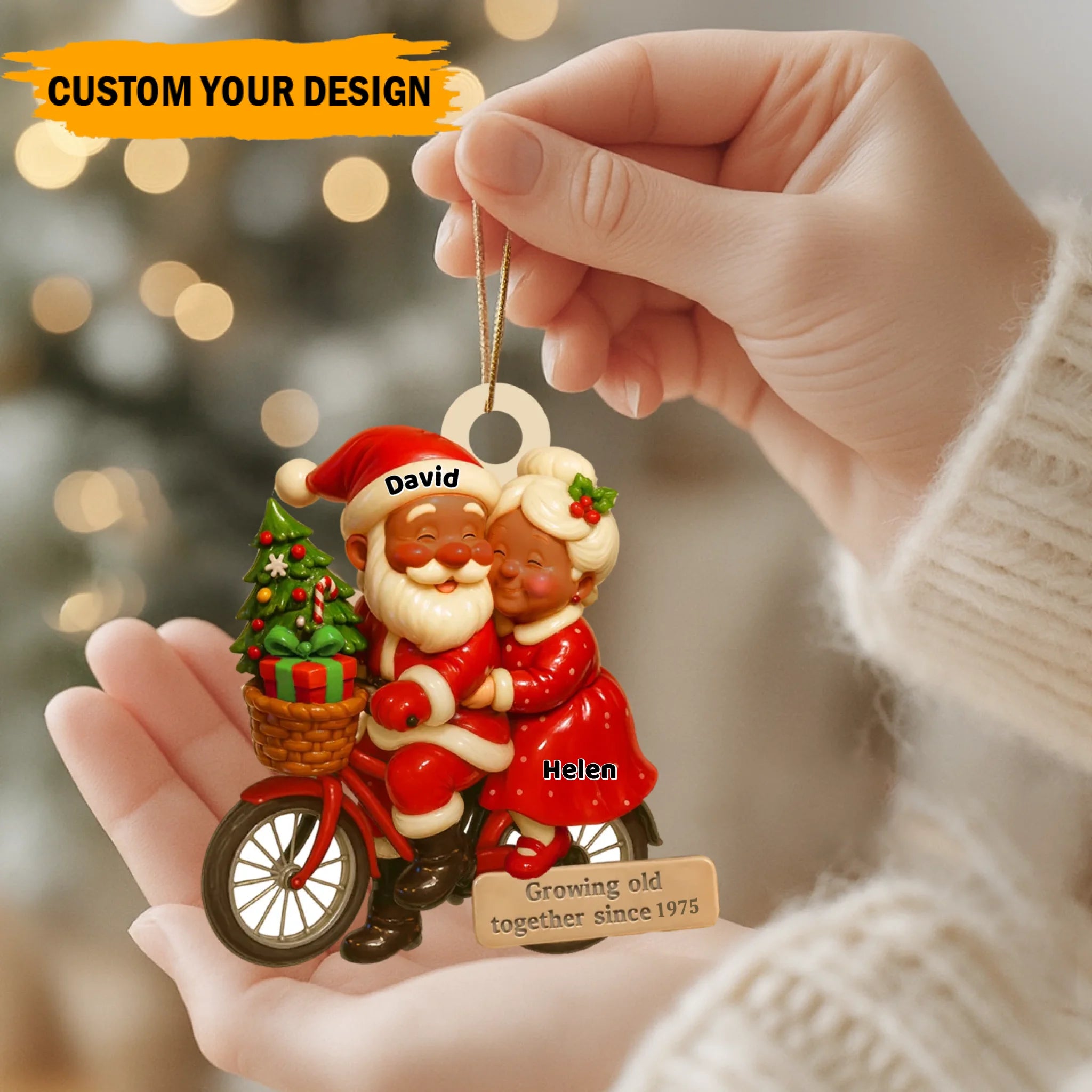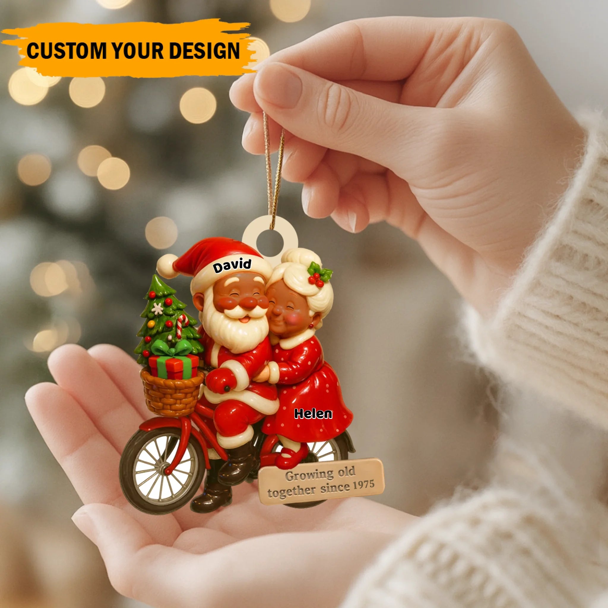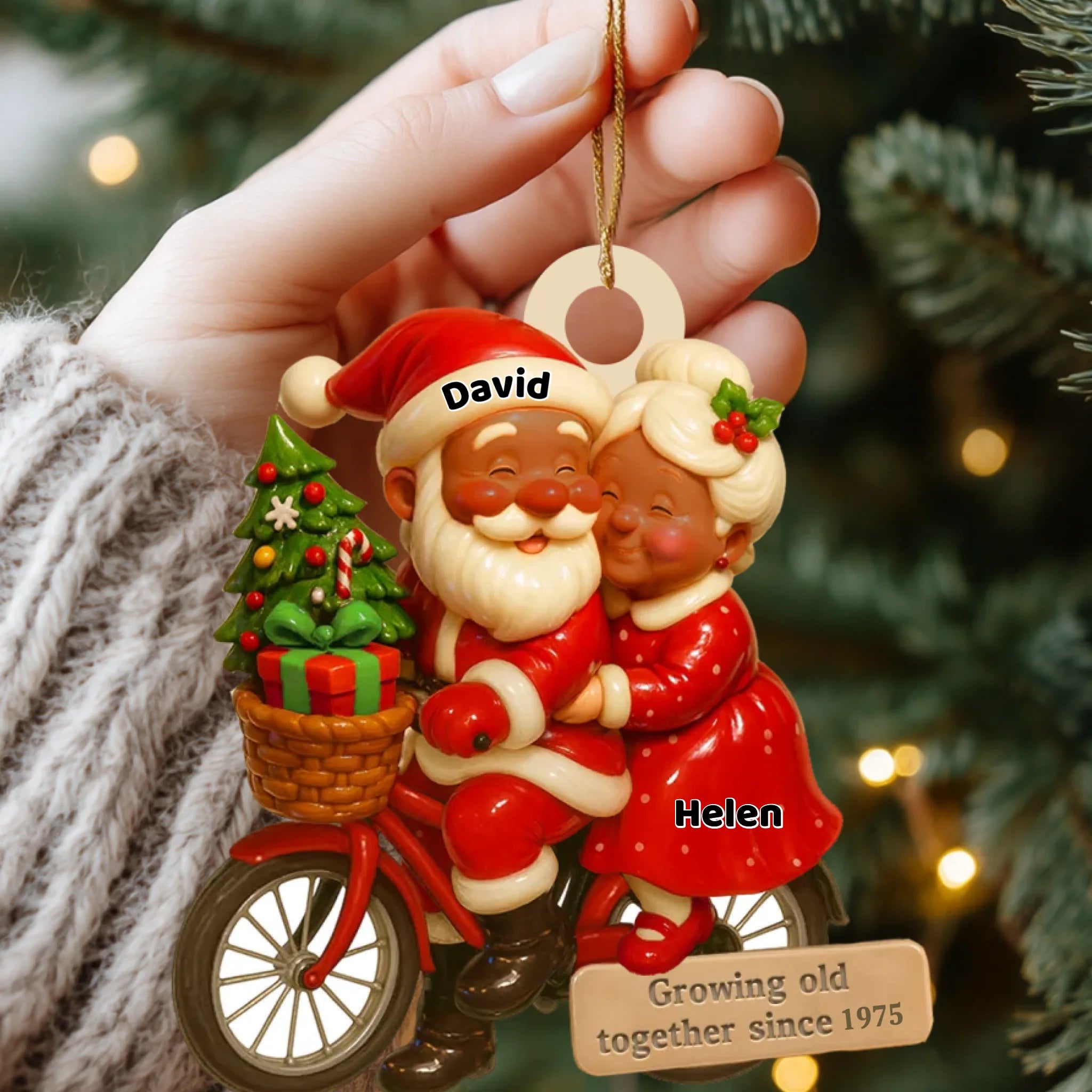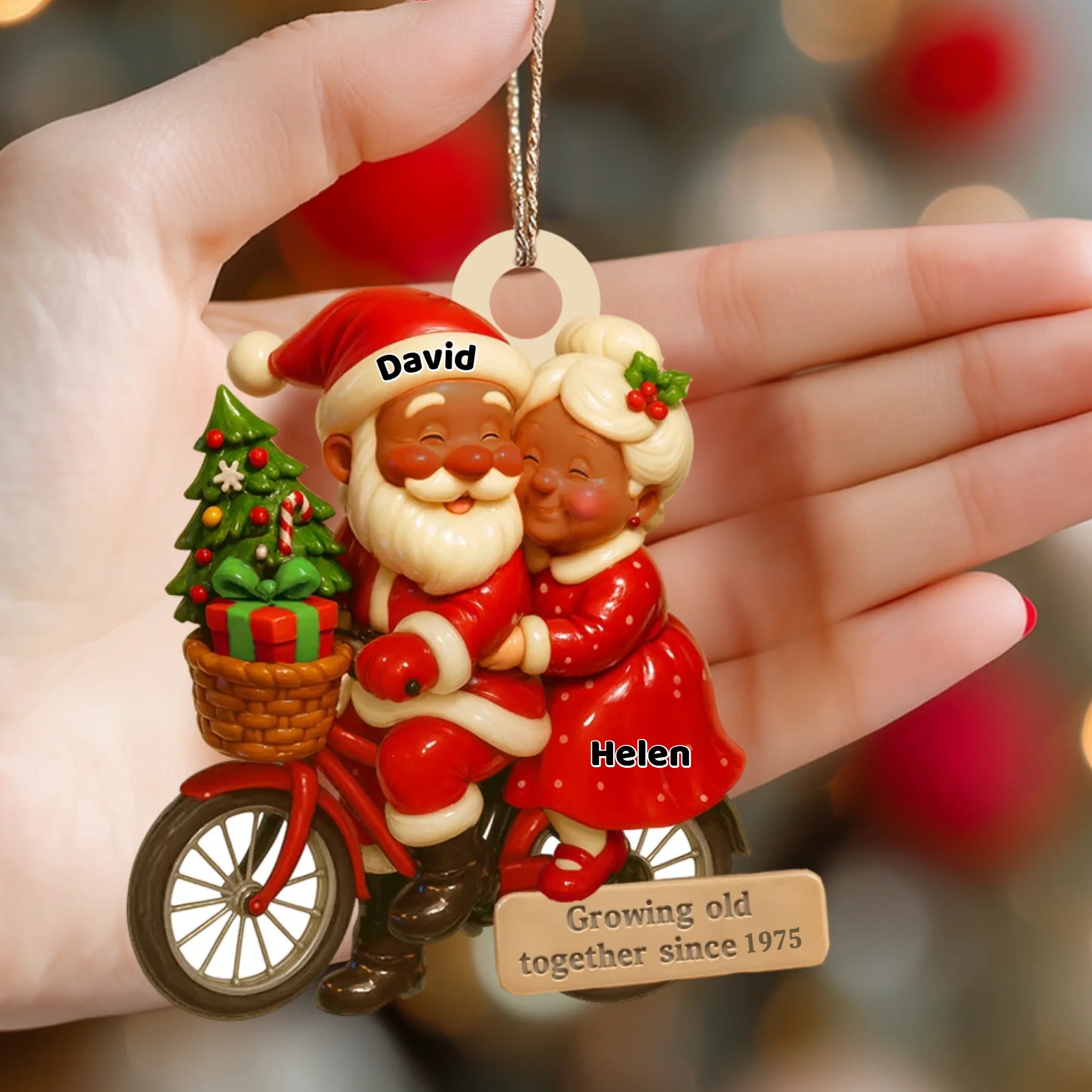 Hand holding a Christmas ornament with Santa and Mrs. Claus on a bike, against a blurred festive background.
