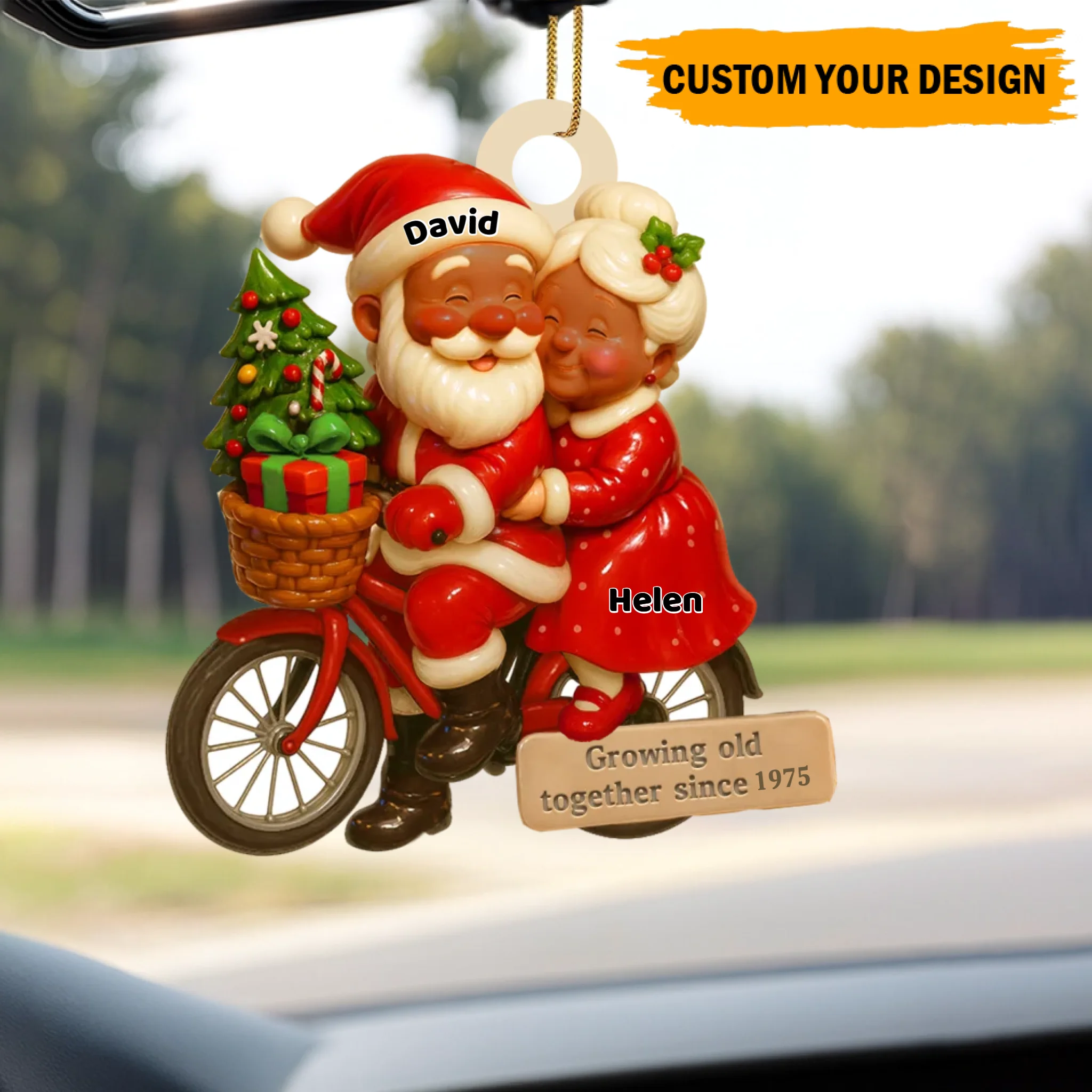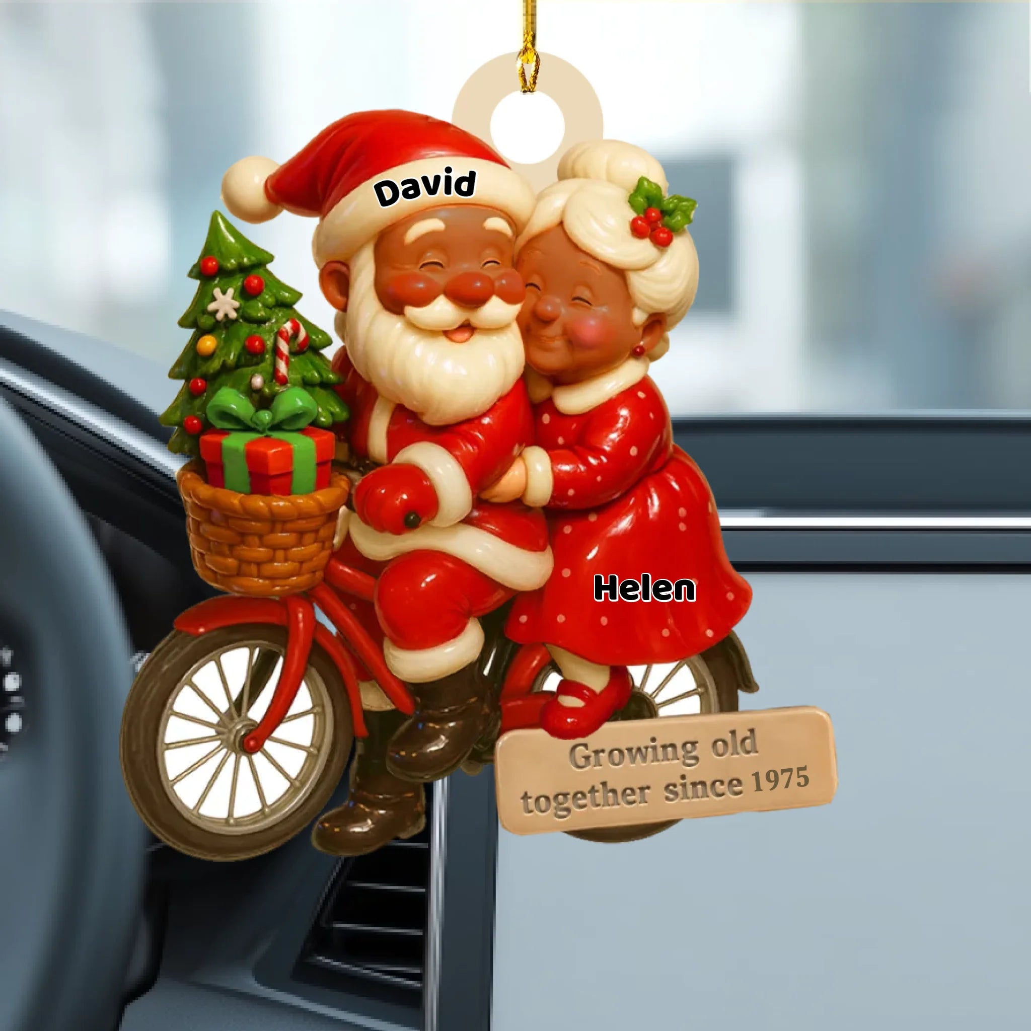 Decorative ornament of Santa and Mrs. Claus on a bicycle with personalized names and text, hanging inside a car.
