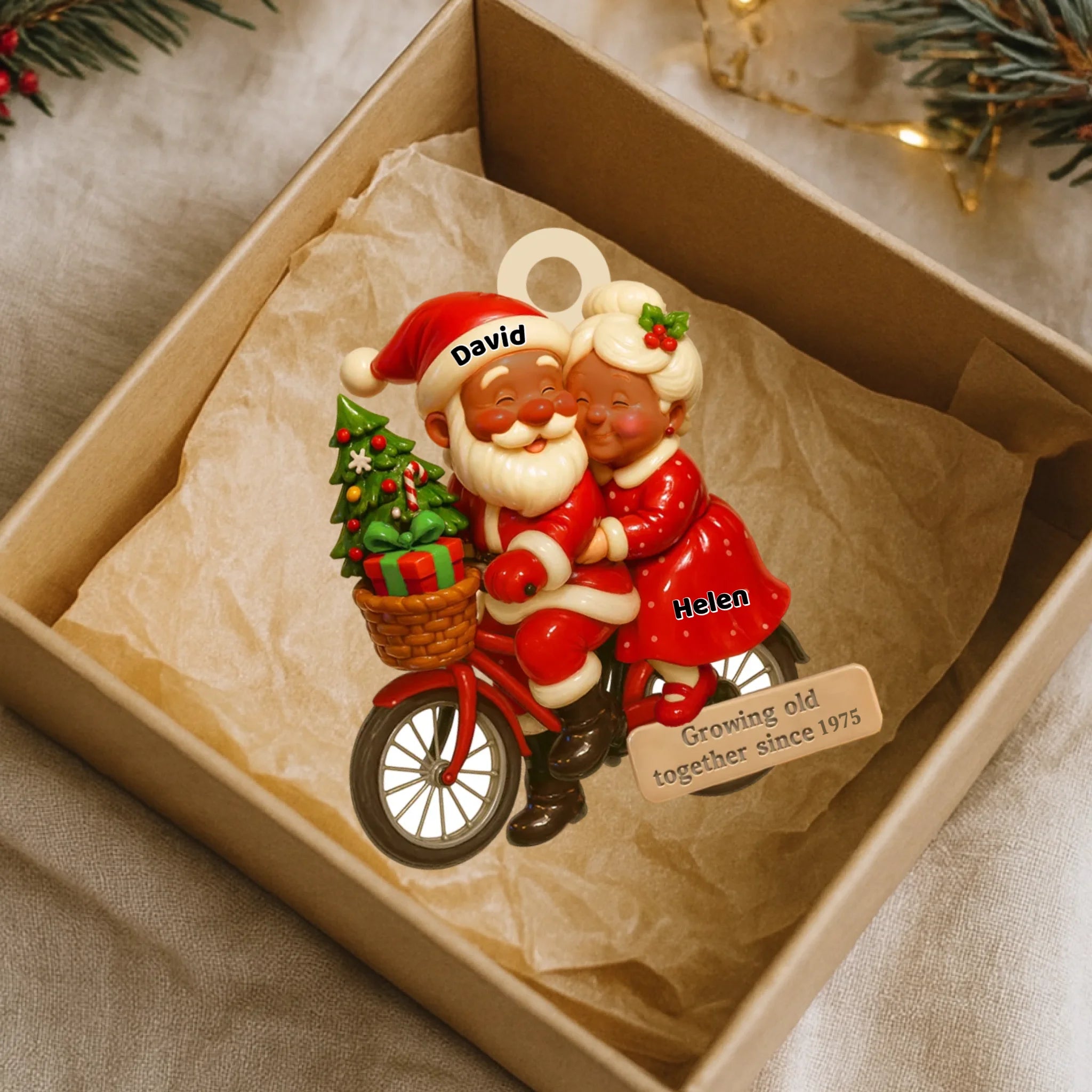 Decorative ornament of a couple on a bike with personalized names, placed in an open box.