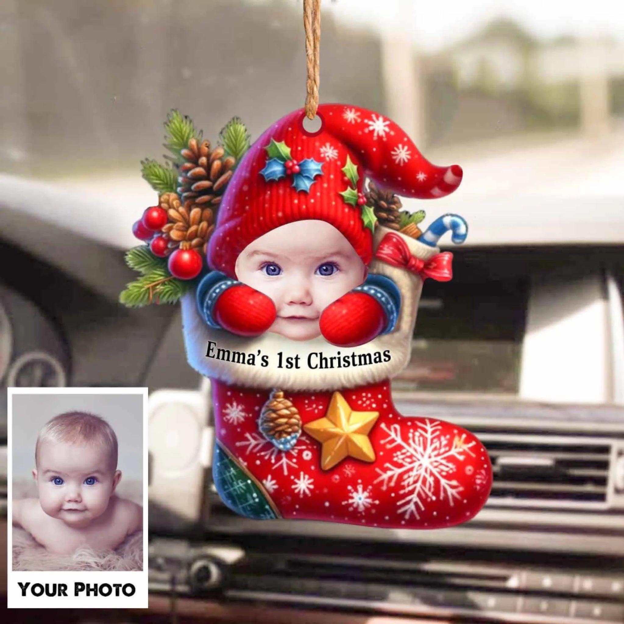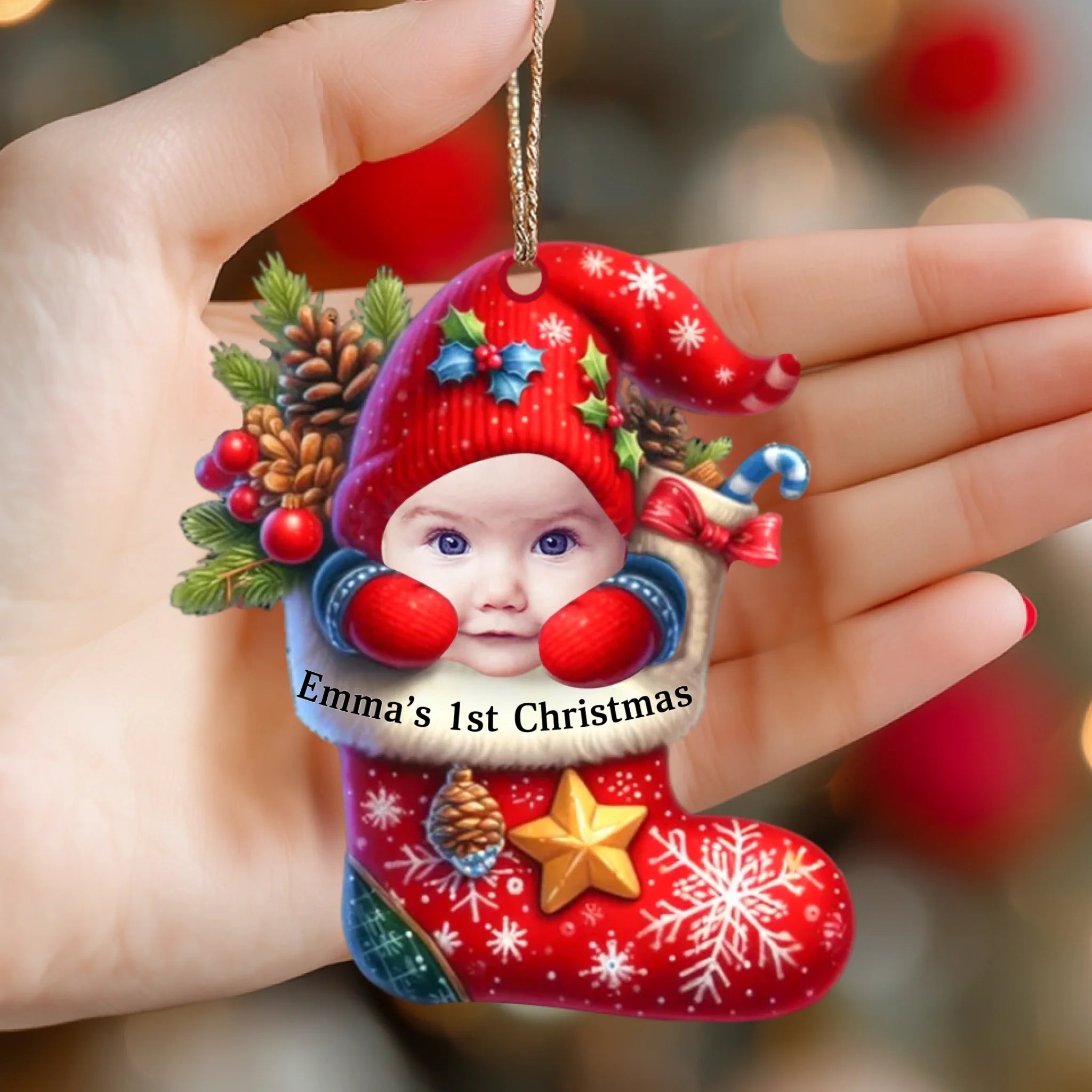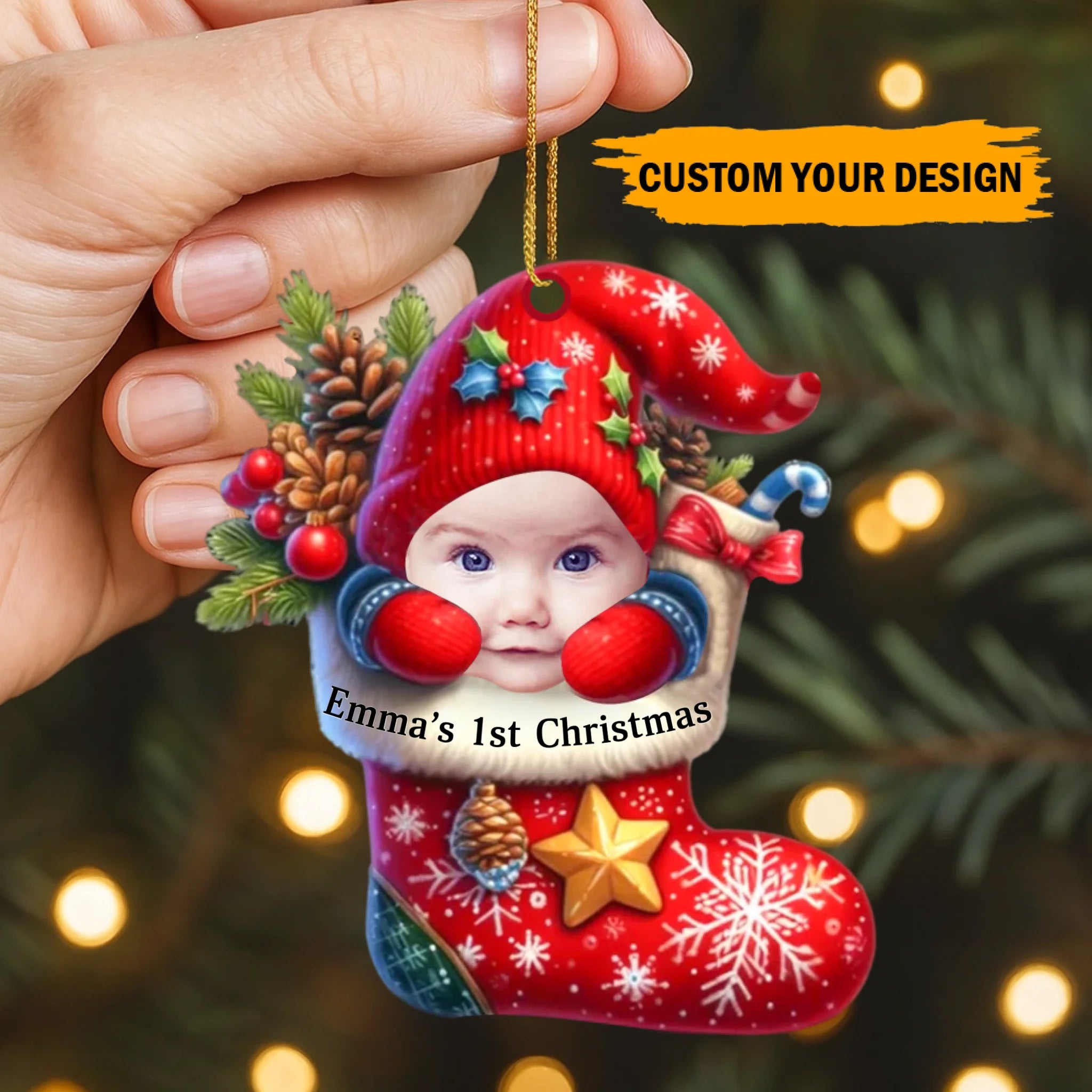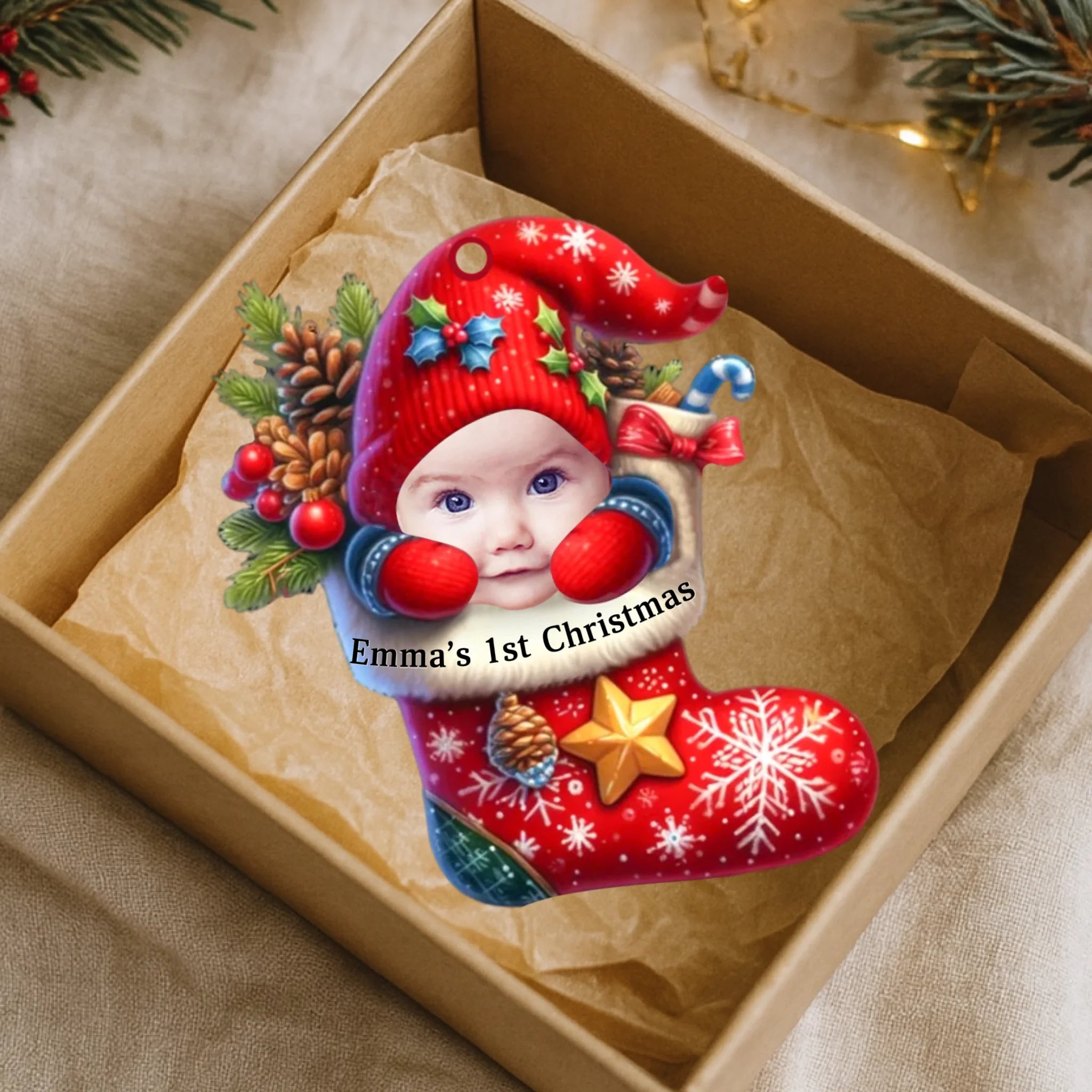 Adorno personalizado del primer día de navidad del bebé - Calcetín acrílico con foto personalizada como recuerdo, decoración de árbol de navidad para recién nacidos 2025
