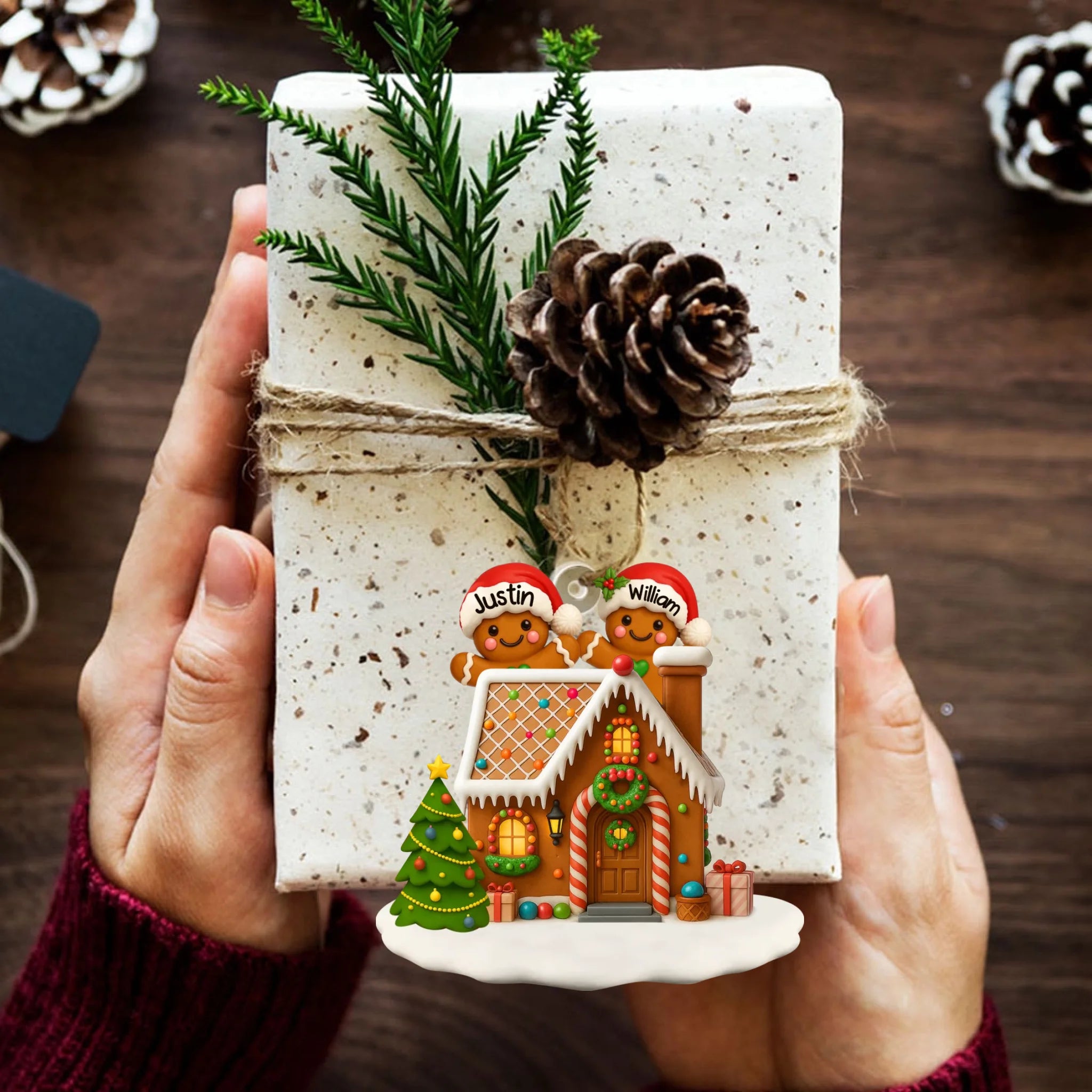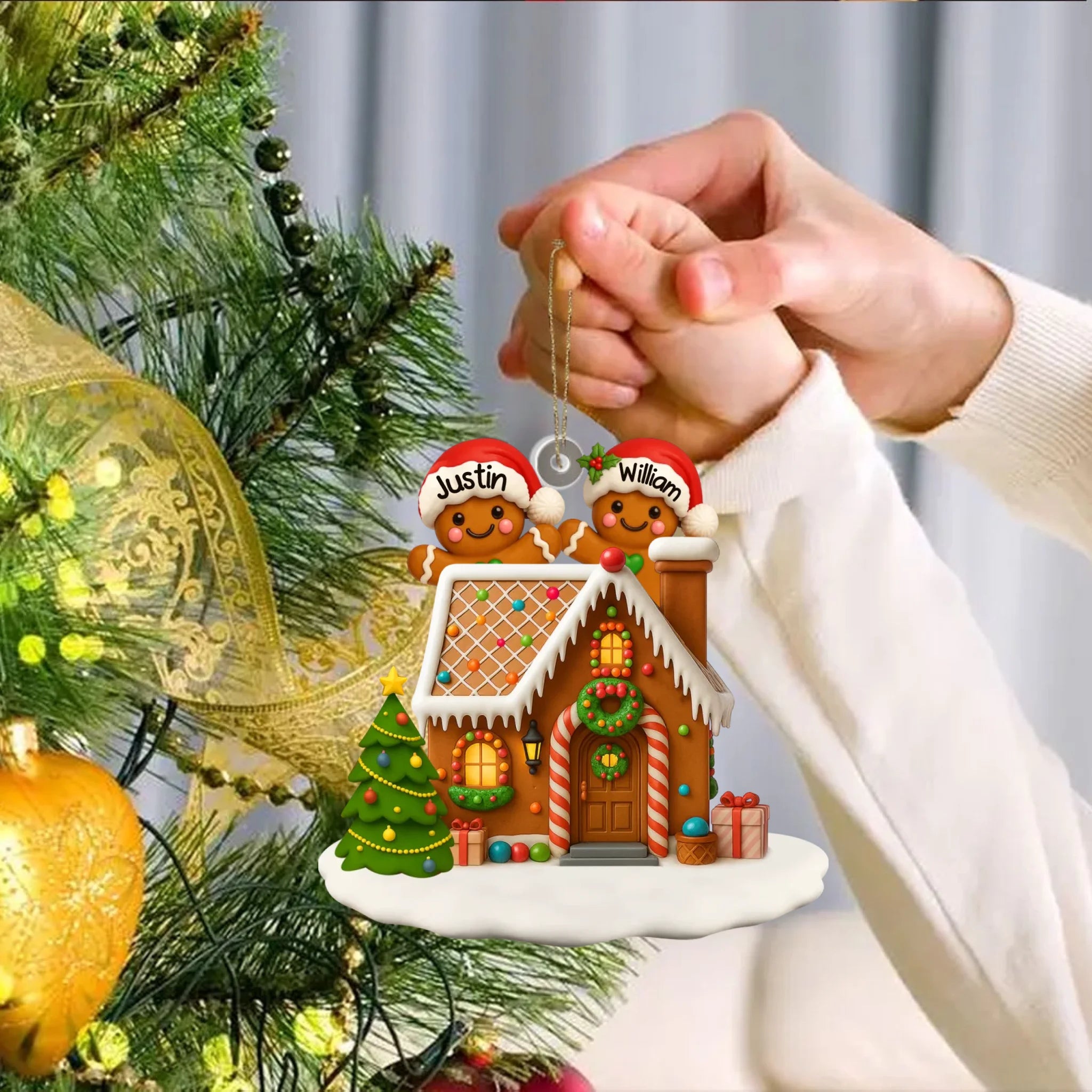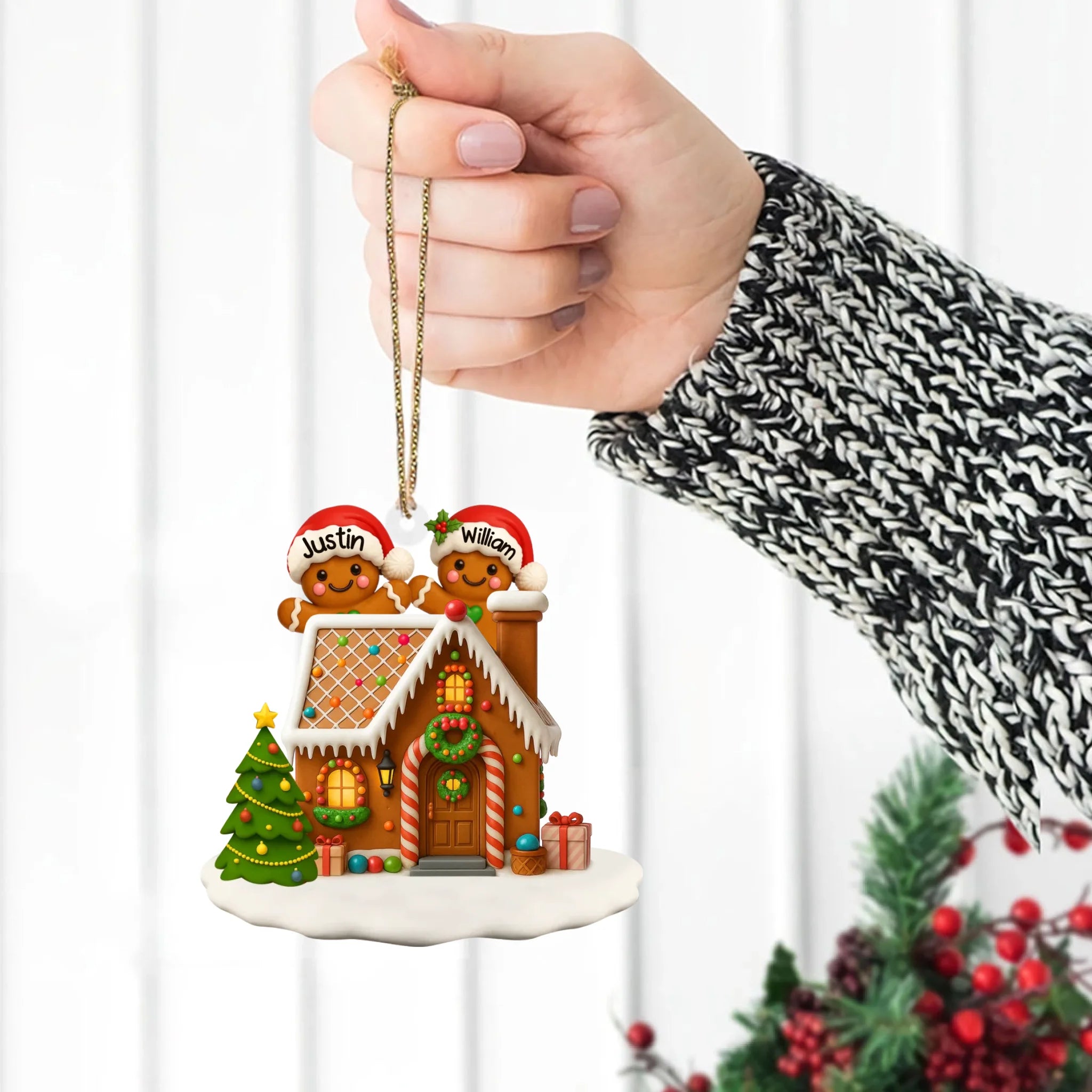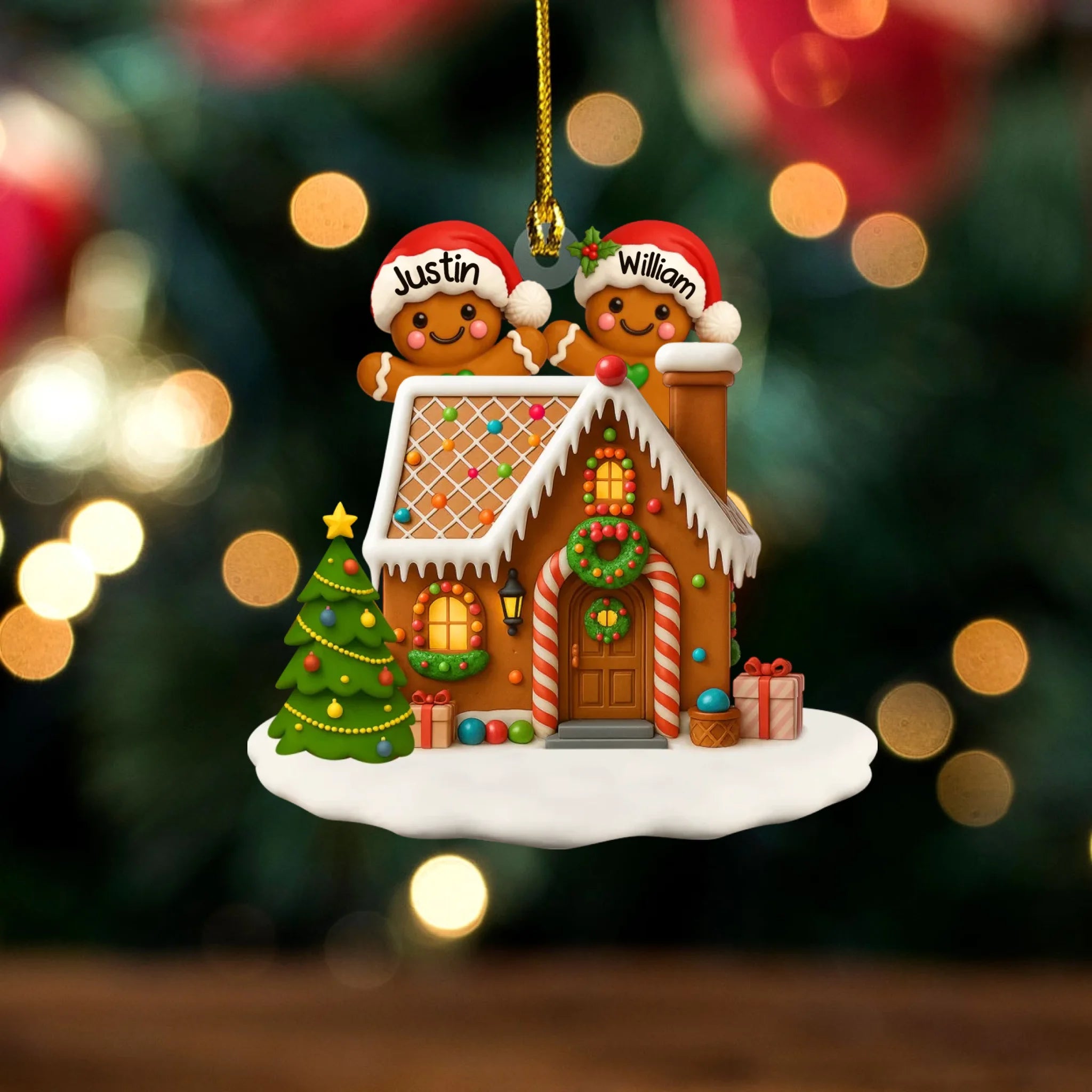 Decorative Christmas ornament with gingerbread house and personalized names on a festive background.