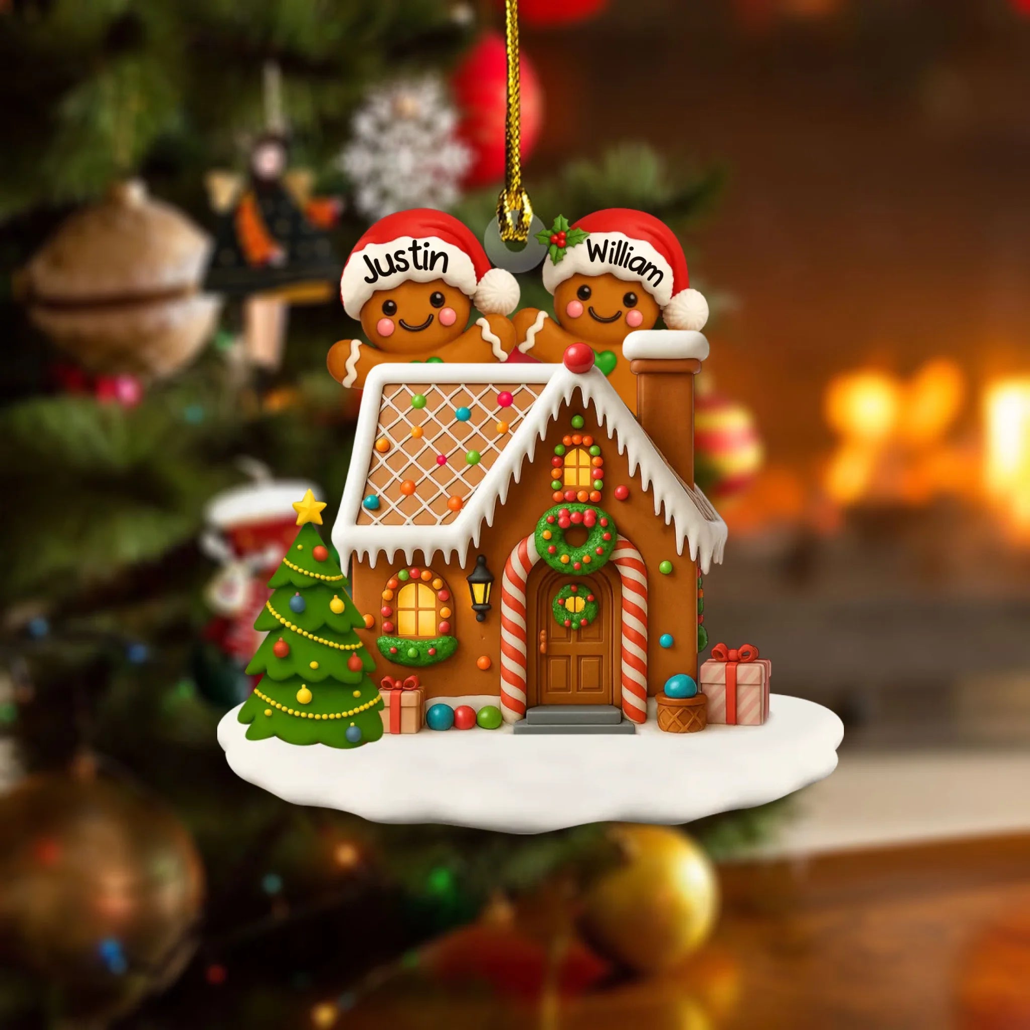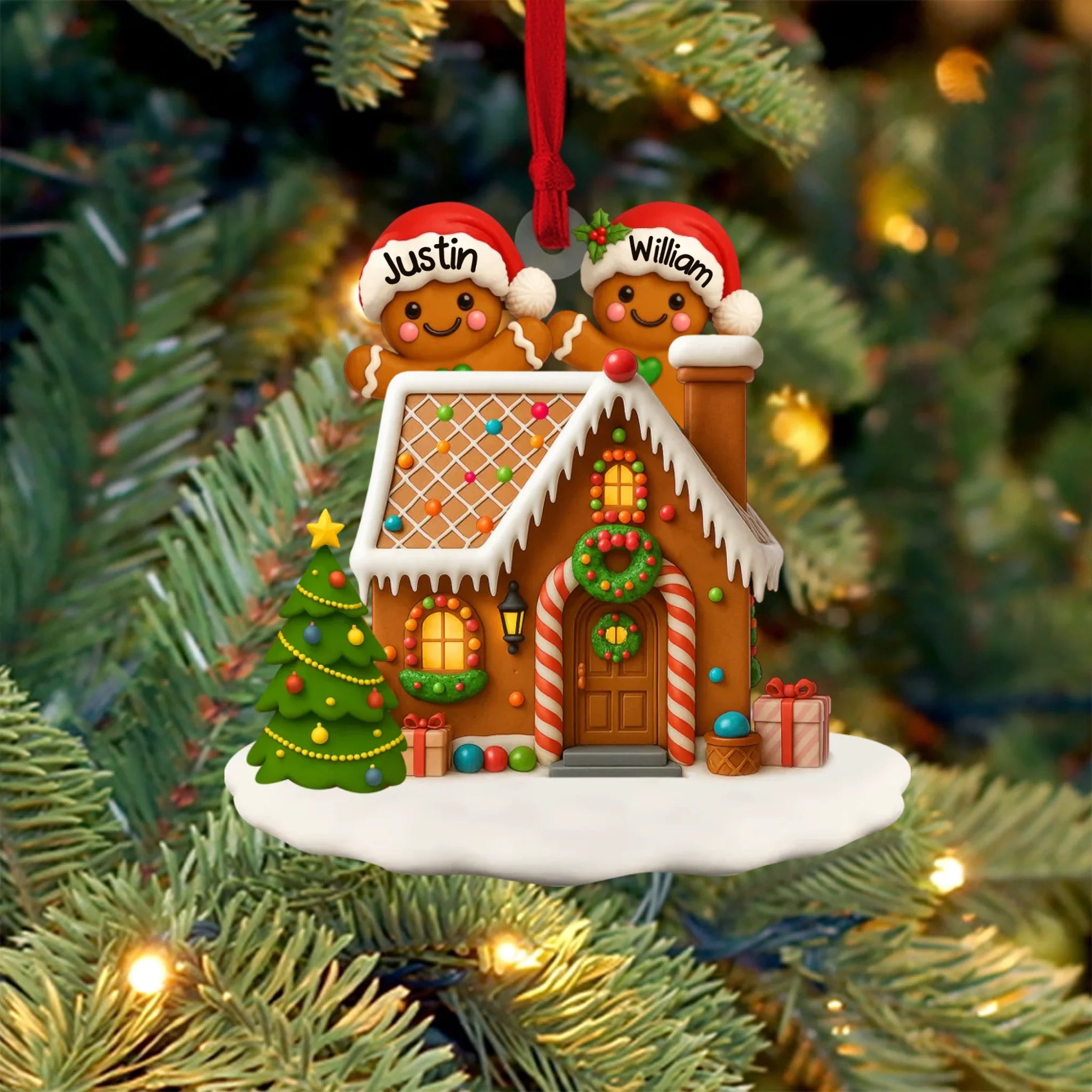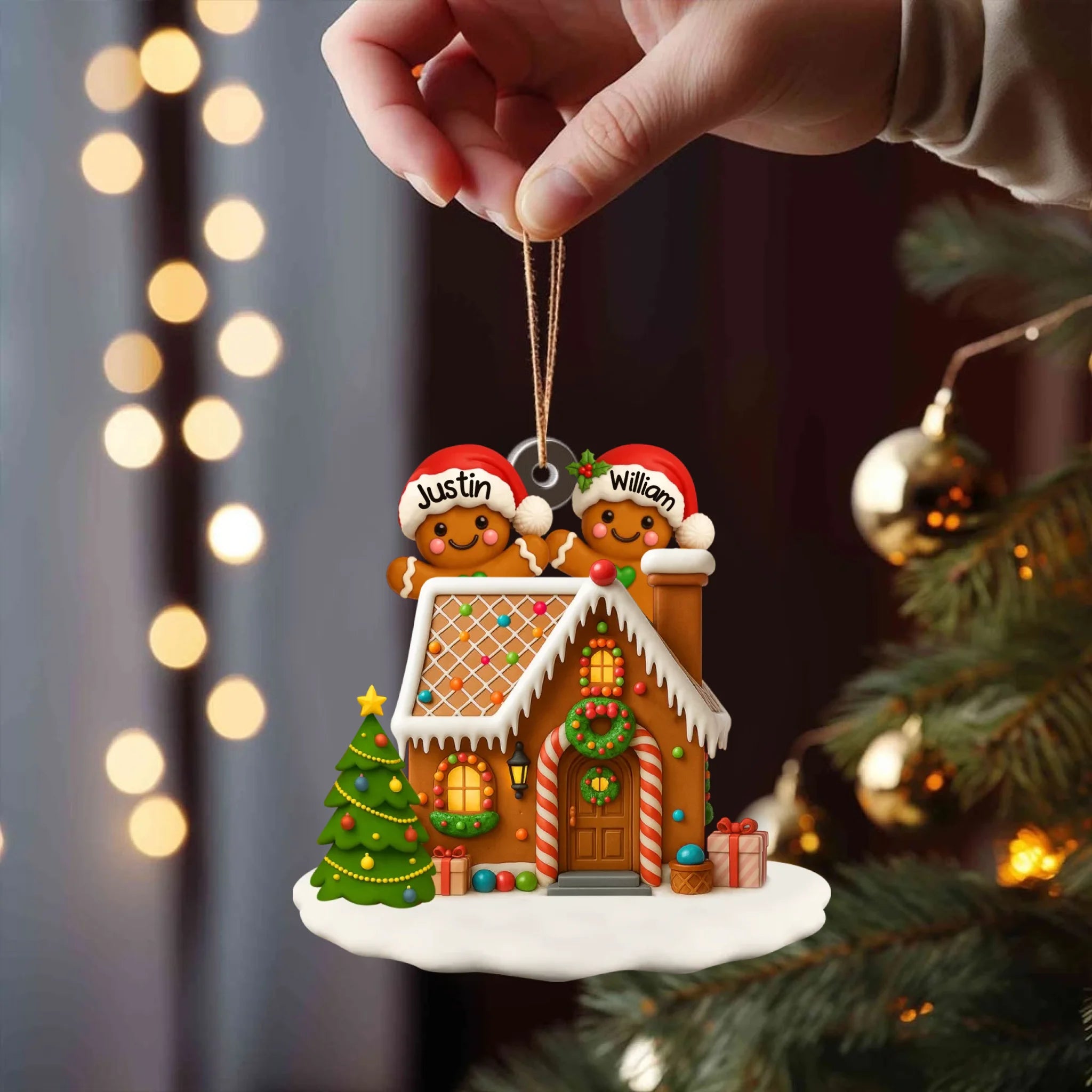 Decorative Christmas ornament with gingerbread house and personalized names on a tree.