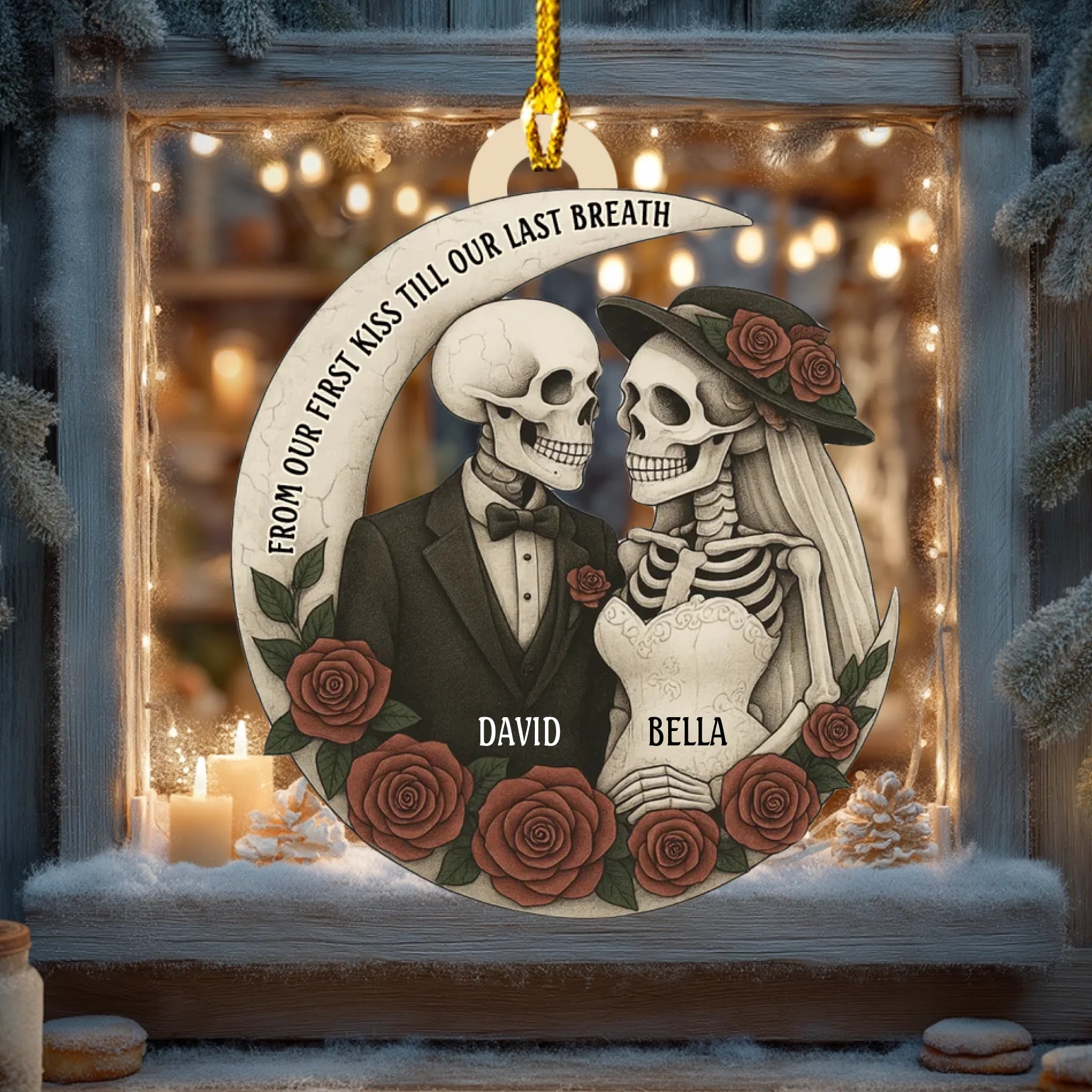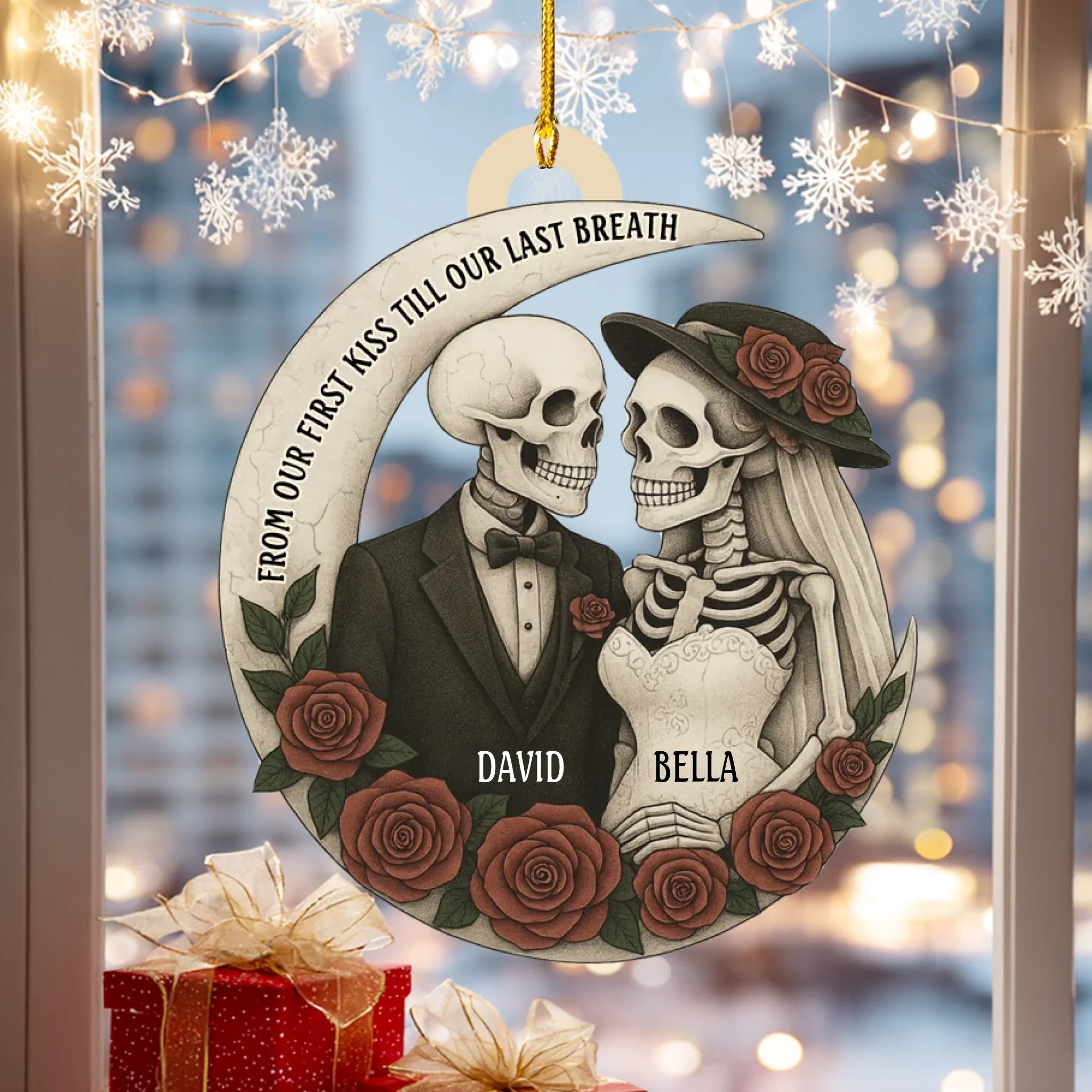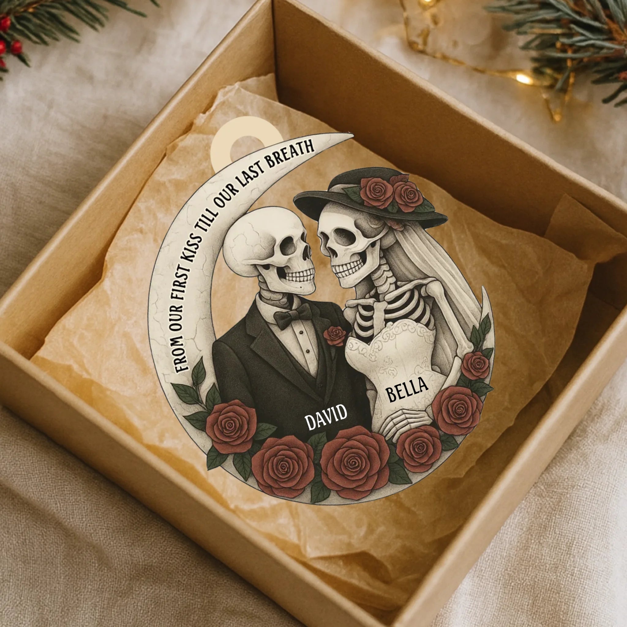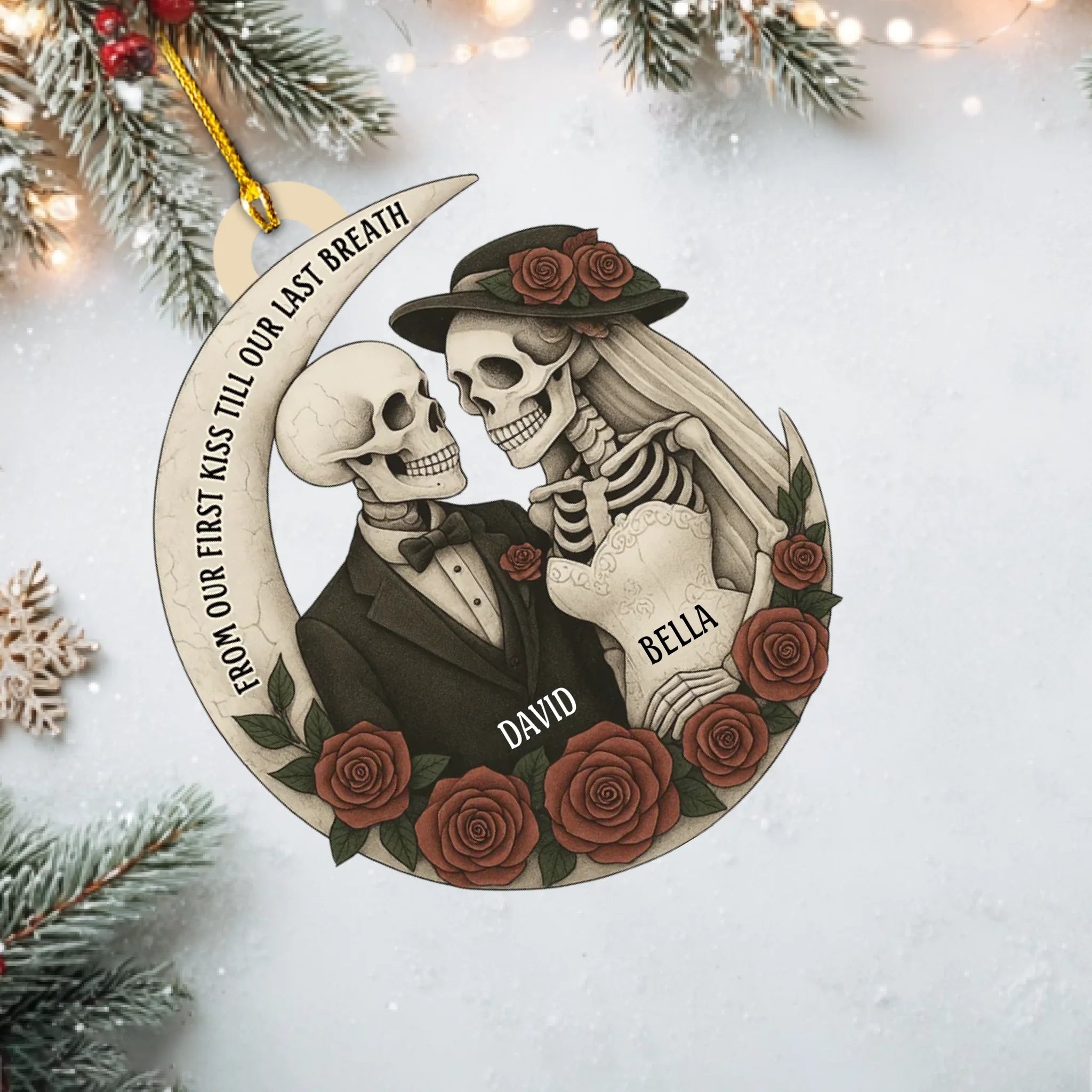 Personalized “Love Till The End” Wooden Ornament – Custom Couple Skull Decoration | Gothic Romantic Gift for Him & Her