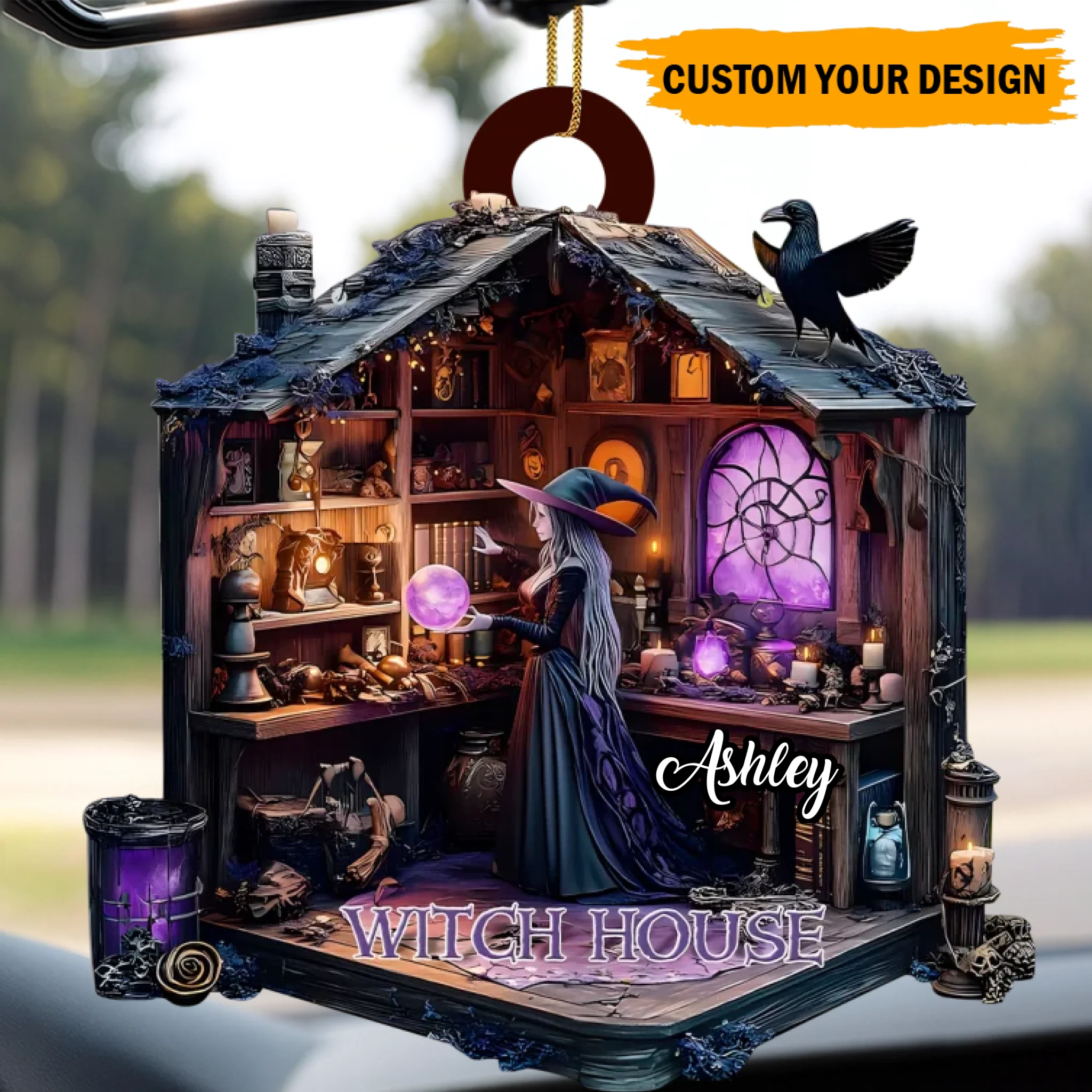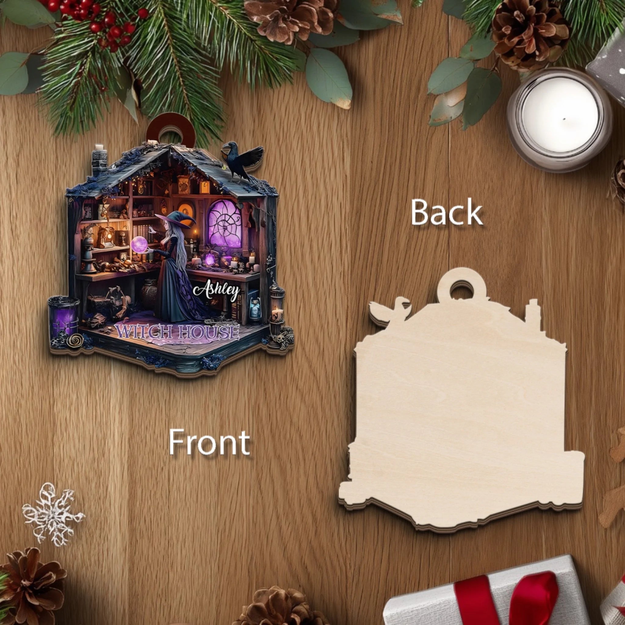 Adéntrate en el mundo de la magia y el misterio con nuestro Adorno de madera personalizado de la Casa de la Bruja — una pieza impresionante que captura la esencia encantadora del escondite de una bruja.