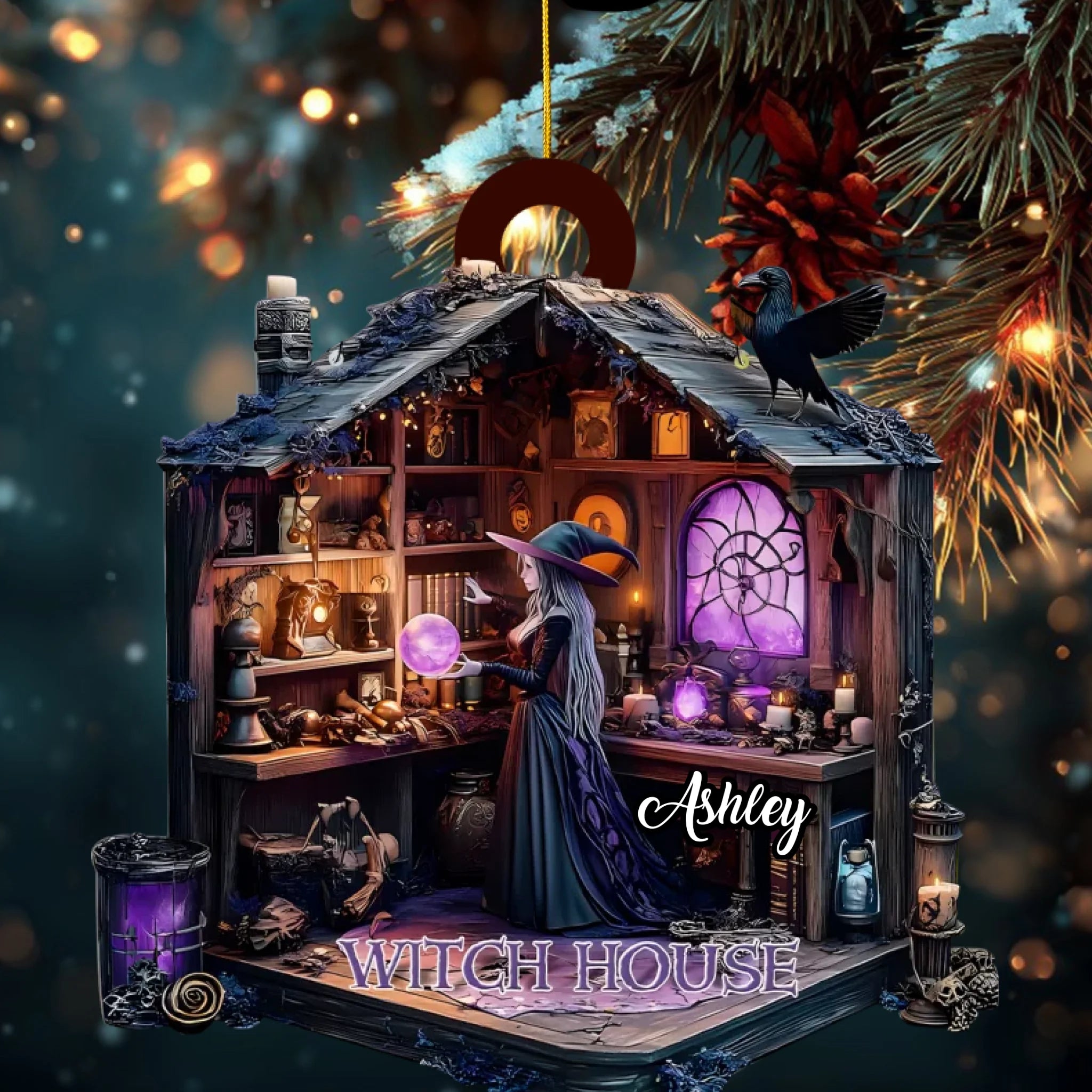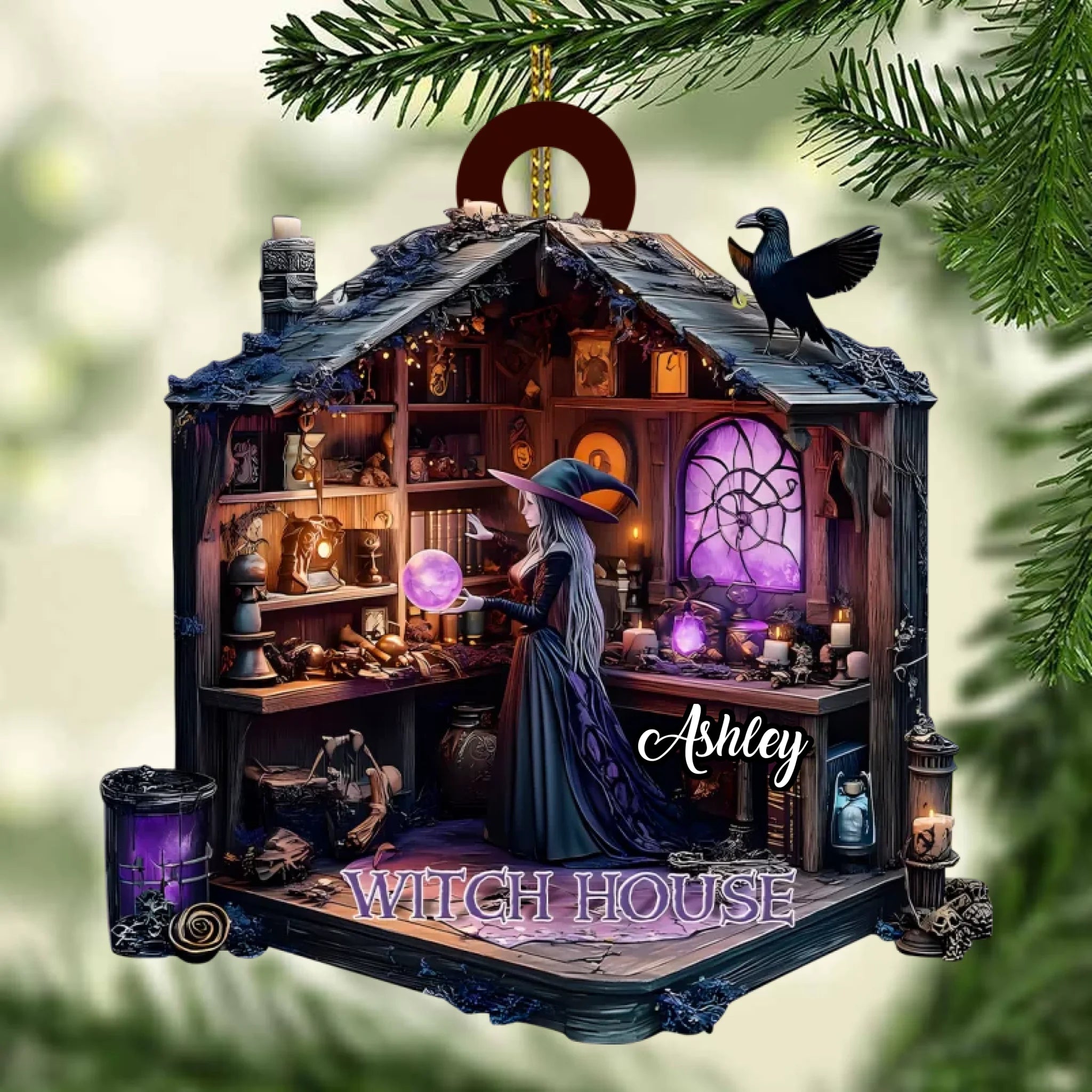 Diseñado bellamente con detalles intrincados — desde pociones brillantes y libros de hechizos hasta velas parpadeantes y un cuervo curioso — este adorno es el complemento perfecto para tu decoración de Halloween, árbol de Navidad, o rincón mágico del hogar.