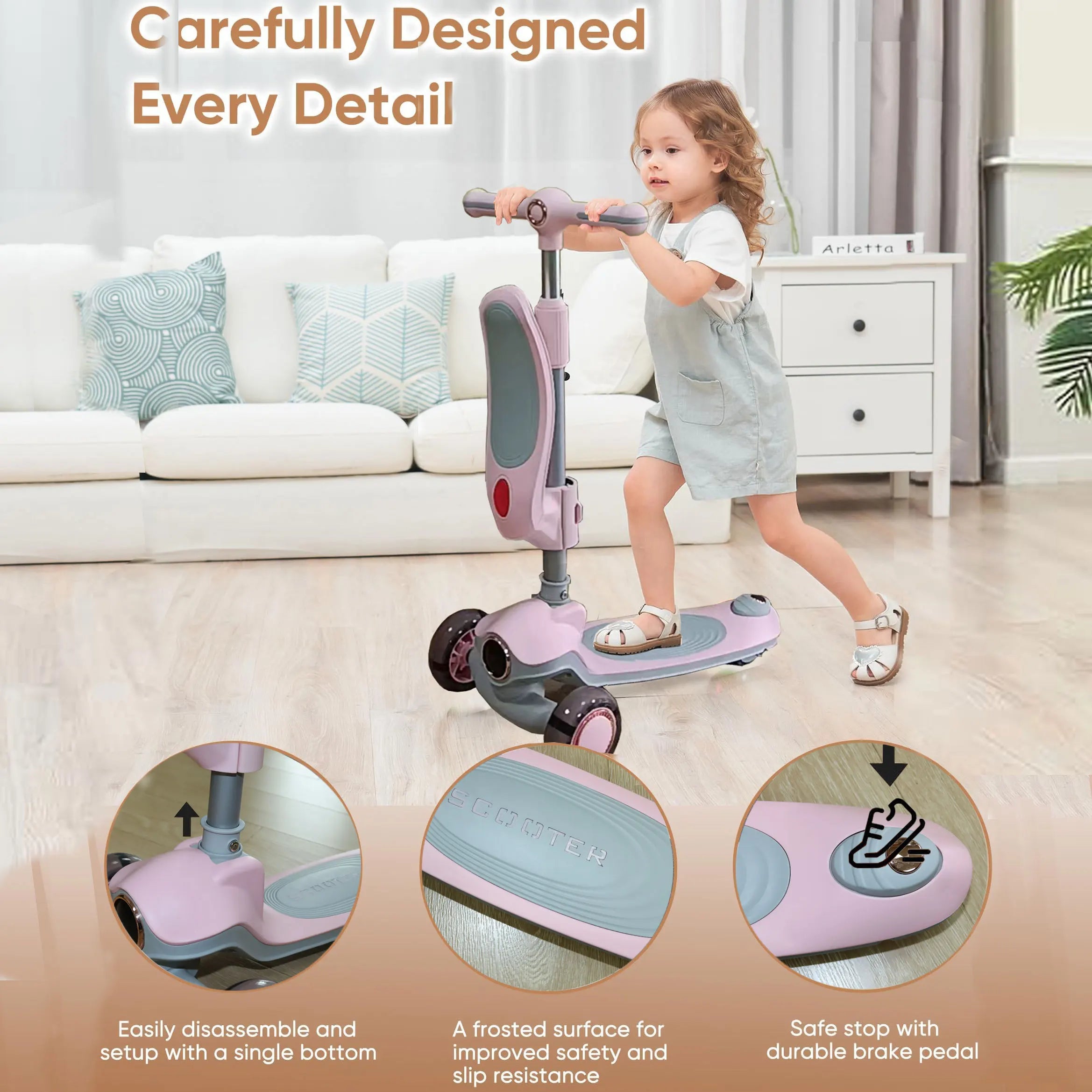 2-in-1 Foldable Kids Scooter with Removable Seat, 5-Level Adjustable Height, LED Light-Up Wheels, and Music Player, Safe Toddler Ride-On for Ages 3–12