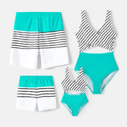 Family Matching Swimwear: Striped One-Piece & Colorblock Trunks, Summer Ready