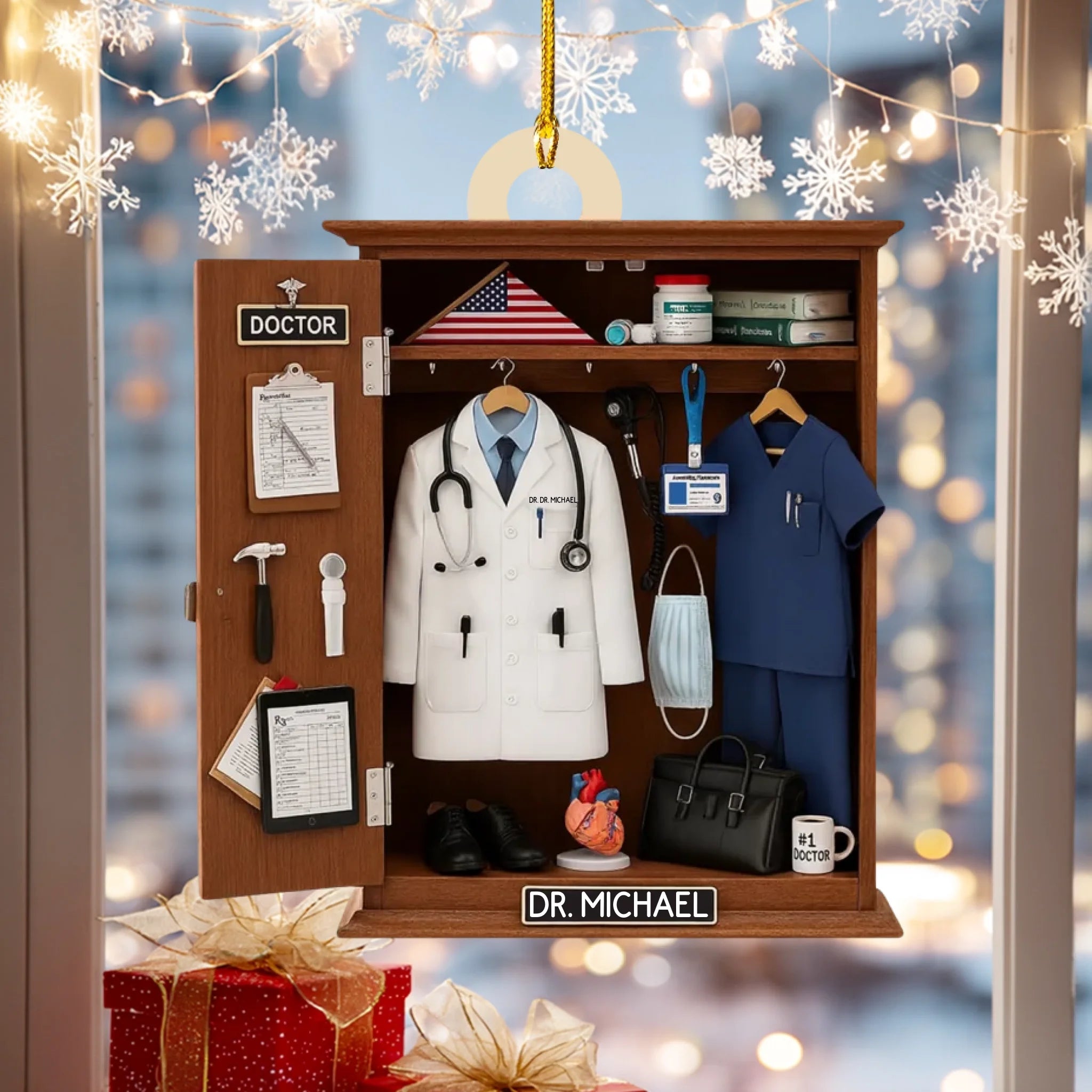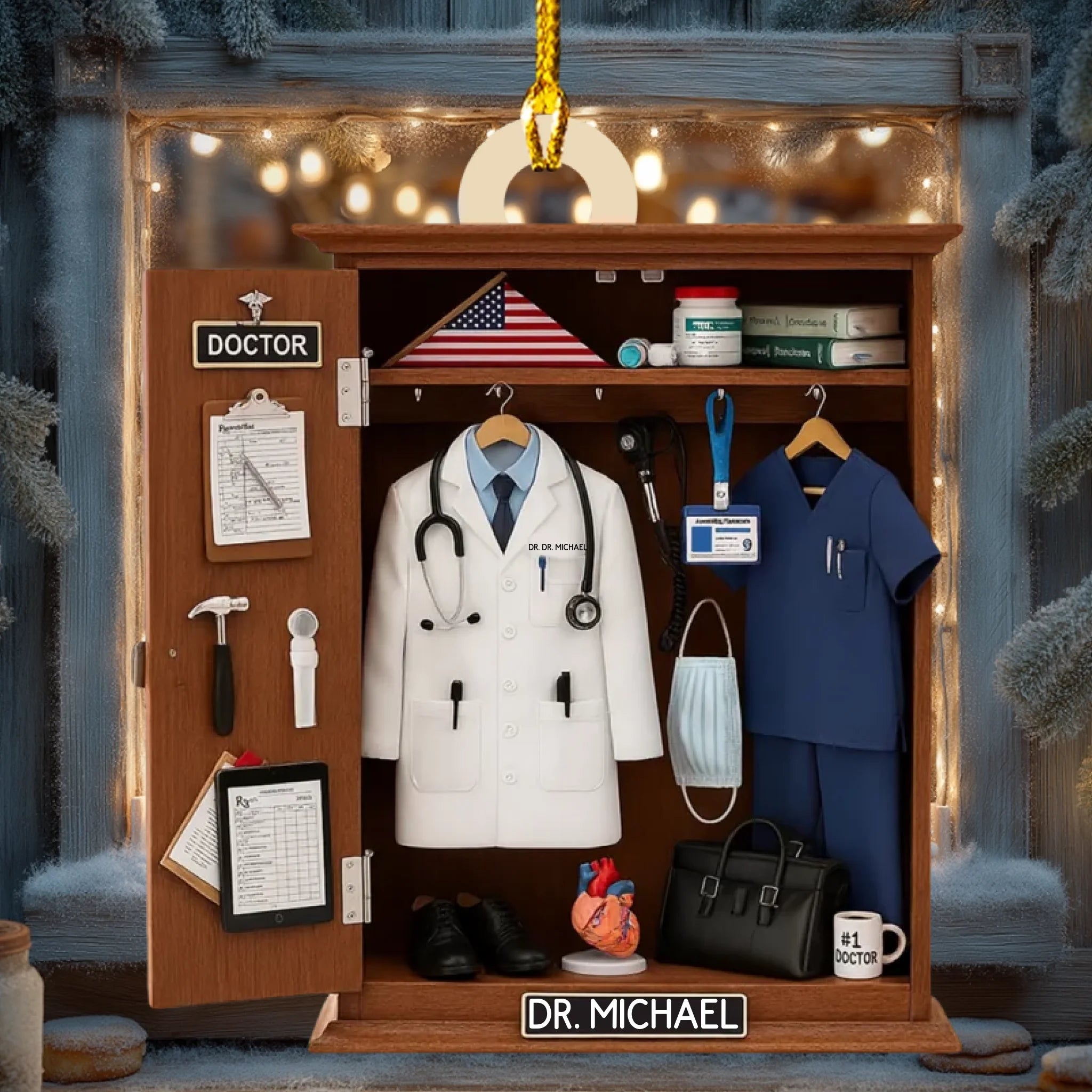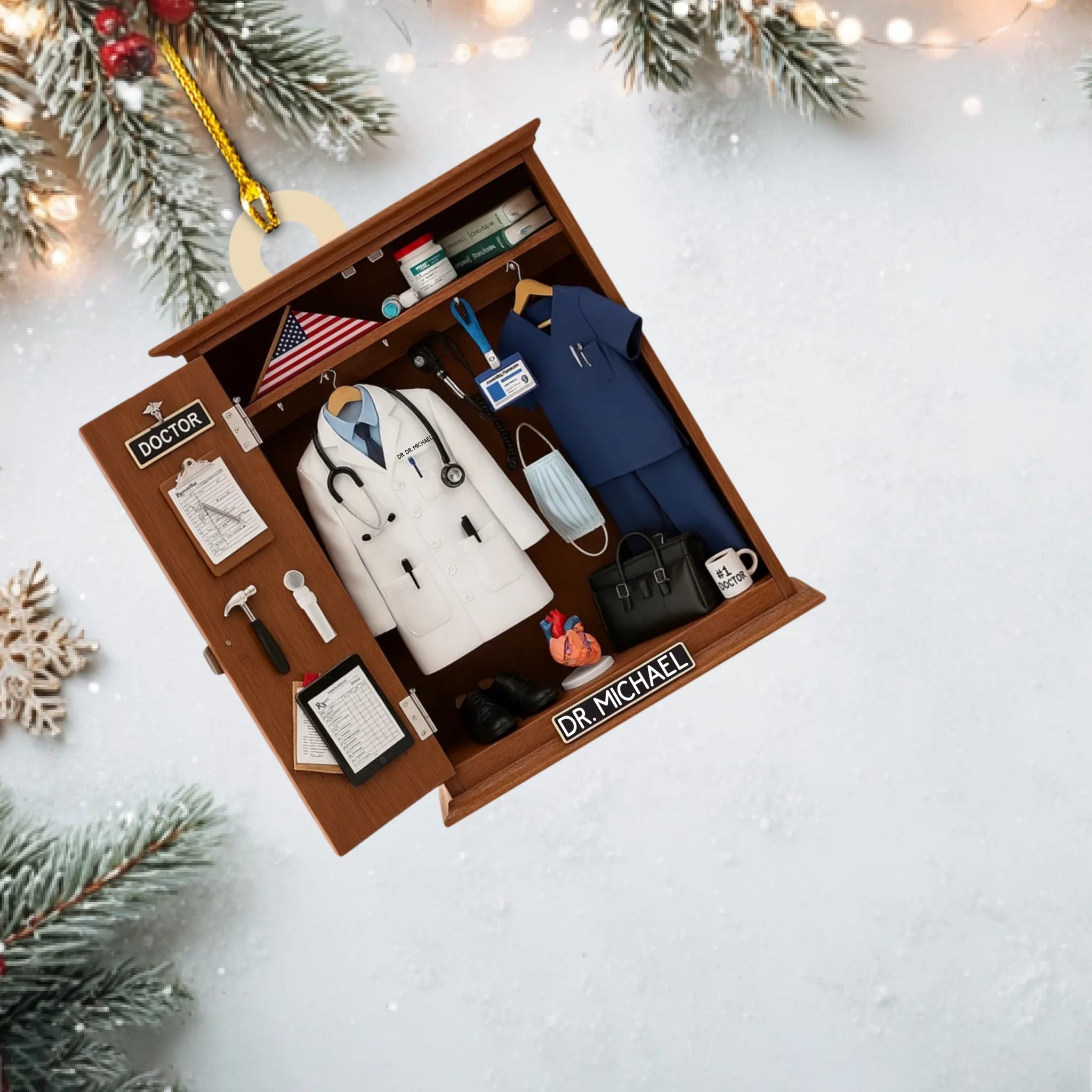 Featuring a realistic locker-style setup — complete with a white coat, stethoscope, scrubs, medical tools, and an American flag — this ornament is the perfect way to honor a doctor, nurse, or healthcare worker. Customize it with your name on the white coat and nameplate, and choose your preferred color theme to create a meaningful keepsake that reflects your medical journey or someone you admire.