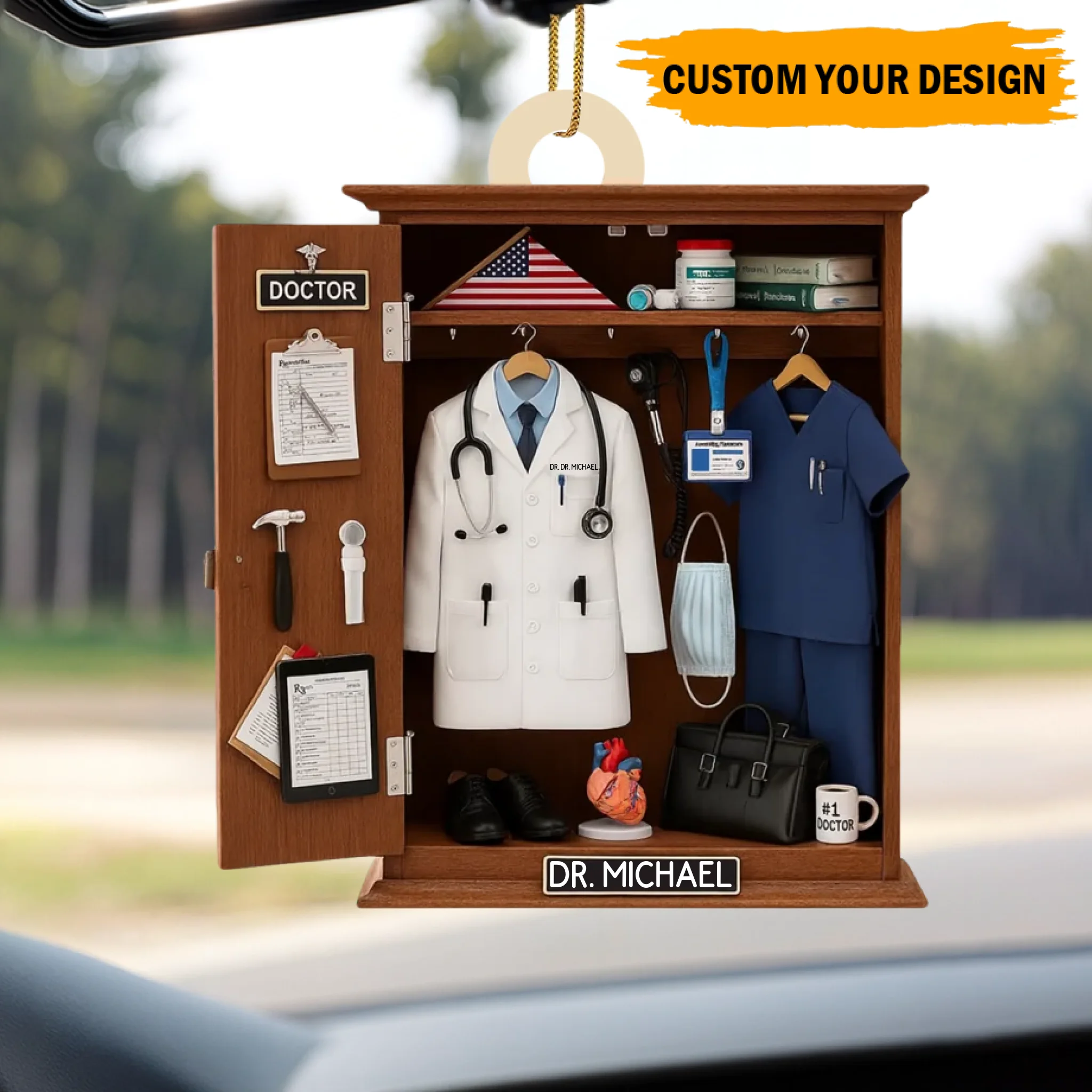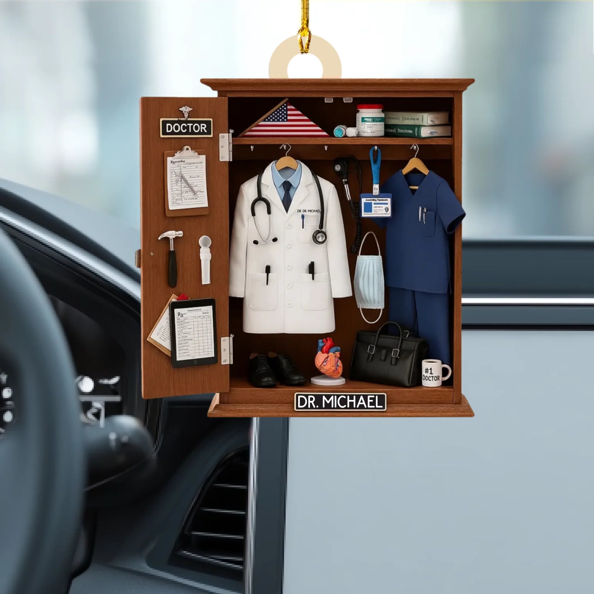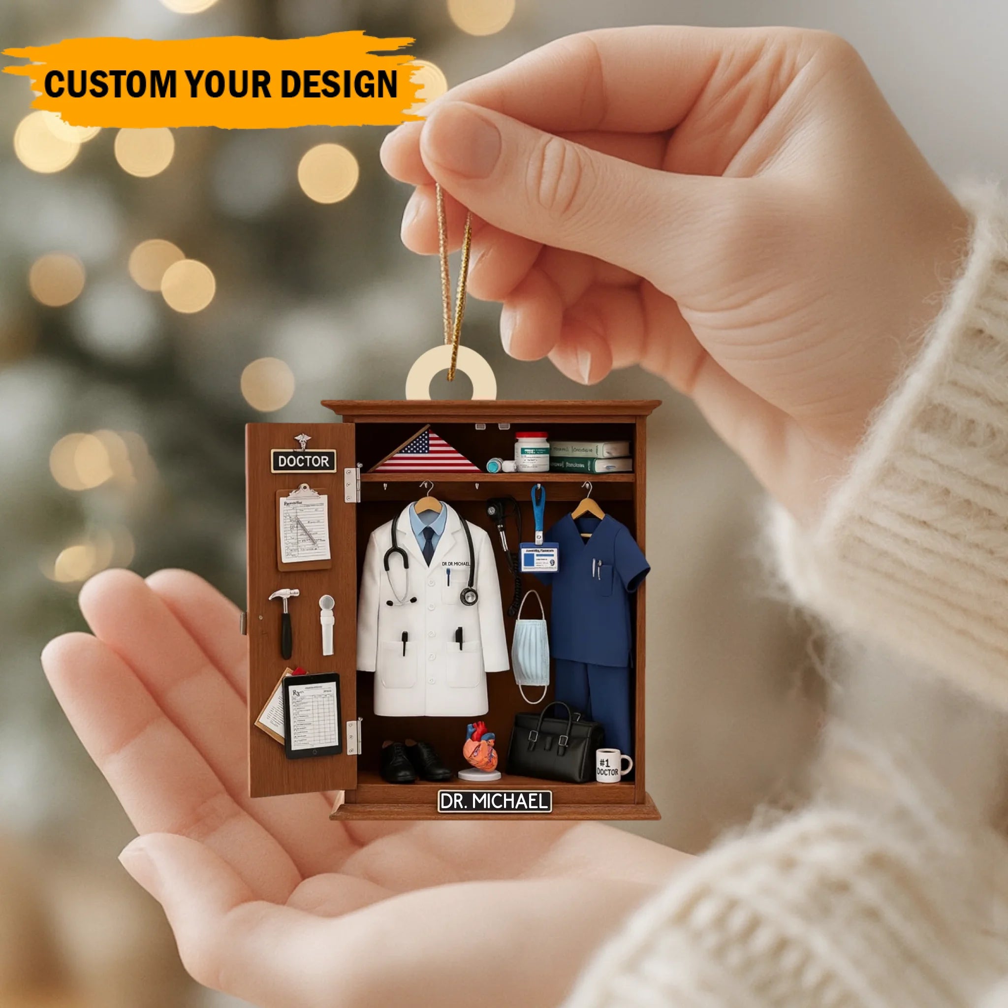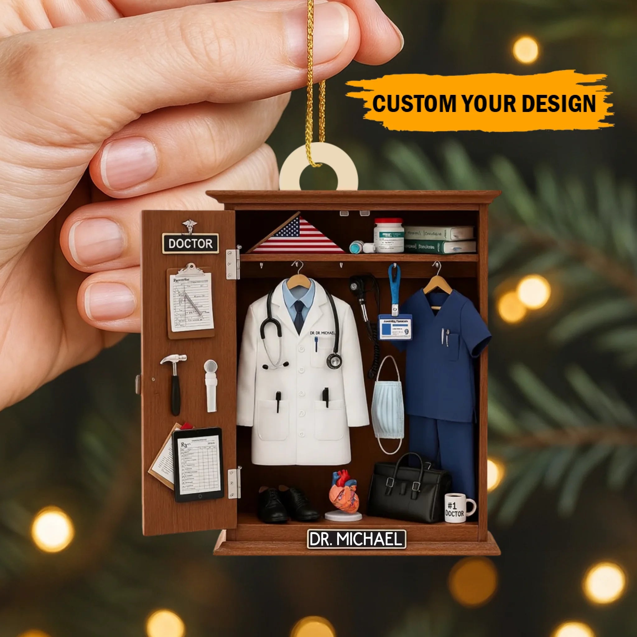 Featuring a realistic locker-style setup — complete with a white coat, stethoscope, scrubs, medical tools, and an American flag — this ornament is the perfect way to honor a doctor, nurse, or healthcare worker. Customize it with your name on the white coat and nameplate, and choose your preferred color theme to create a meaningful keepsake that reflects your medical journey or someone you admire.