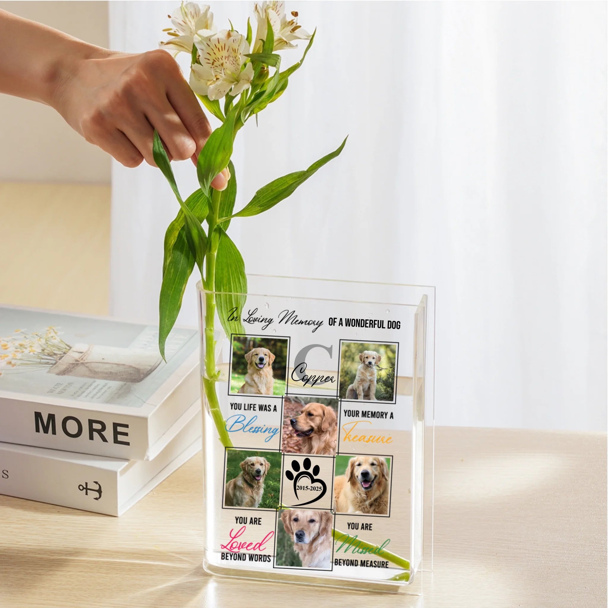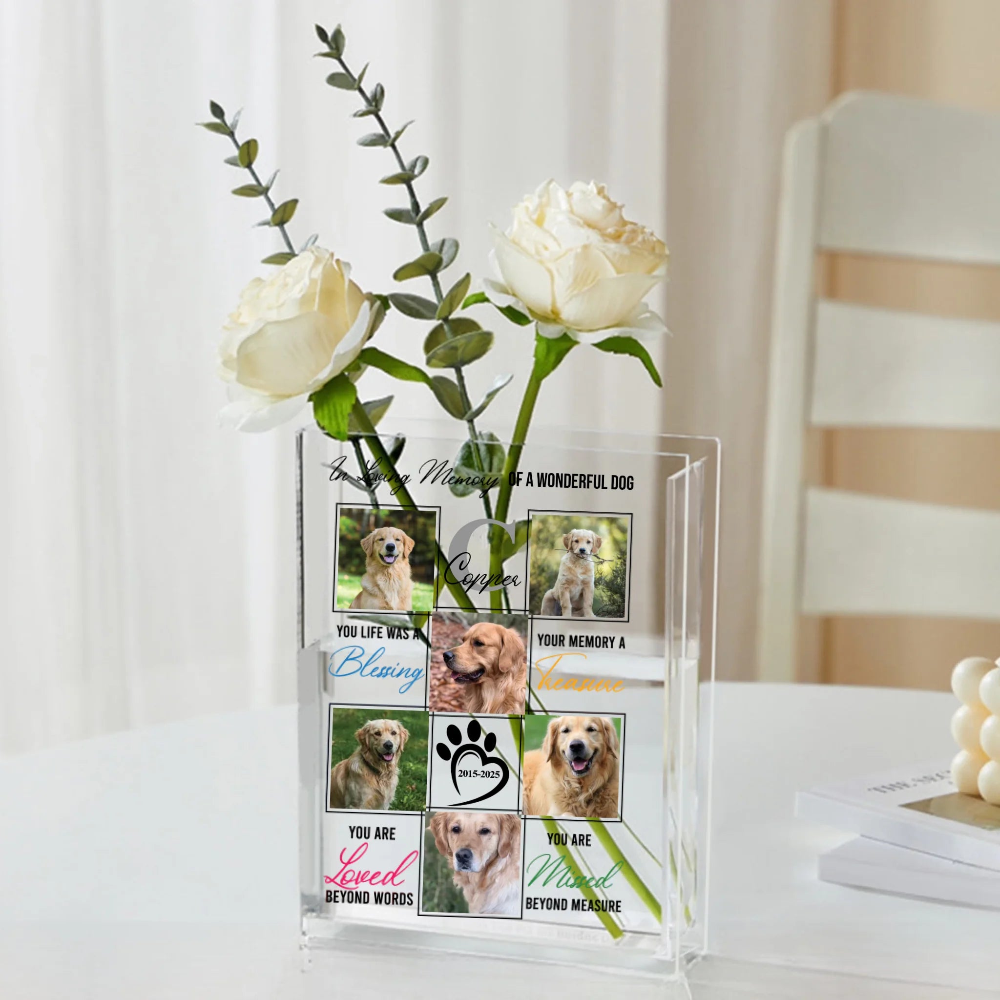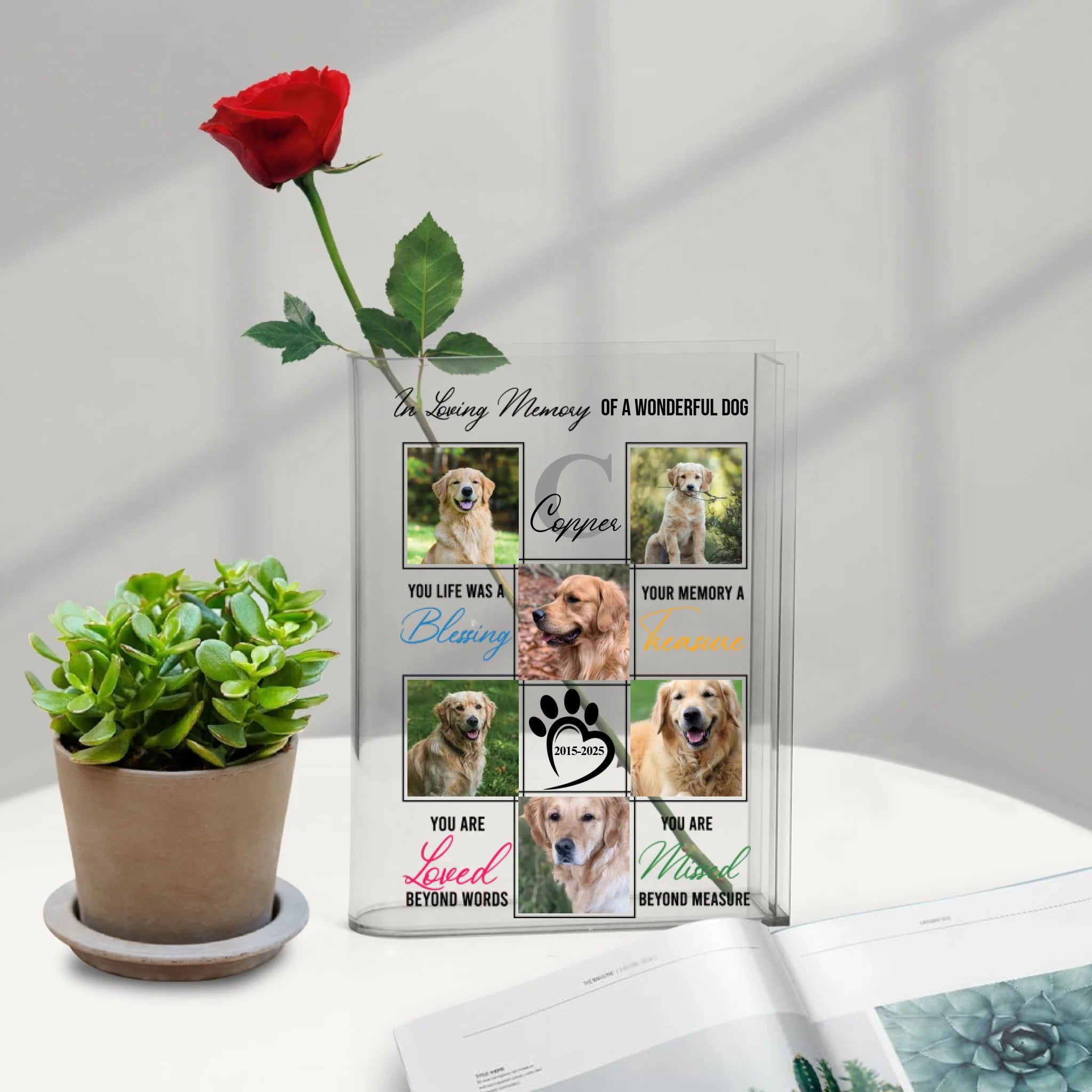 Personalized Dog Memorial Acrylic Book Vase - Custom Photo Collage & Quote Keepsake - Unique Pet Loss Sympathy Gift
