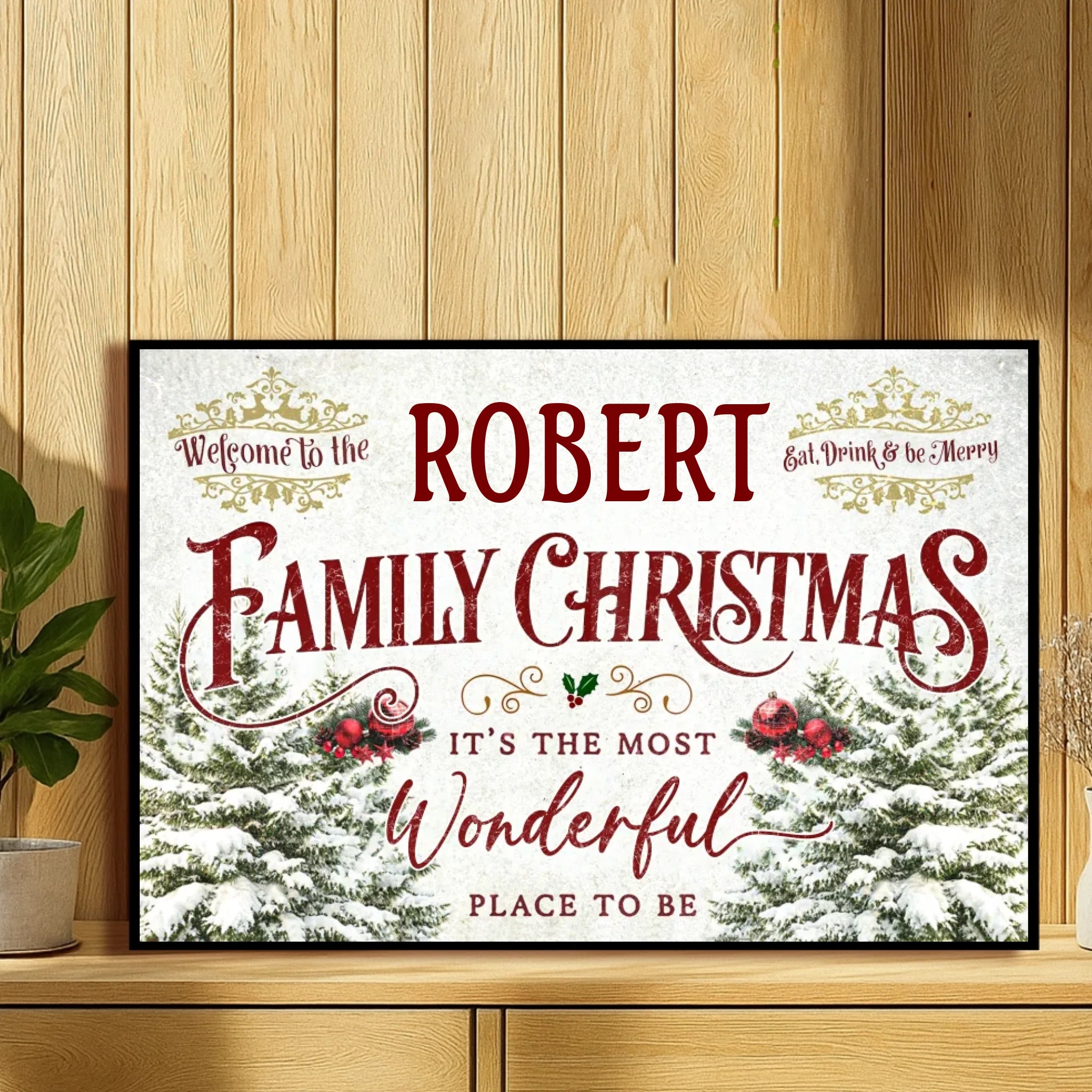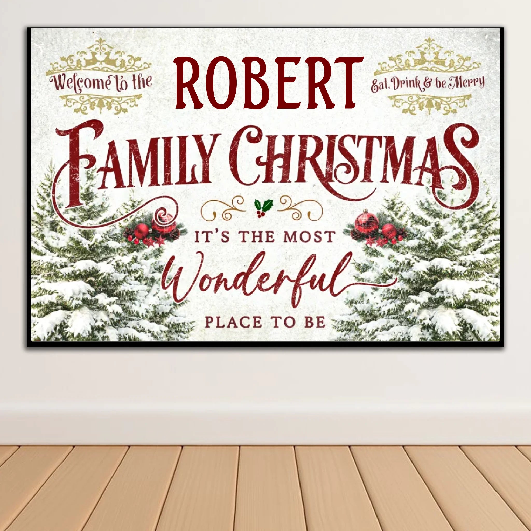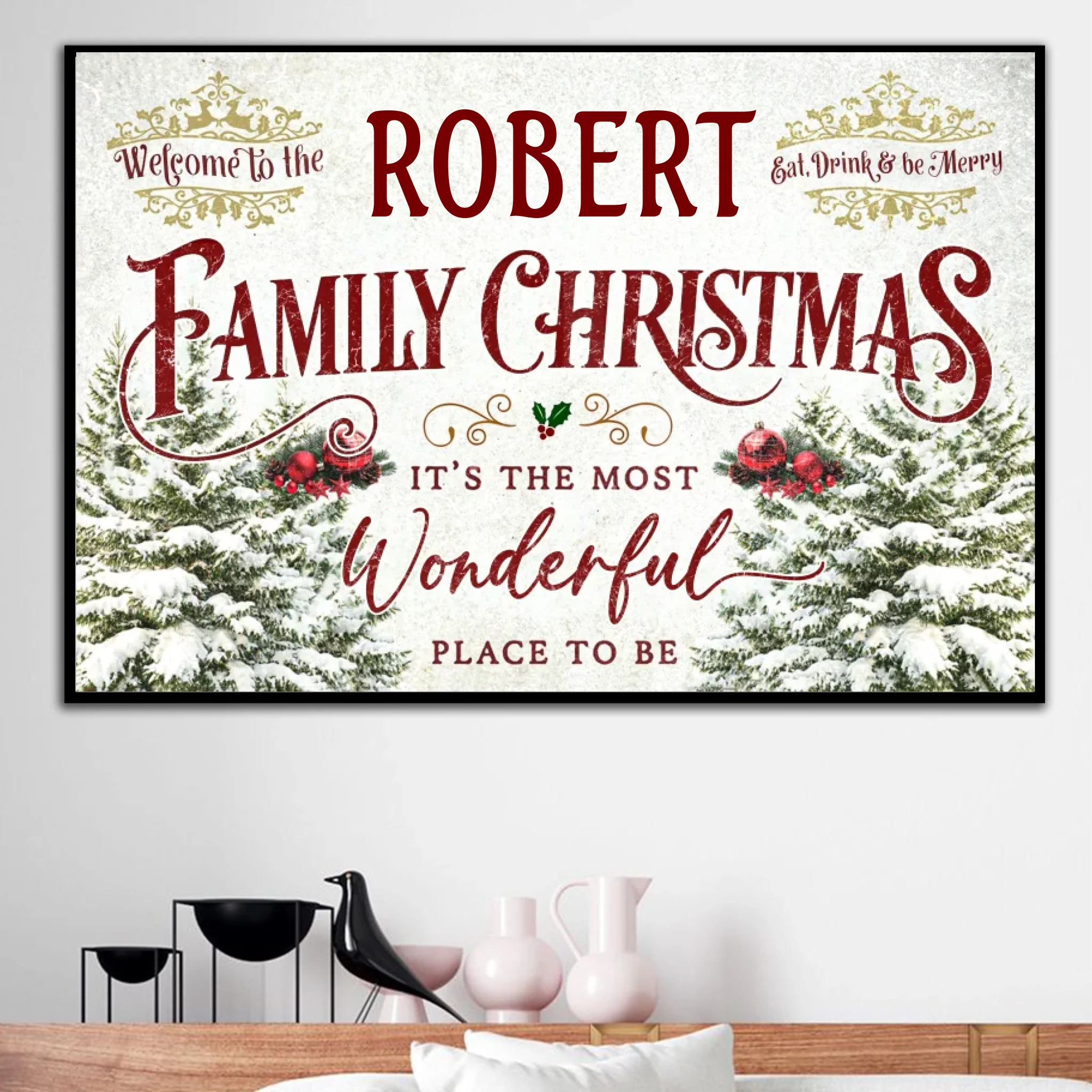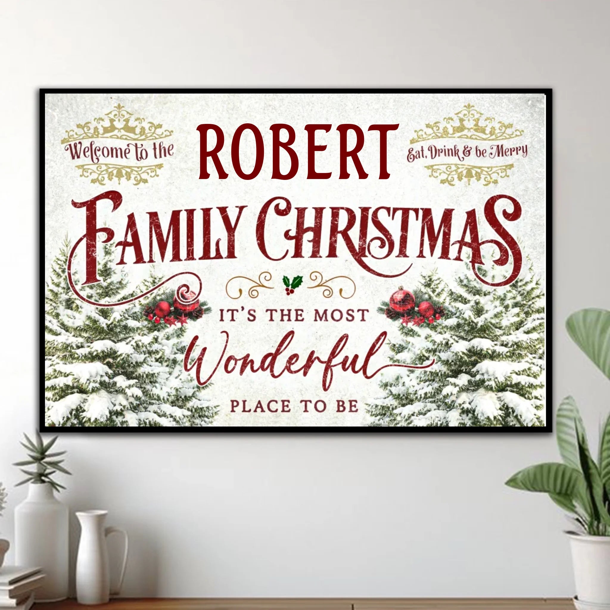 Featuring a cozy festive design with pine trees, snowflakes, and elegant typography, this poster transforms any room into a cheerful holiday haven. Add your family name to make it truly yours — a perfect way to greet guests with warmth and Christmas spirit!