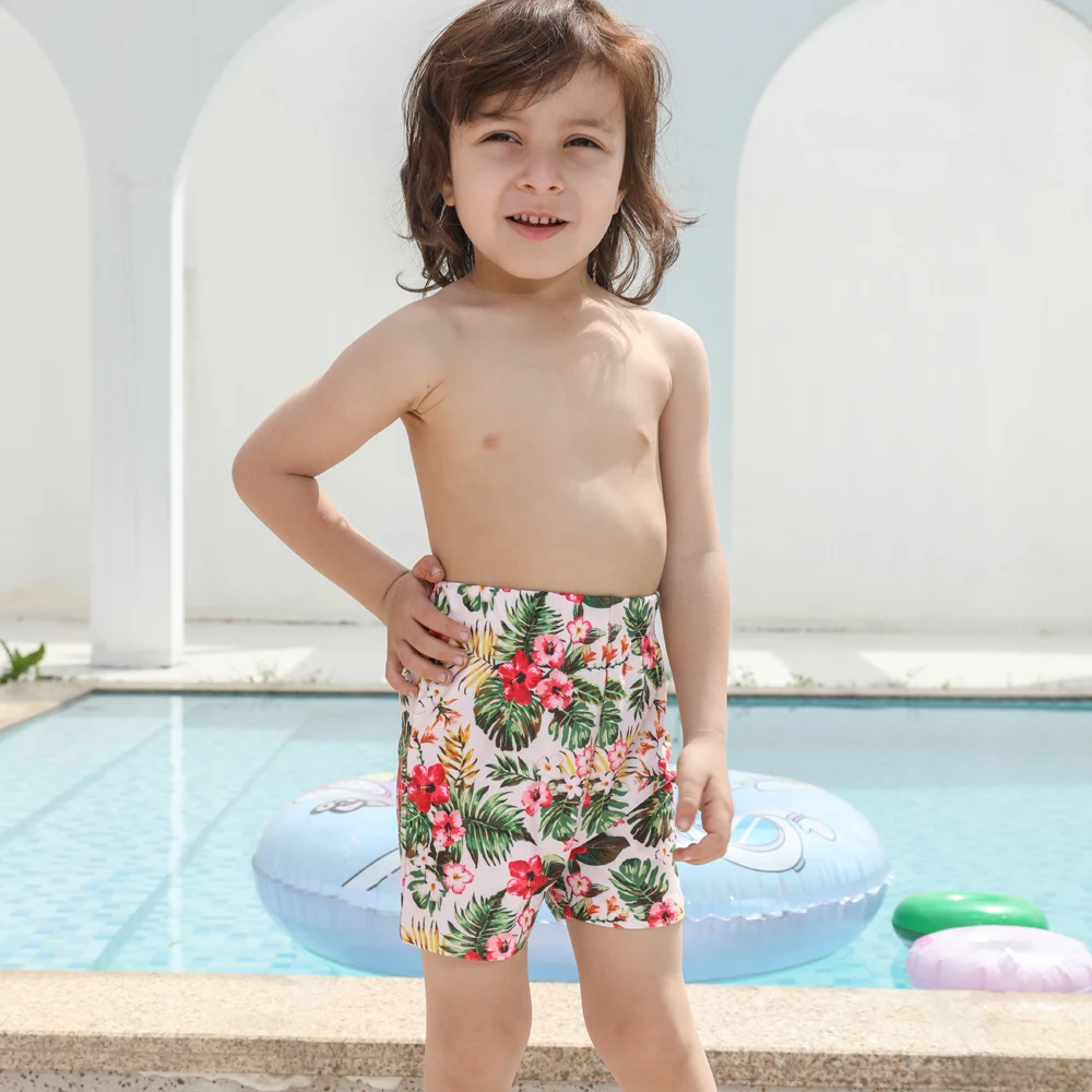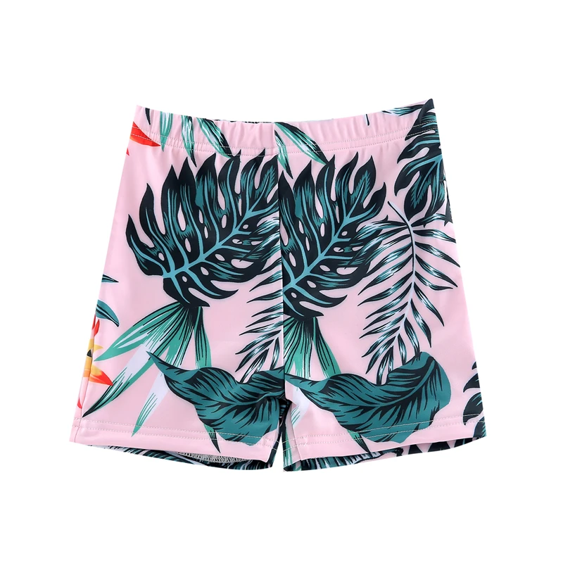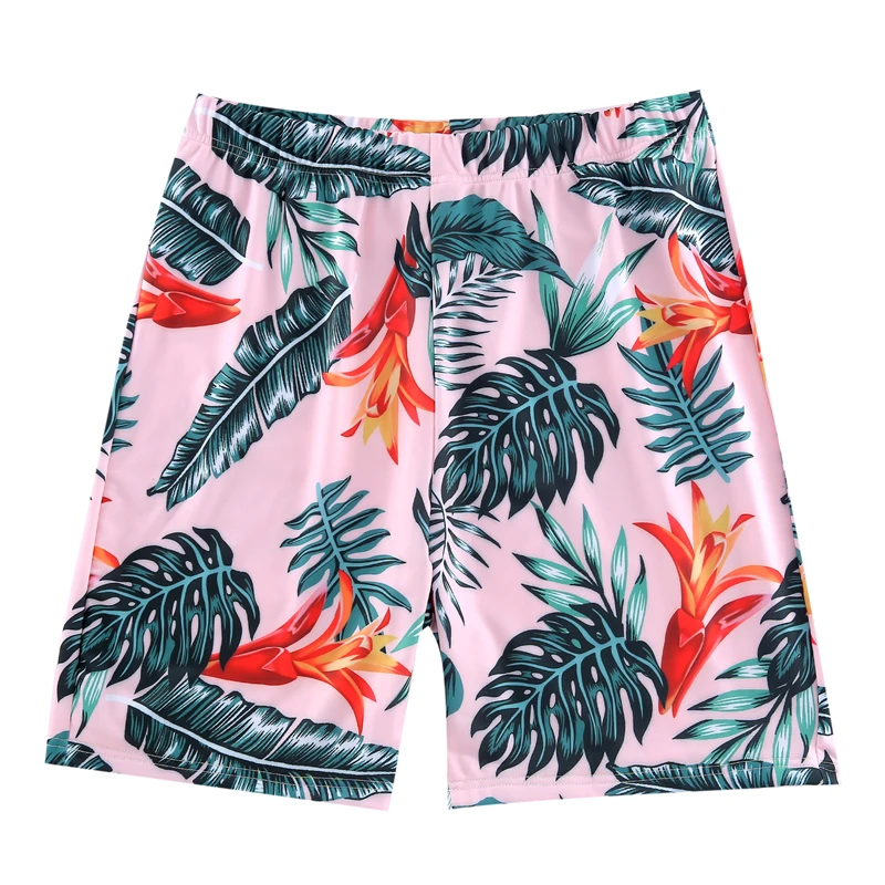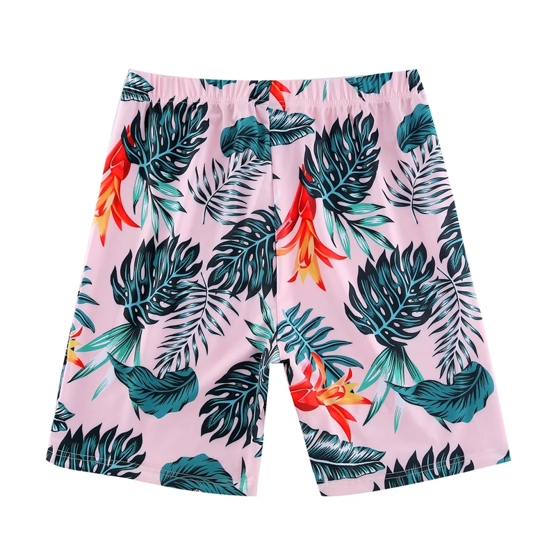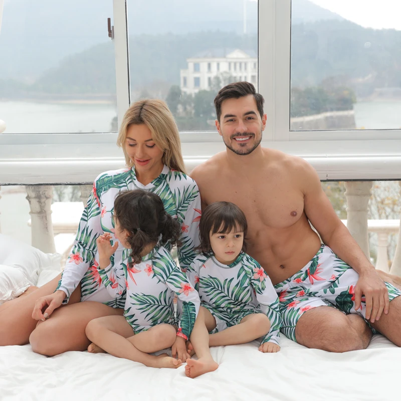Family swimwear set with enough members: father, mother, son, daughter with gentle colors to create a special for the family when appearing at the pool or going to the beach.