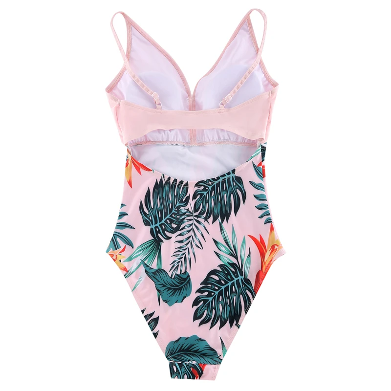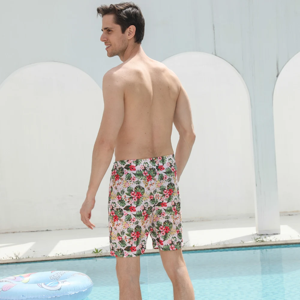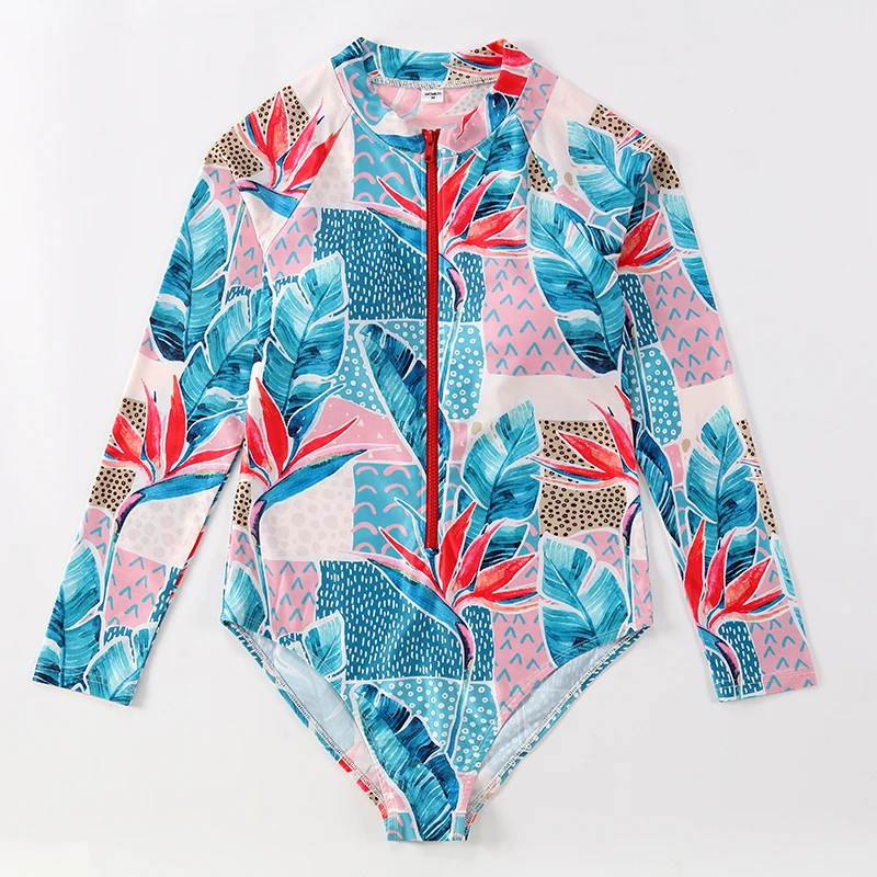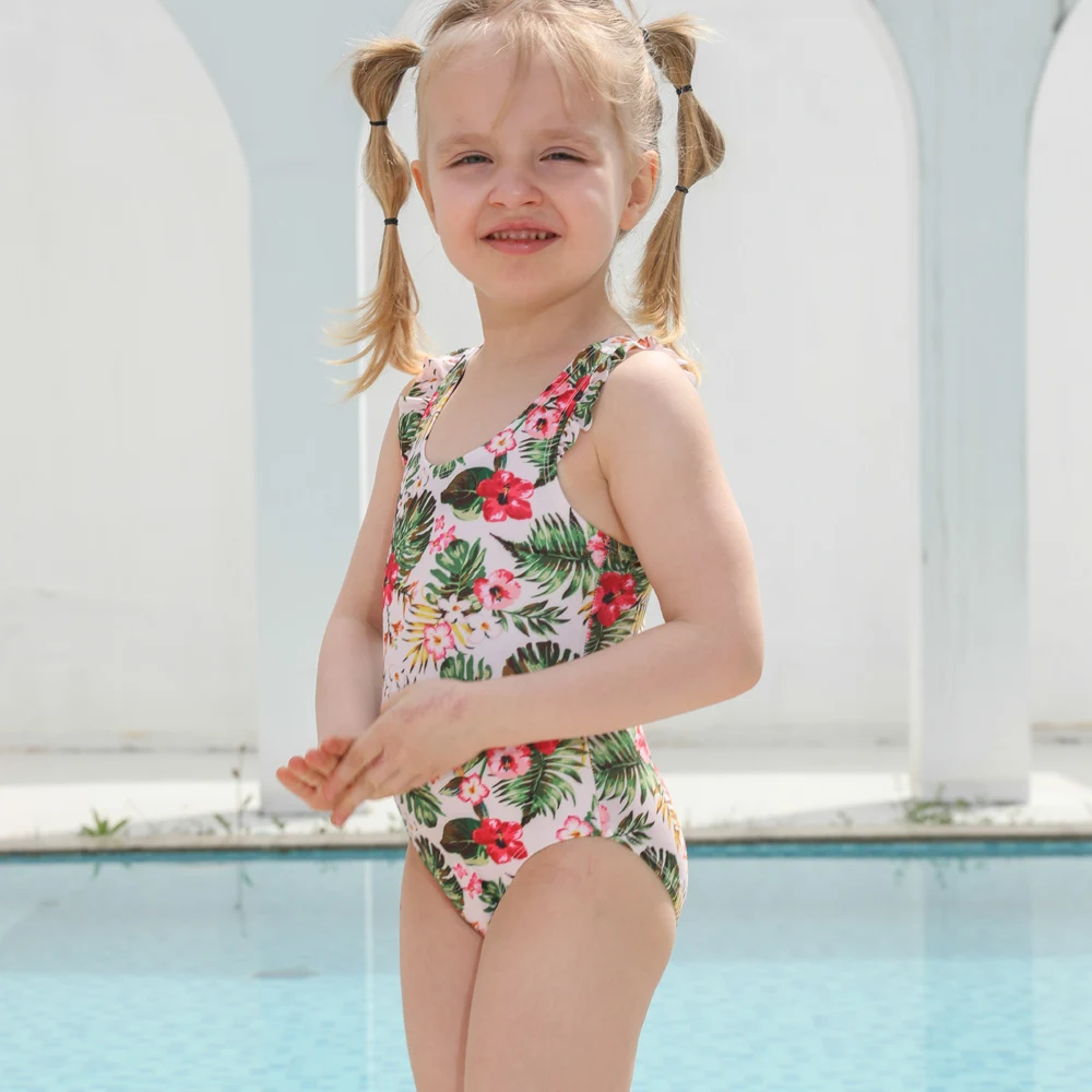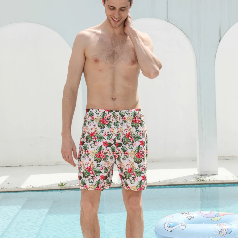 Family swimwear set with enough members: father, mother, son, daughter with gentle colors to create a special for the family when appearing at the pool or going to the beach.